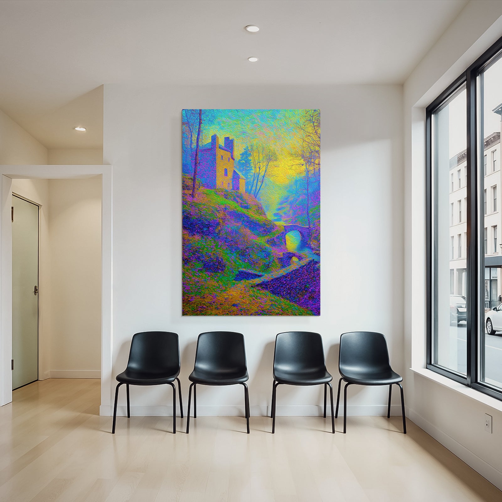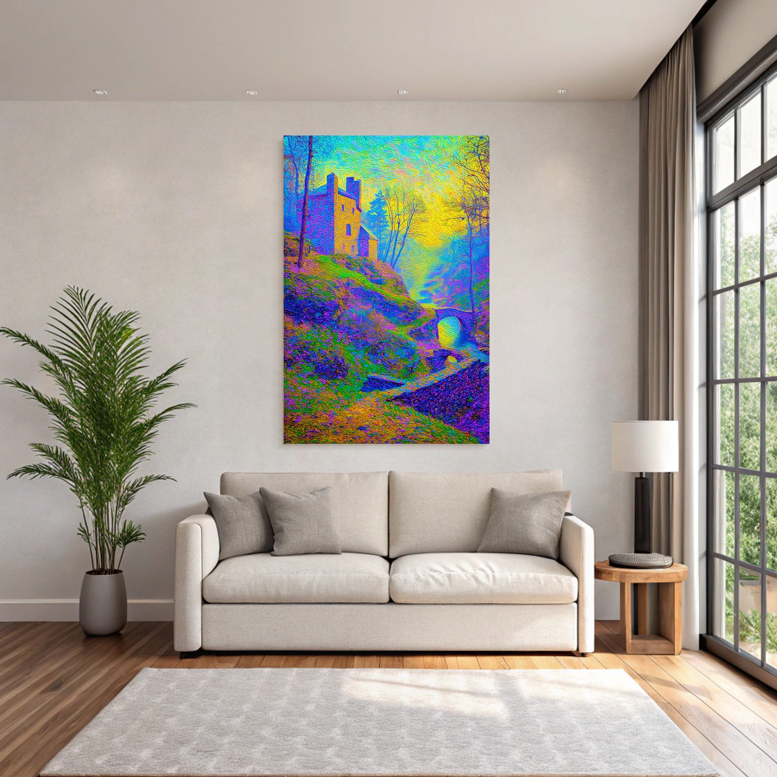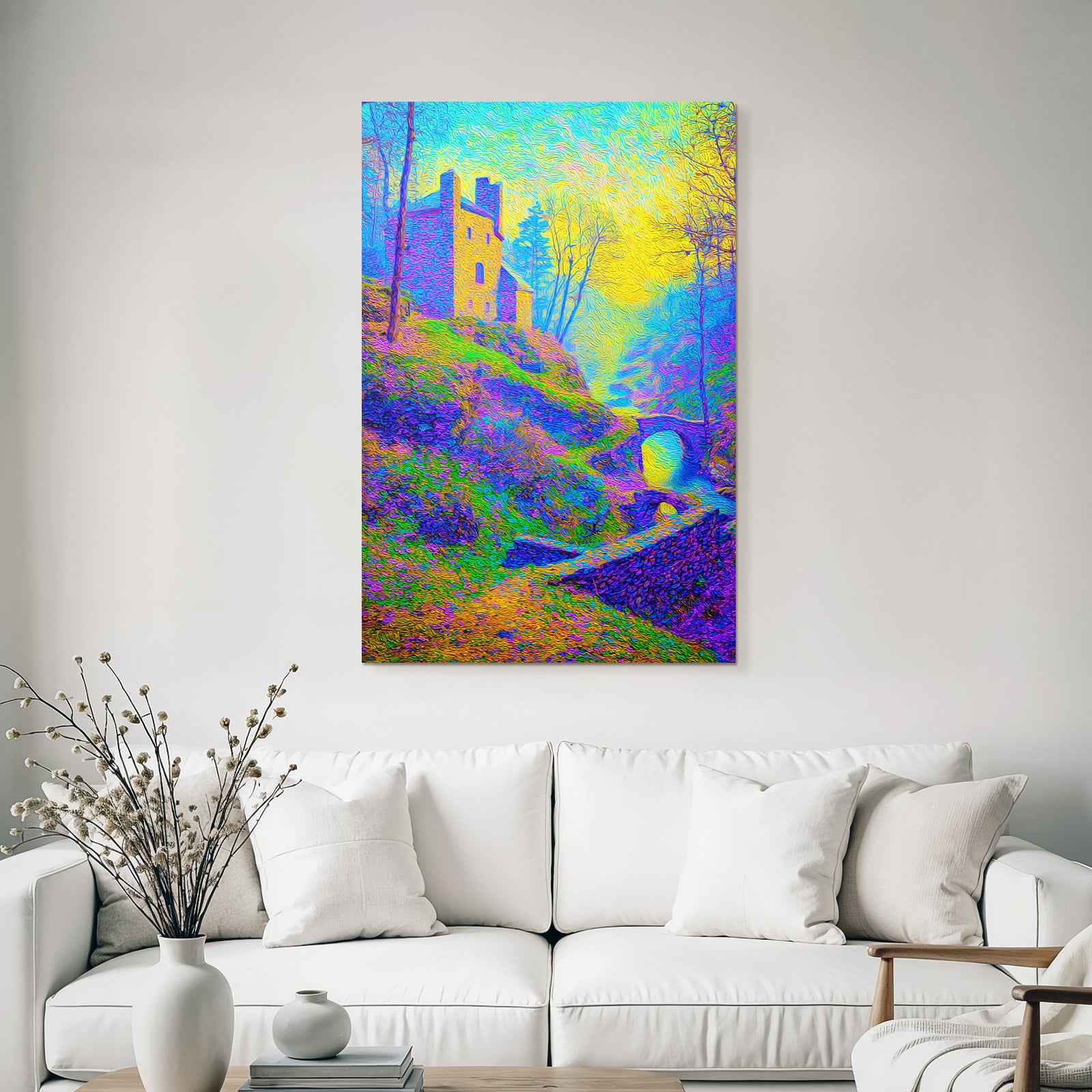 Mit dem Werk „Schlosslandschaft Mit Brücke Und Bach“ im Stil Expressionismus gestaltest Du Dein Wartezimmer oder Deine Hotel-Lobby eindrucksvoll und modern – auf Stoff im FameFrame™.