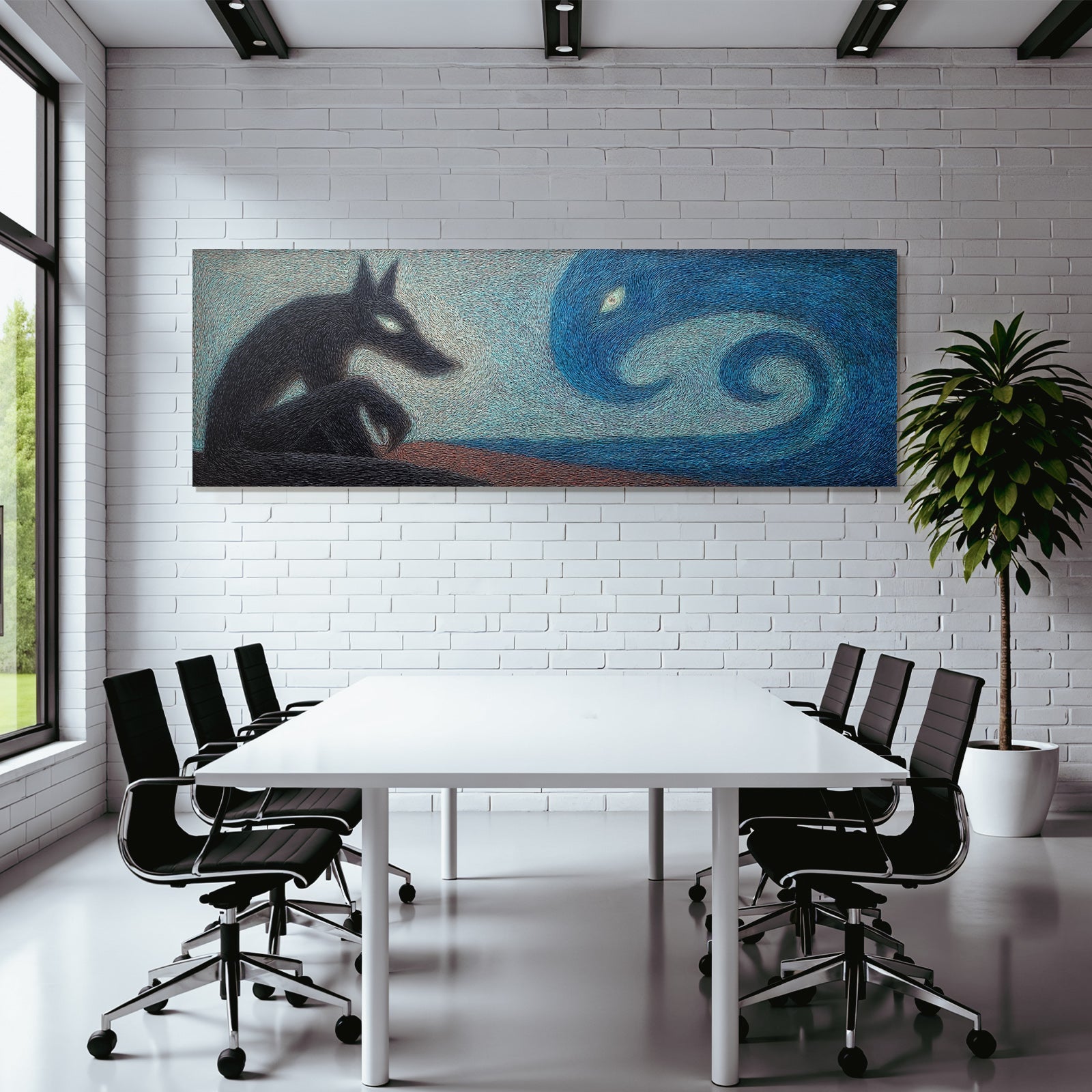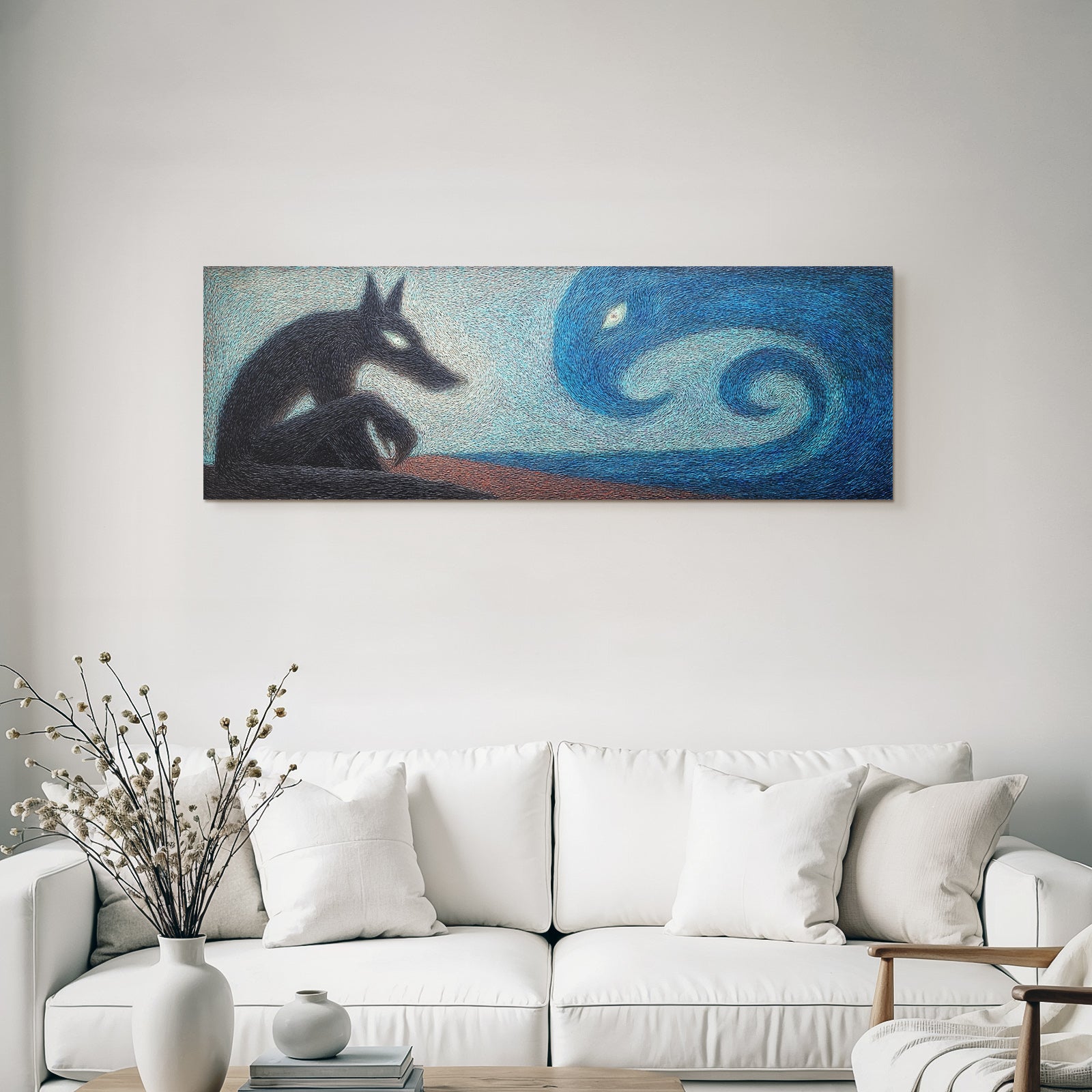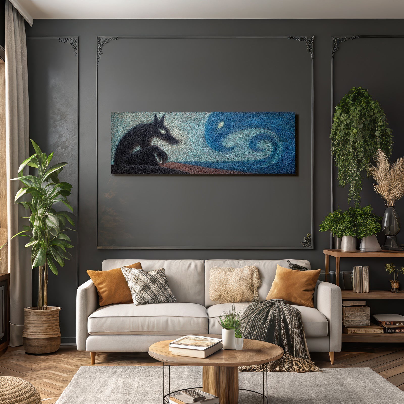 Spüren Sie die Energie von „Wolfskontur Vor Blaüm Strudelhintergrund“. Die dynamische Komposition im Stil Expressionismus wird durch die matte Oberfläche des Textildrucks im FameFrame™ besonders intensiv.