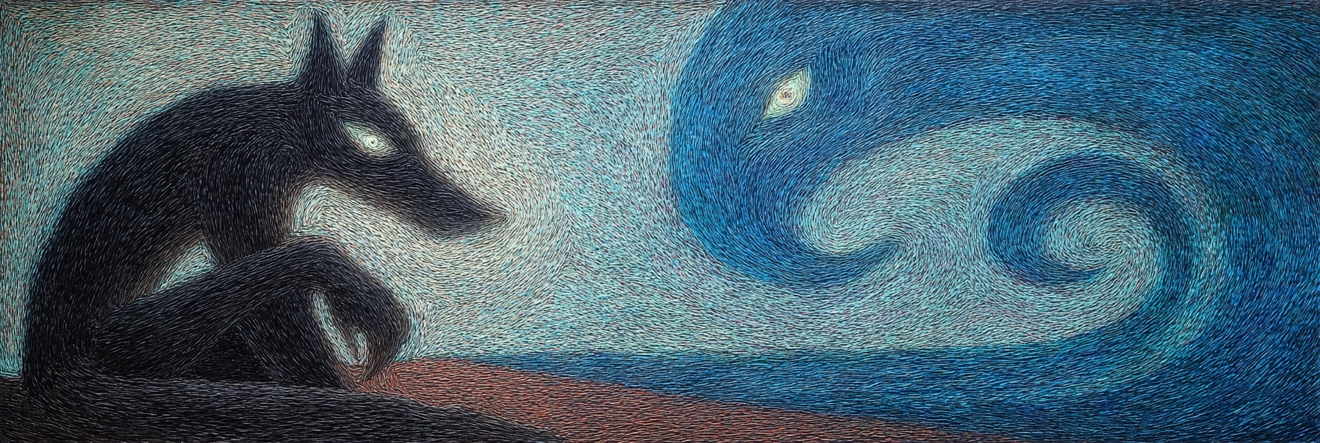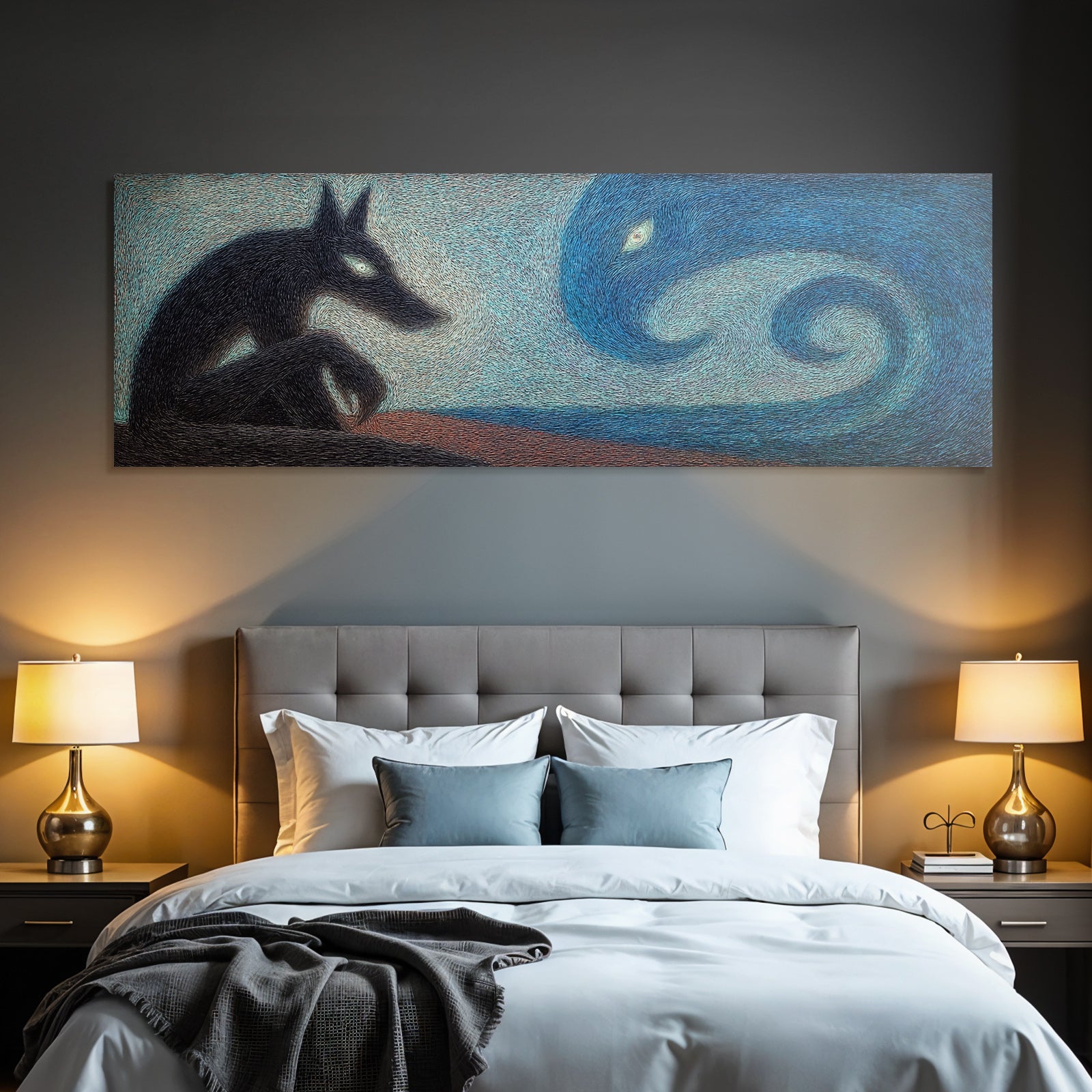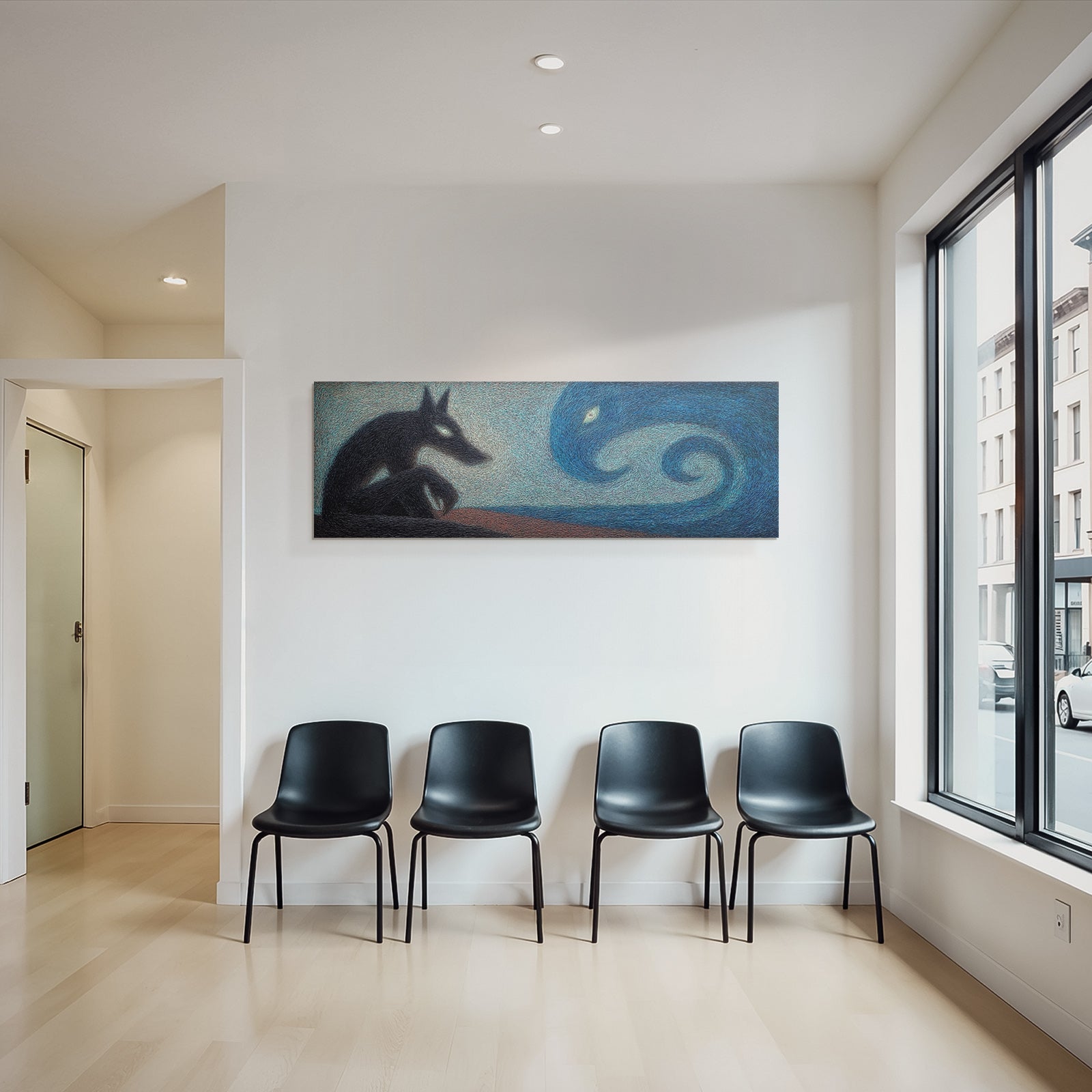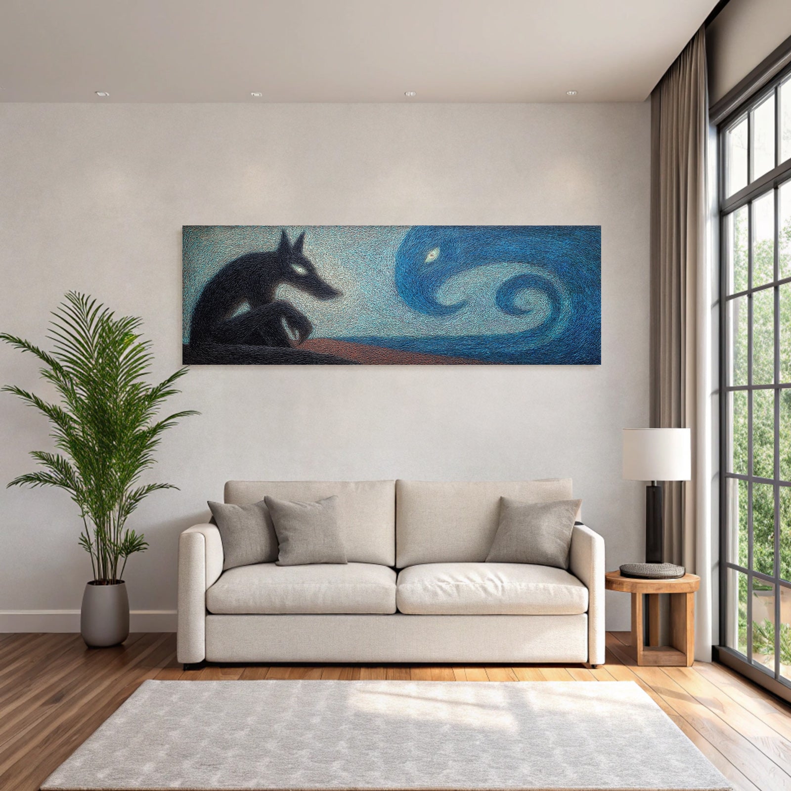 Spüren Sie die Energie von „Wolfskontur Vor Blaüm Strudelhintergrund“. Die dynamische Komposition im Stil Expressionismus wird durch die matte Oberfläche des Textildrucks im FameFrame™ besonders intensiv.