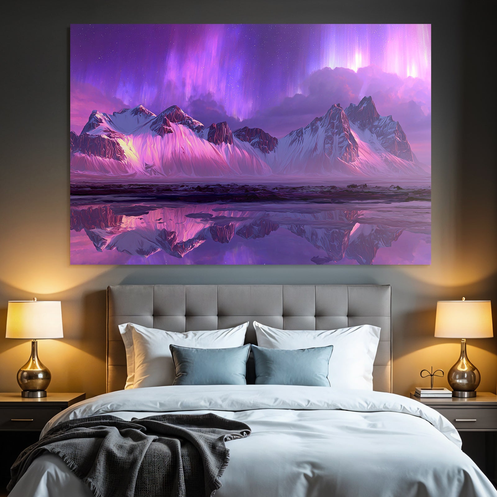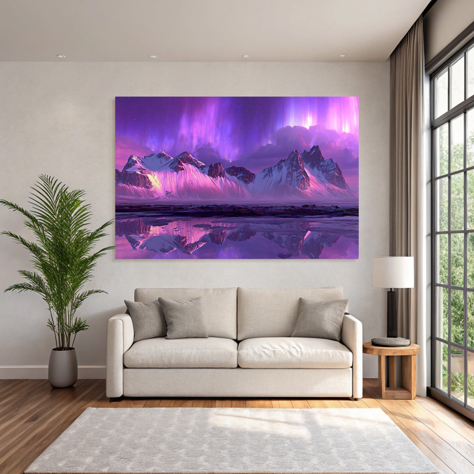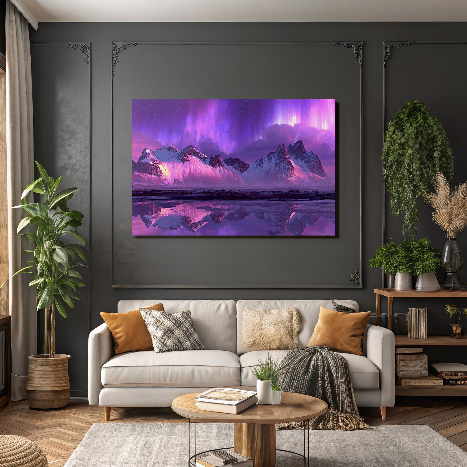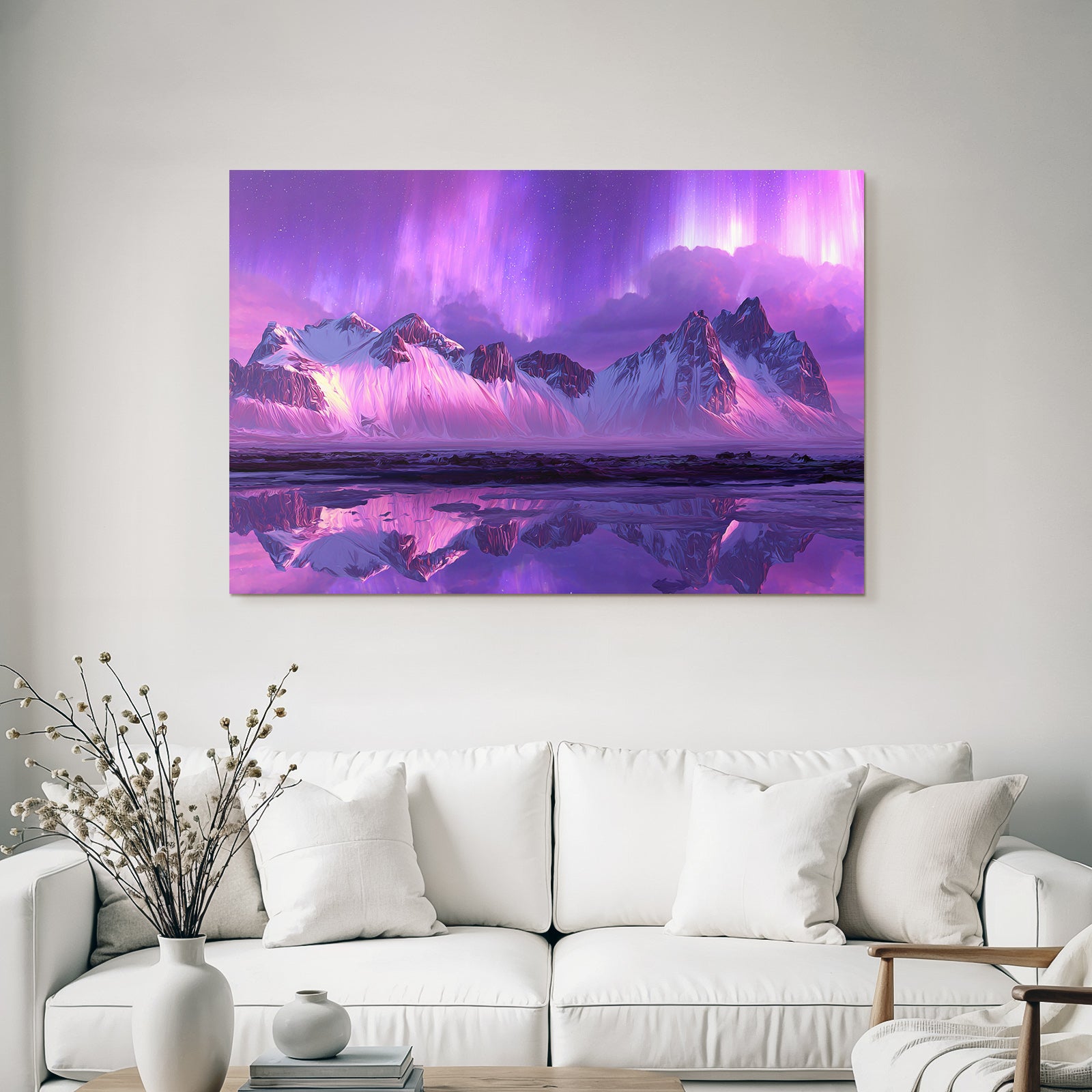 Das Motiv „Polarlicht Schneebedeckte Berge Mit Purpur Auroren Reflexion Im Wasser“ ist ein Highlight der Kollektion Fjorde und Gletscher und wird auf Deinem FameFrame™ brillant in Szene gesetzt.