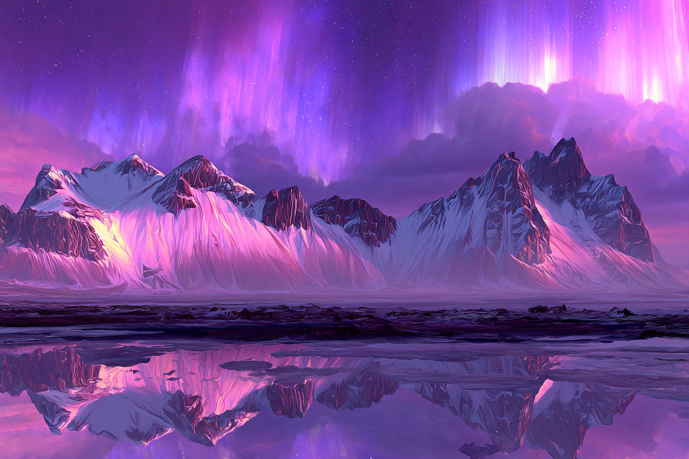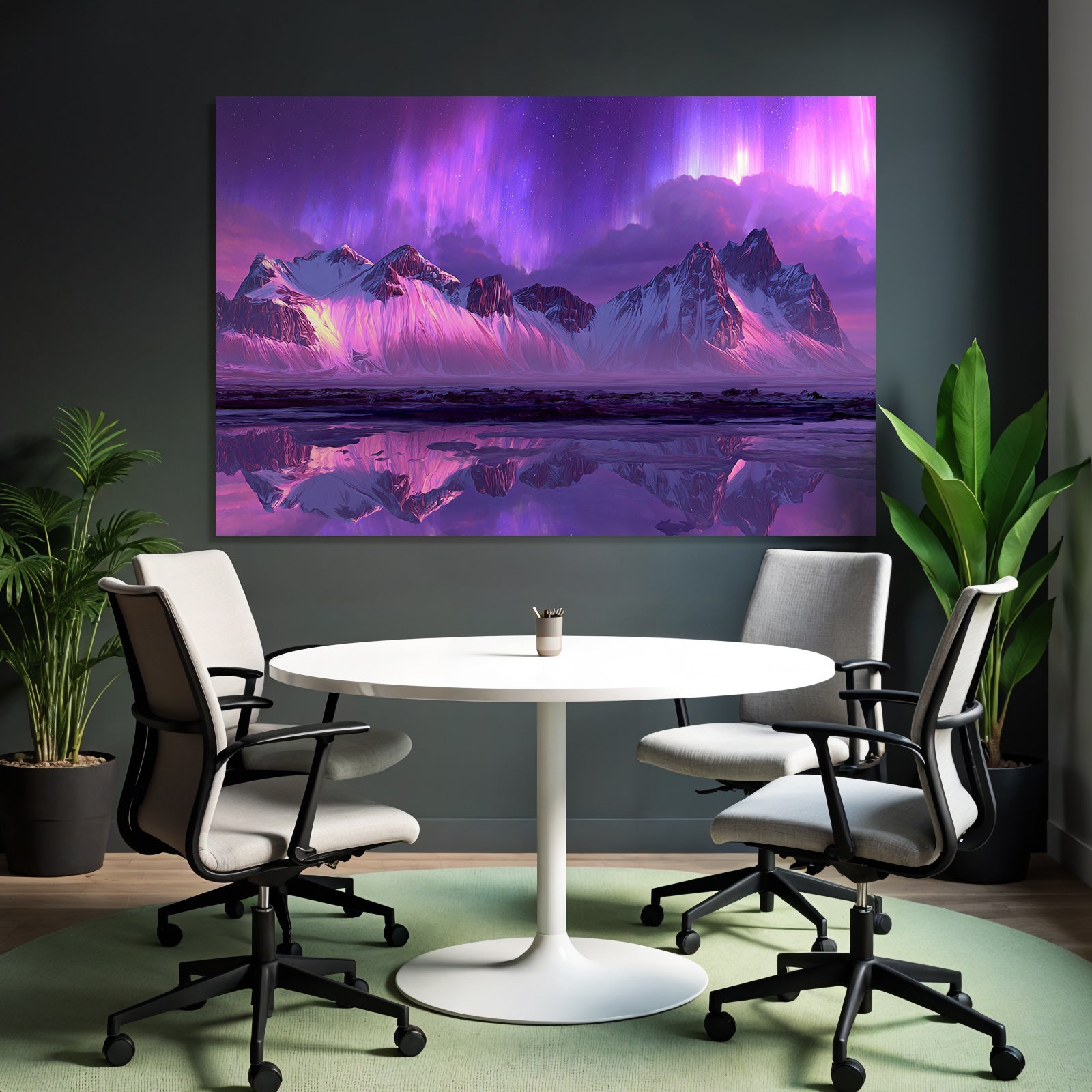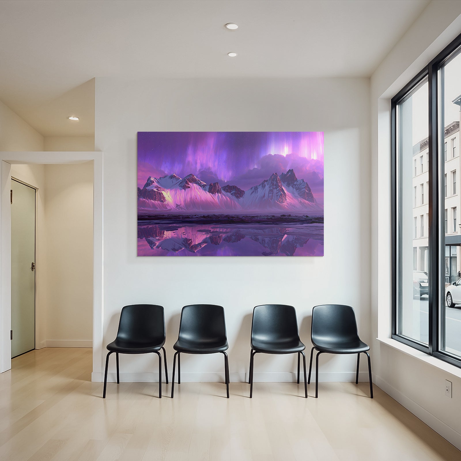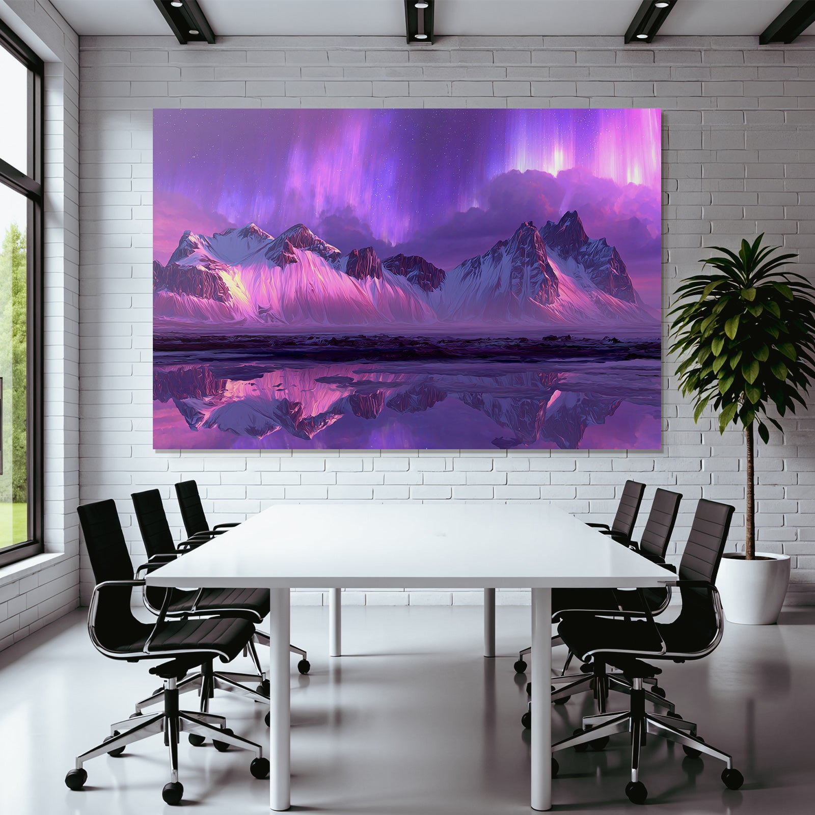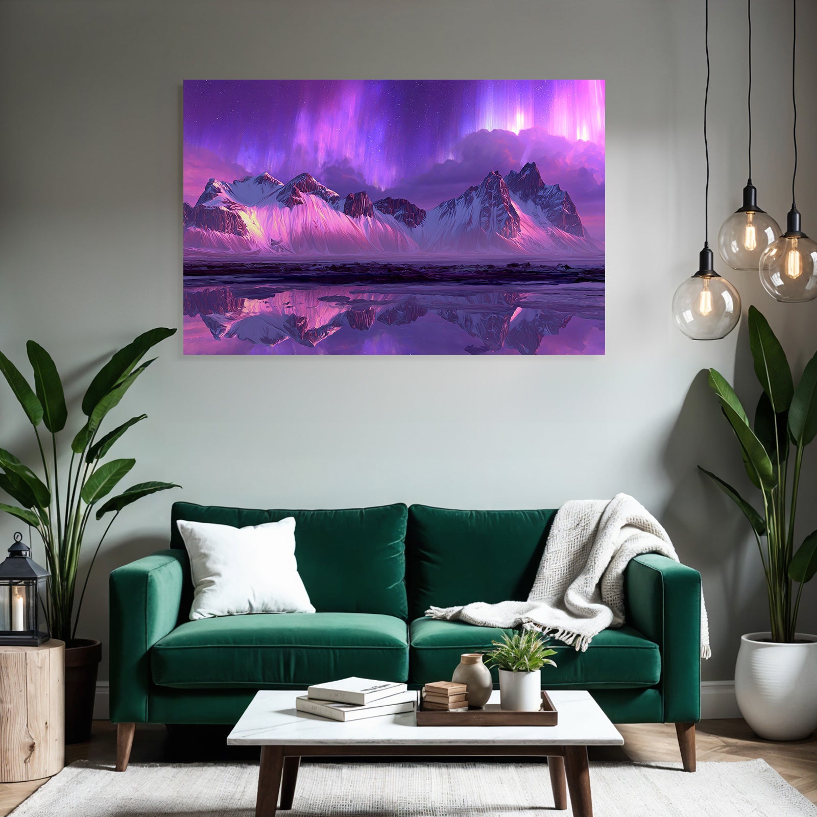 Das Motiv „Polarlicht Schneebedeckte Berge Mit Purpur Auroren Reflexion Im Wasser“ ist ein Highlight der Kollektion Fjorde und Gletscher und wird auf Deinem FameFrame™ brillant in Szene gesetzt.