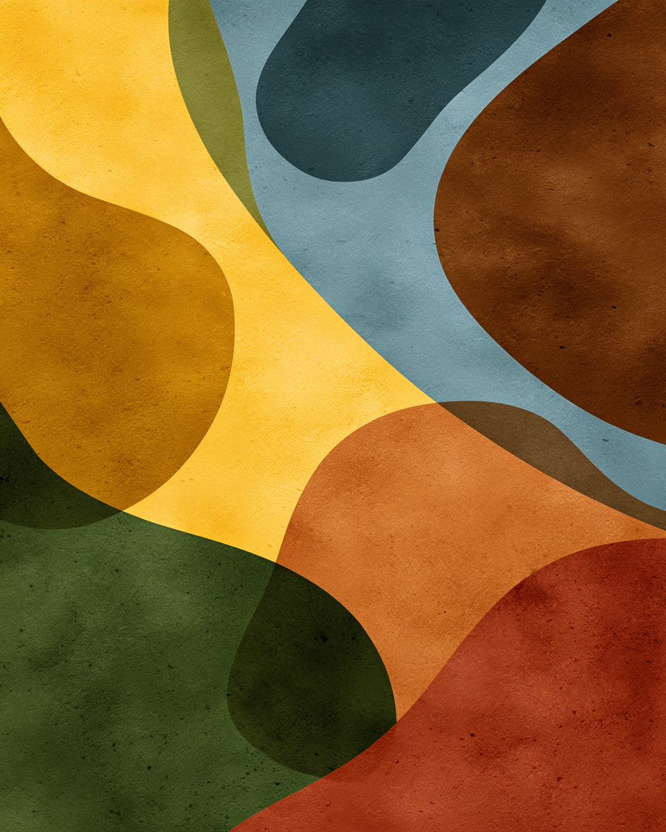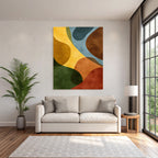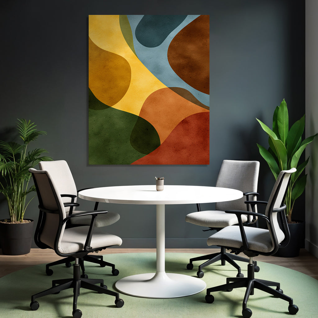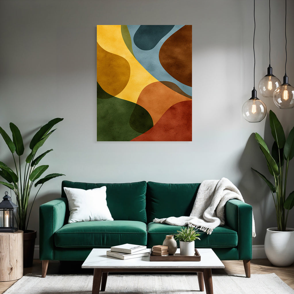 A unique work of art from the FameFrame product line entitled “Abstract Design Organic Shapes Yellow Green Brown Blue” in the Mid Century Modern style.