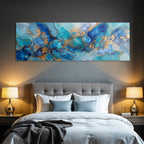 Transform your bedroom into an oasis of calm. The abstract "Play of Colors in Blue, Turquoise, and Gold" motif creates a particularly harmonious and calming effect in the FameFrame .