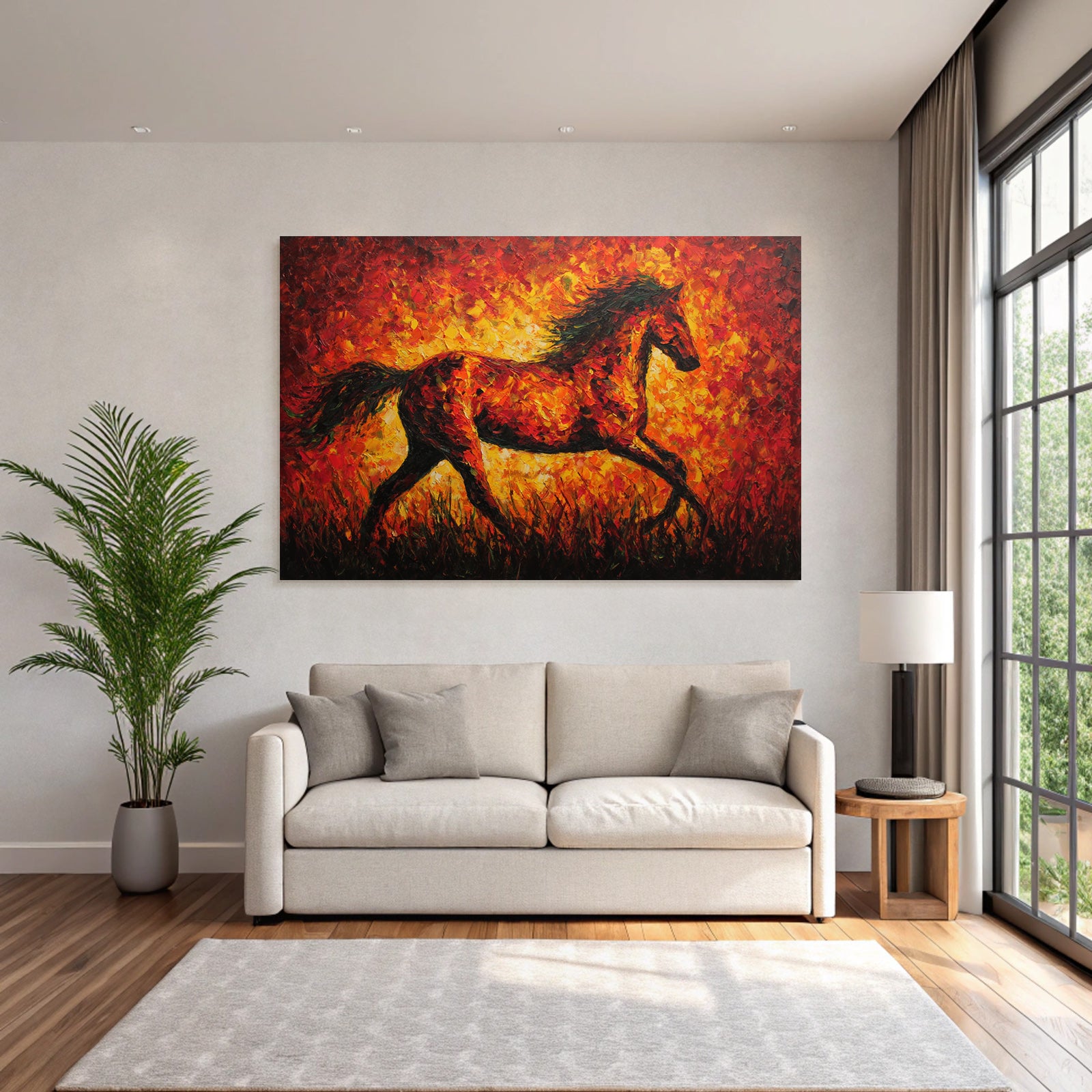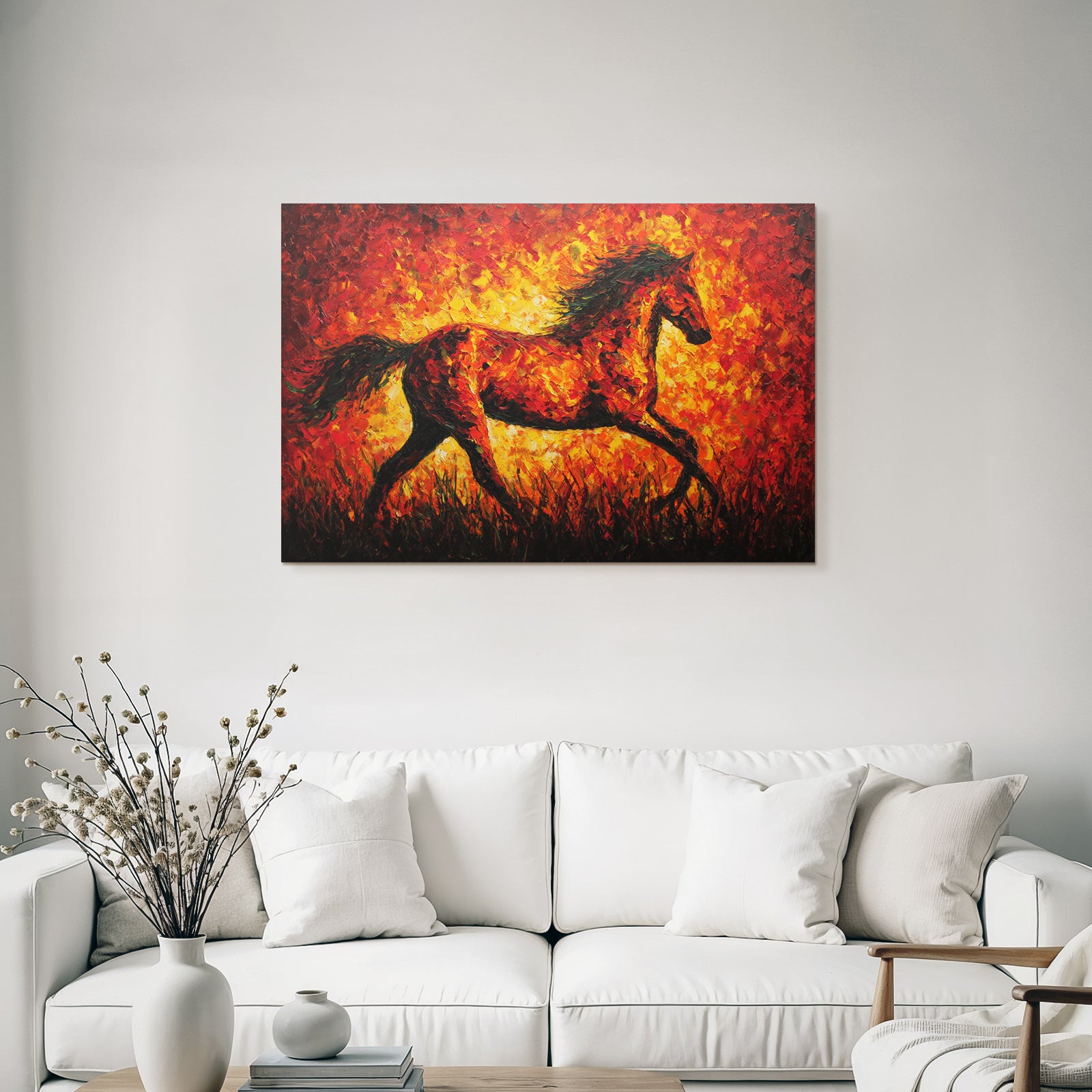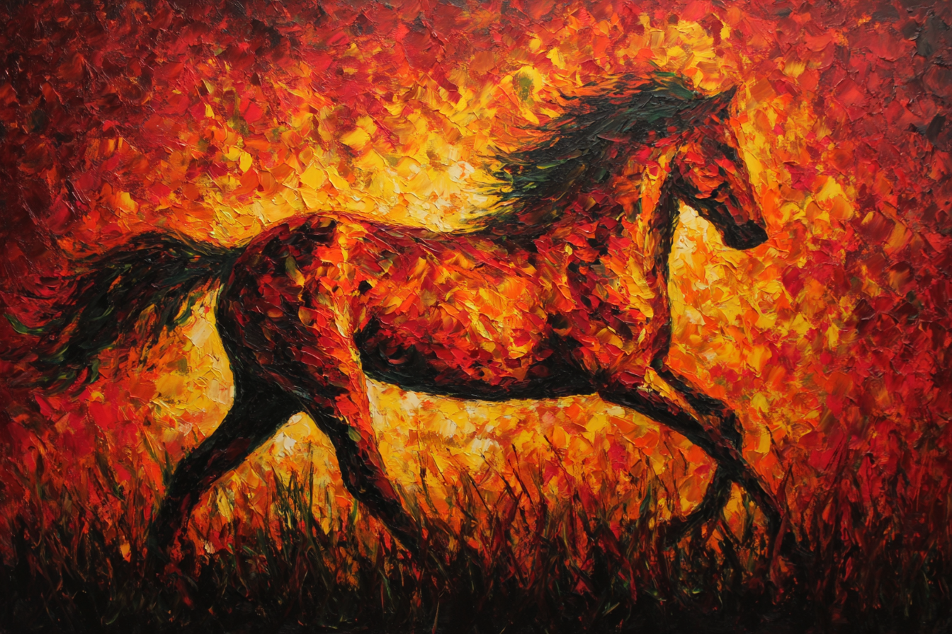 Erleben Sie die pure Essenz von Expressionismus. Das Werk „Feuriges Pferd In Bewegung“ wird durch den hochwertigen Textildruck im FameFrame™ zu einem Statement-Piece.