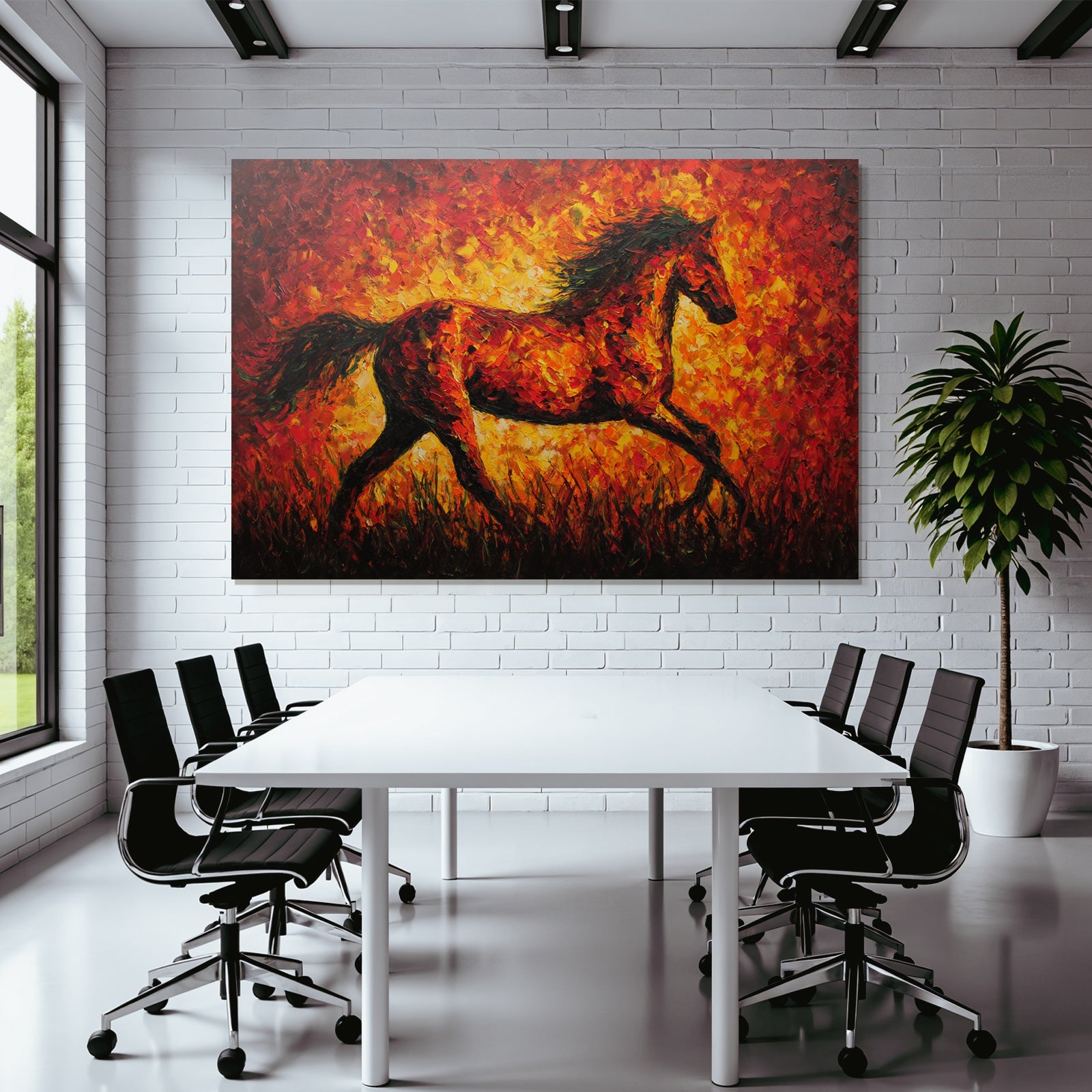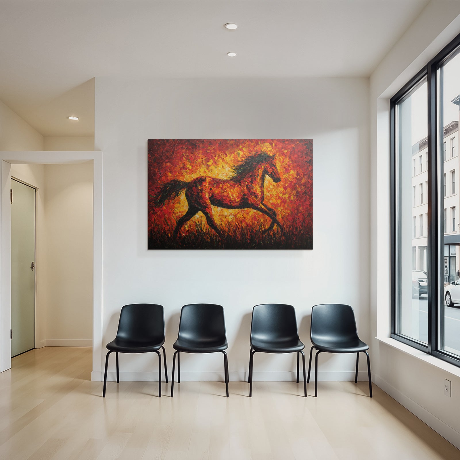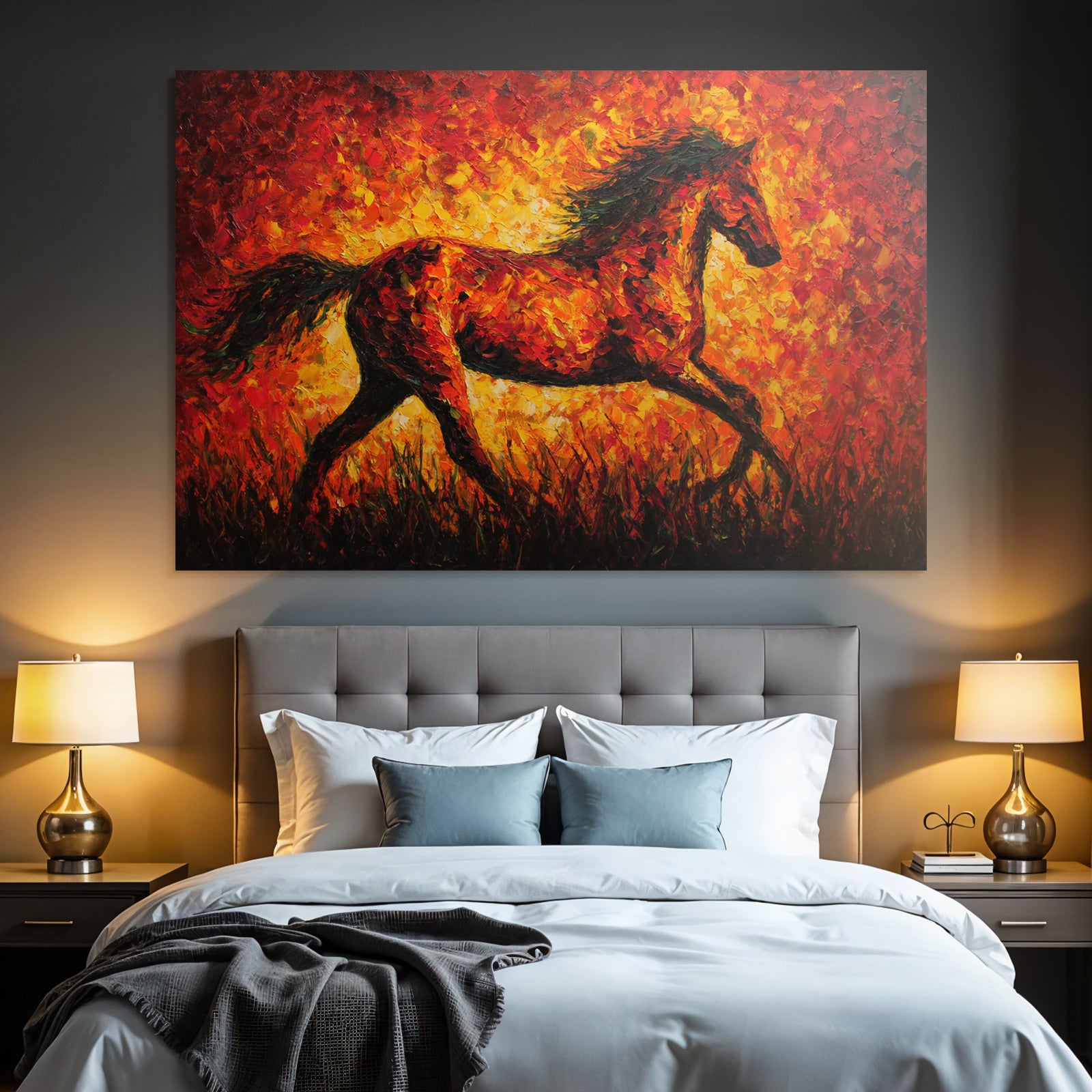 Erleben Sie die pure Essenz von Expressionismus. Das Werk „Feuriges Pferd In Bewegung“ wird durch den hochwertigen Textildruck im FameFrame™ zu einem Statement-Piece.