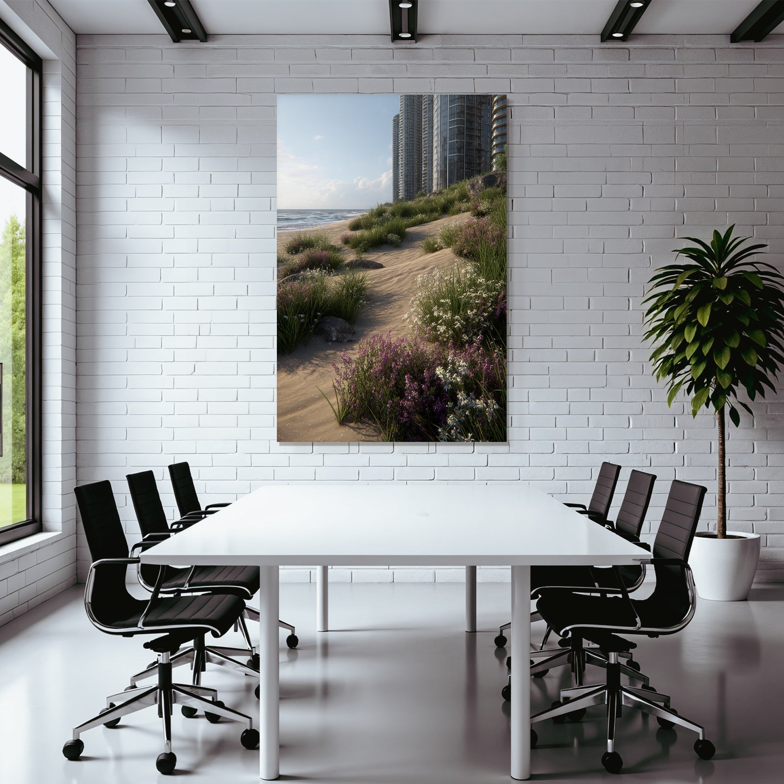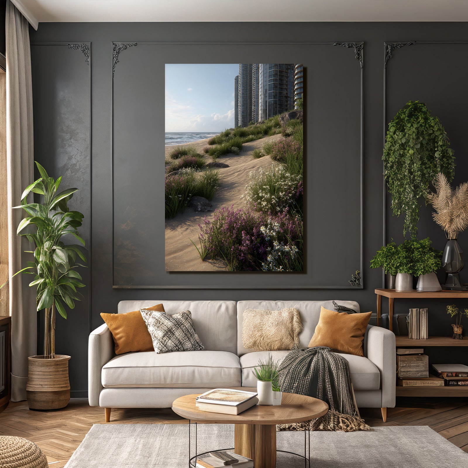 Eine Symbiose aus Kunst und Technik: Das Motiv „Strandszene Mit Modernen Gebaeuden Und Blumen“ im Stil Dünen und Heide entfaltet auf dem Hightech-Textil des FameFrame™ eine unvergleichliche Tiefenwirkung.