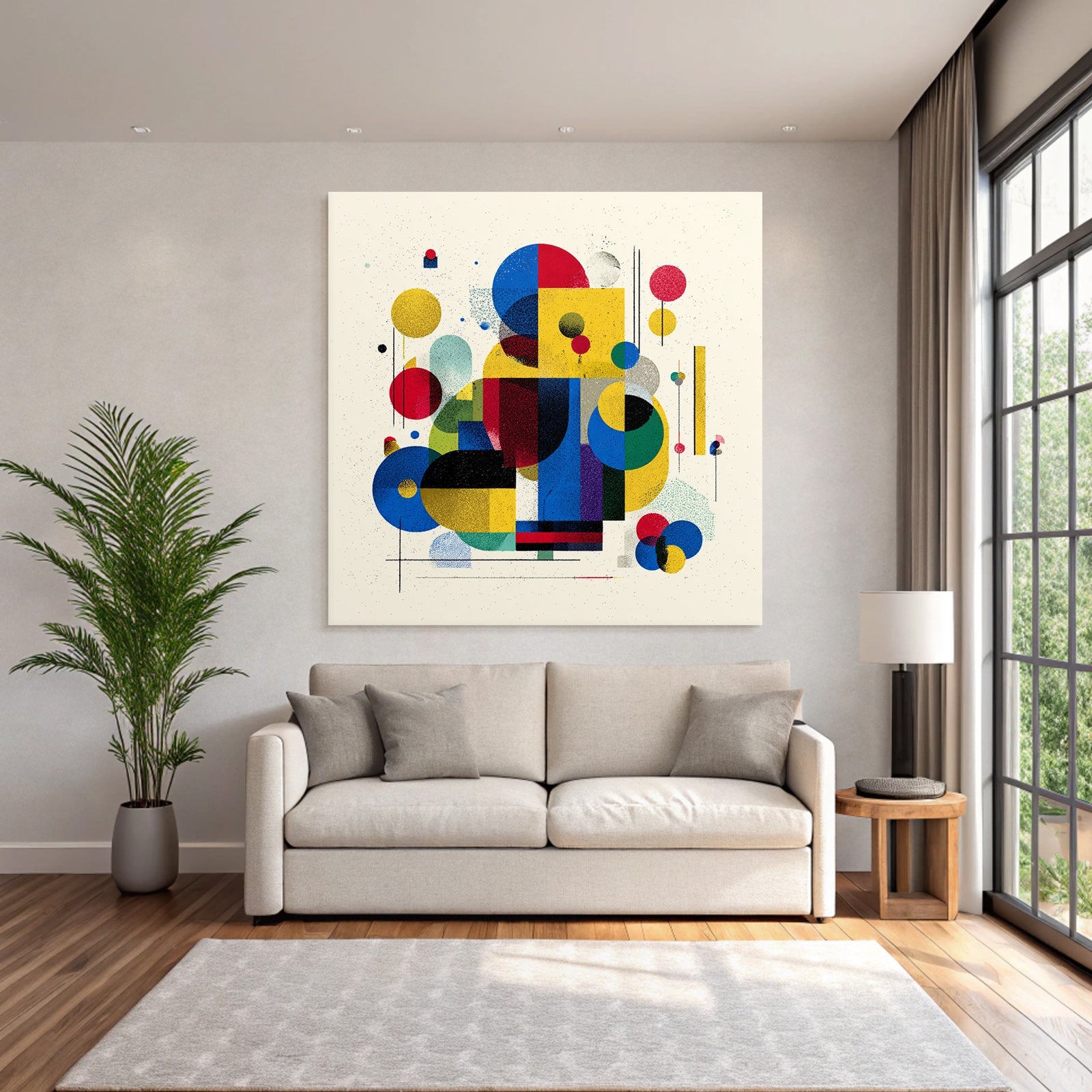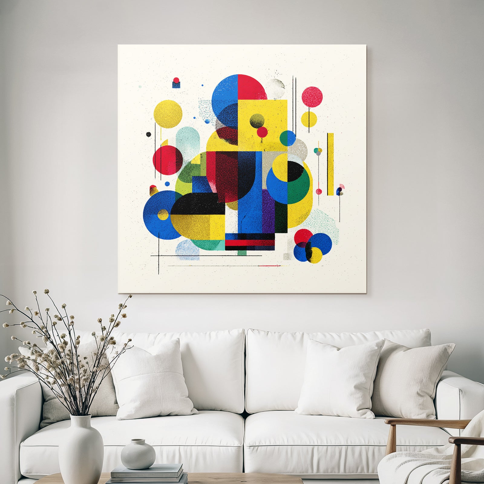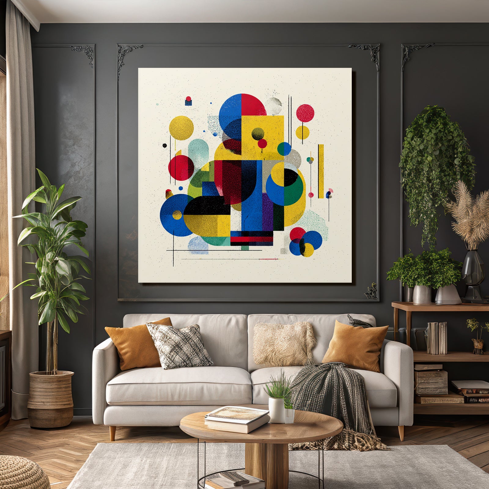 Mit „Verspielte Abstrakte Komposition Mit Geometrischen Formen“ entscheiden Sie sich für ein ausdrucksstarkes Kunstwerk im Stil Bauhaus. Der FameFrame™ unterstreicht die moderne und hochwertige Wirkung.