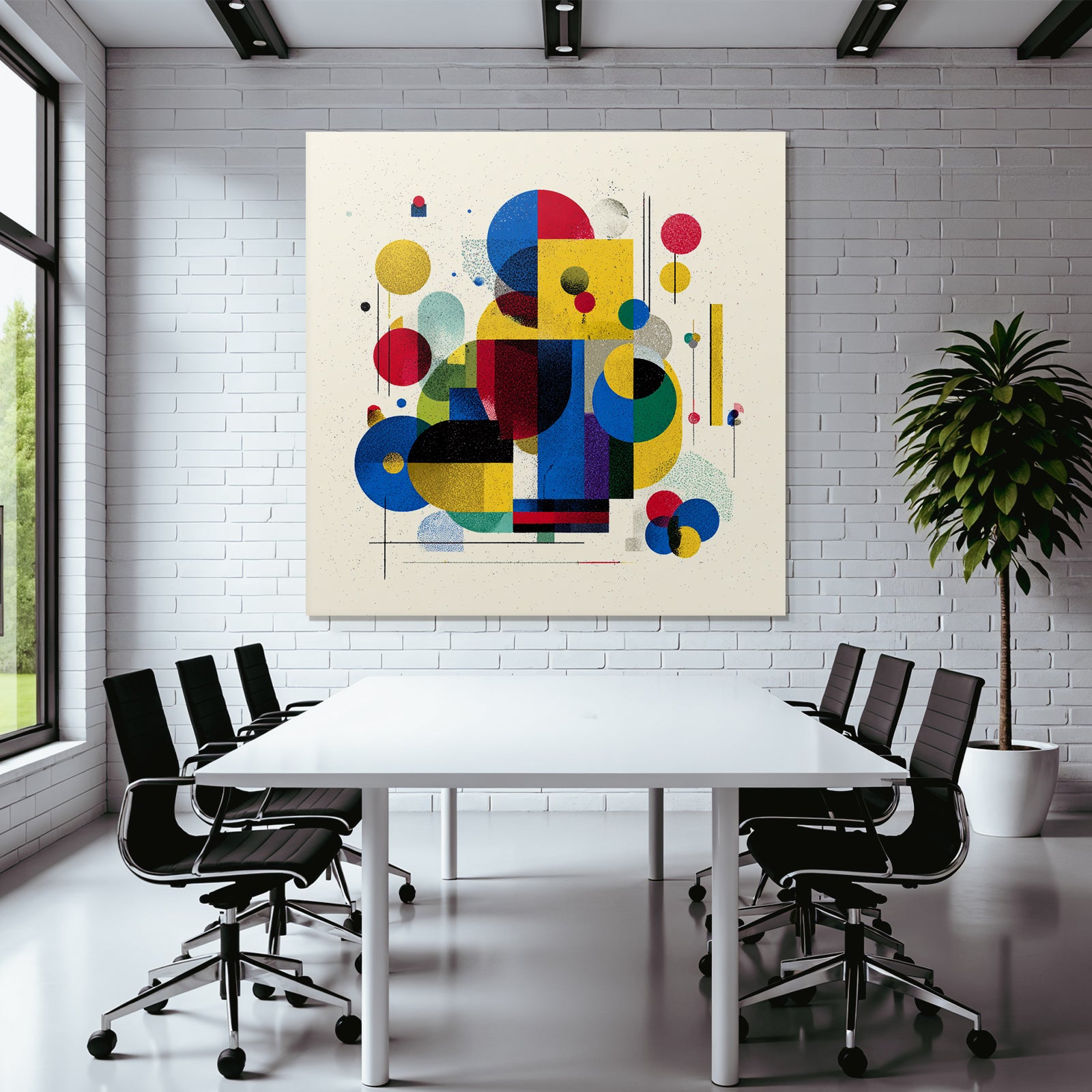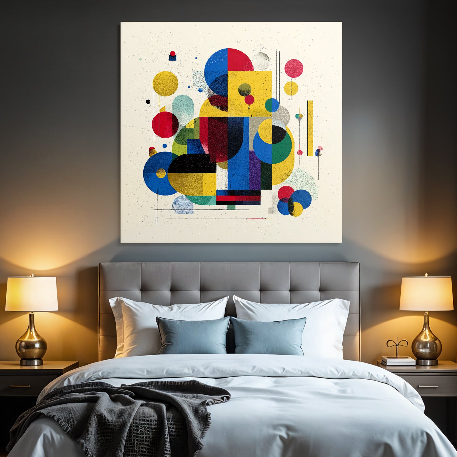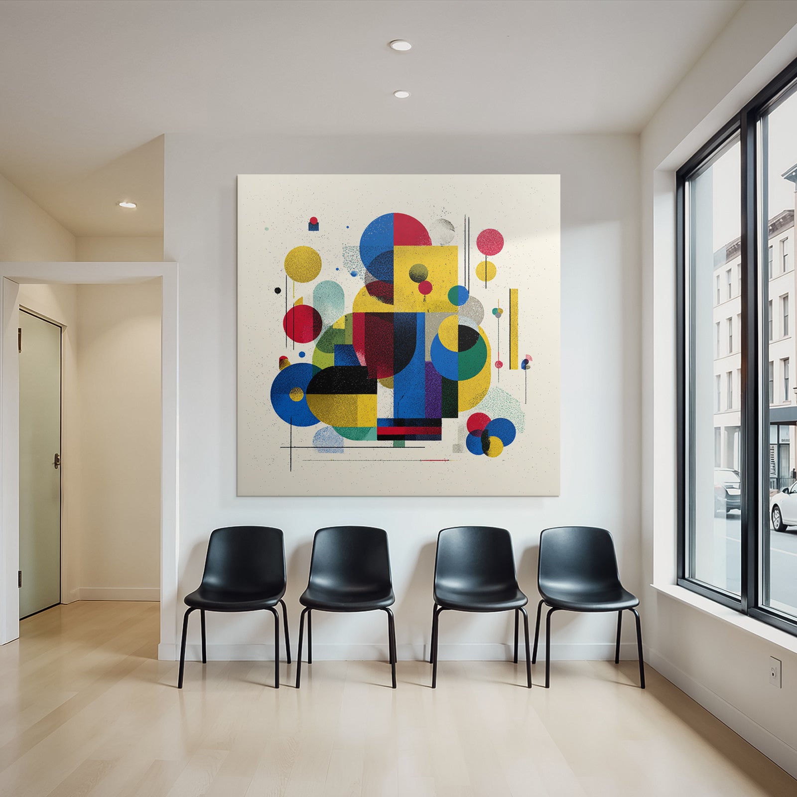 Mit „Verspielte Abstrakte Komposition Mit Geometrischen Formen“ entscheiden Sie sich für ein ausdrucksstarkes Kunstwerk im Stil Bauhaus. Der FameFrame™ unterstreicht die moderne und hochwertige Wirkung.