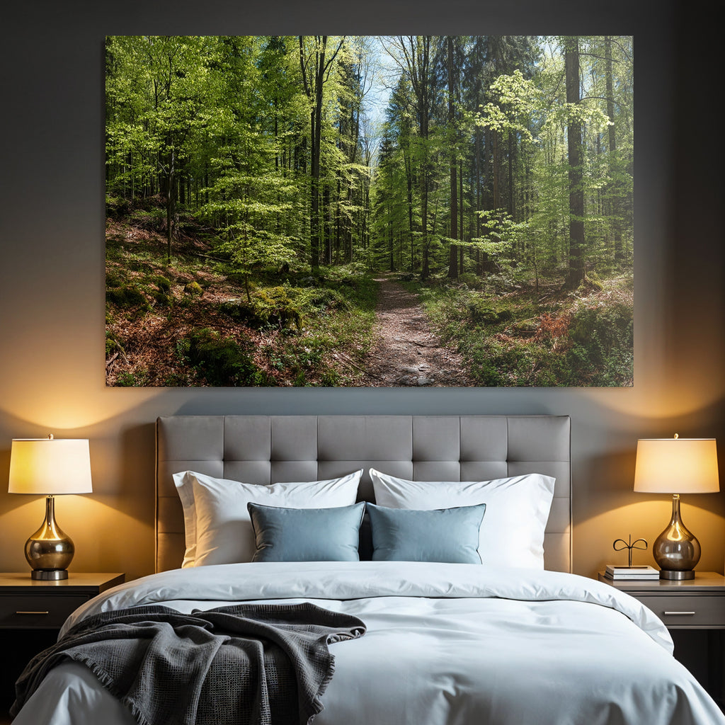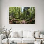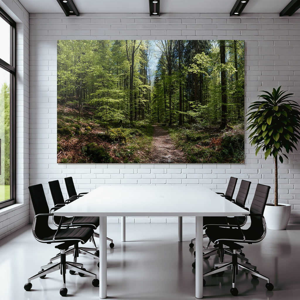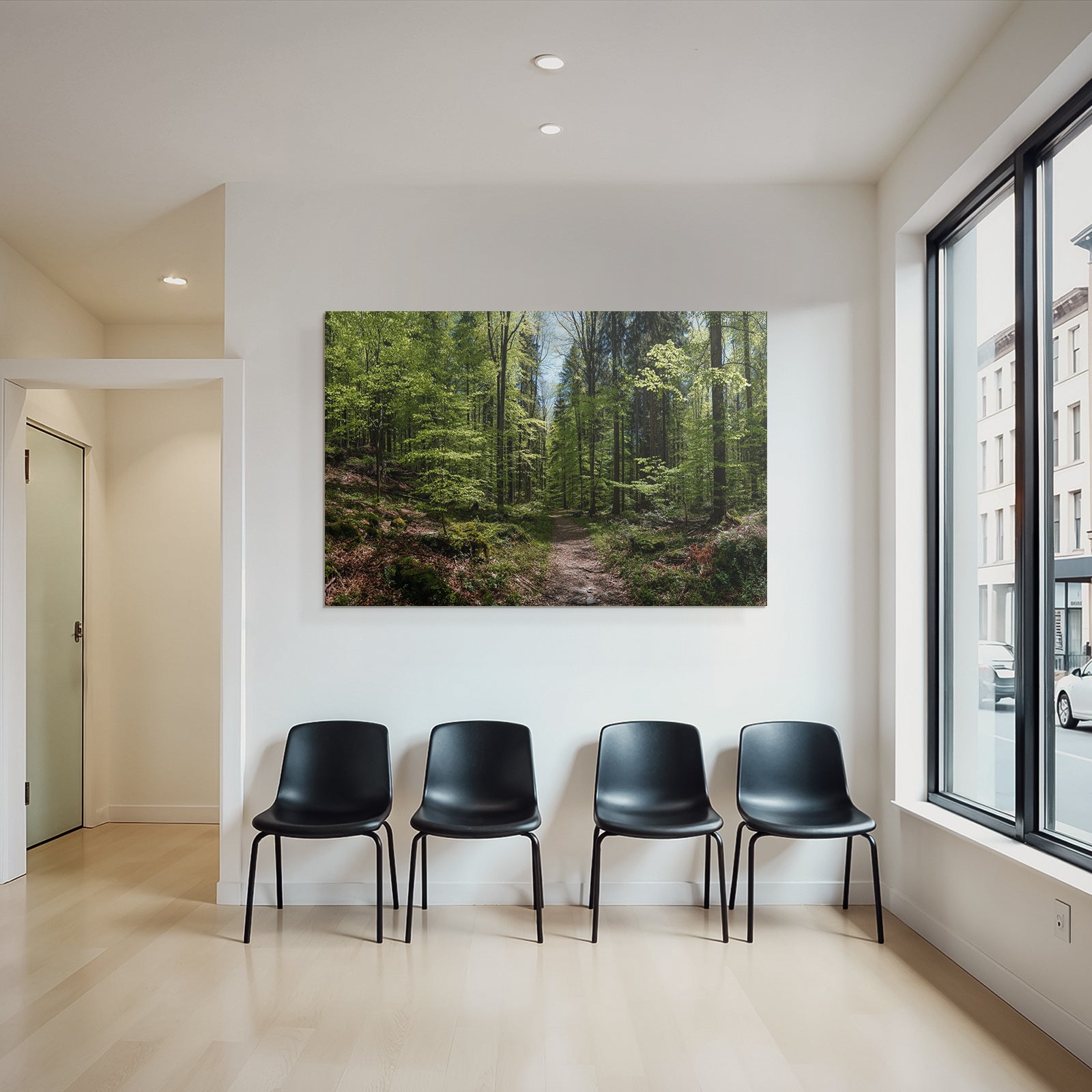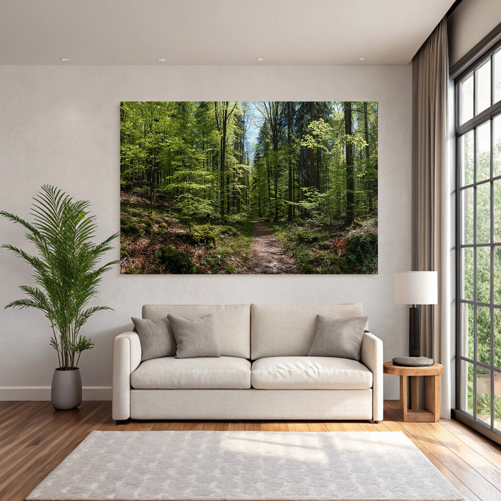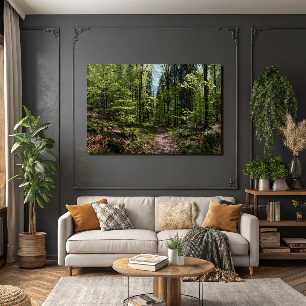 The motif “Forests and Meadows Peaceful Forest Path with Sunshine” brings forests and meadows inspiration into your home – brilliantly printed and elegantly mounted in a FameFrame .