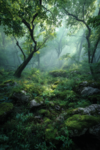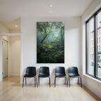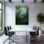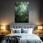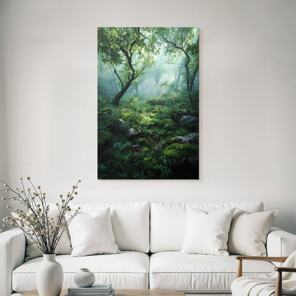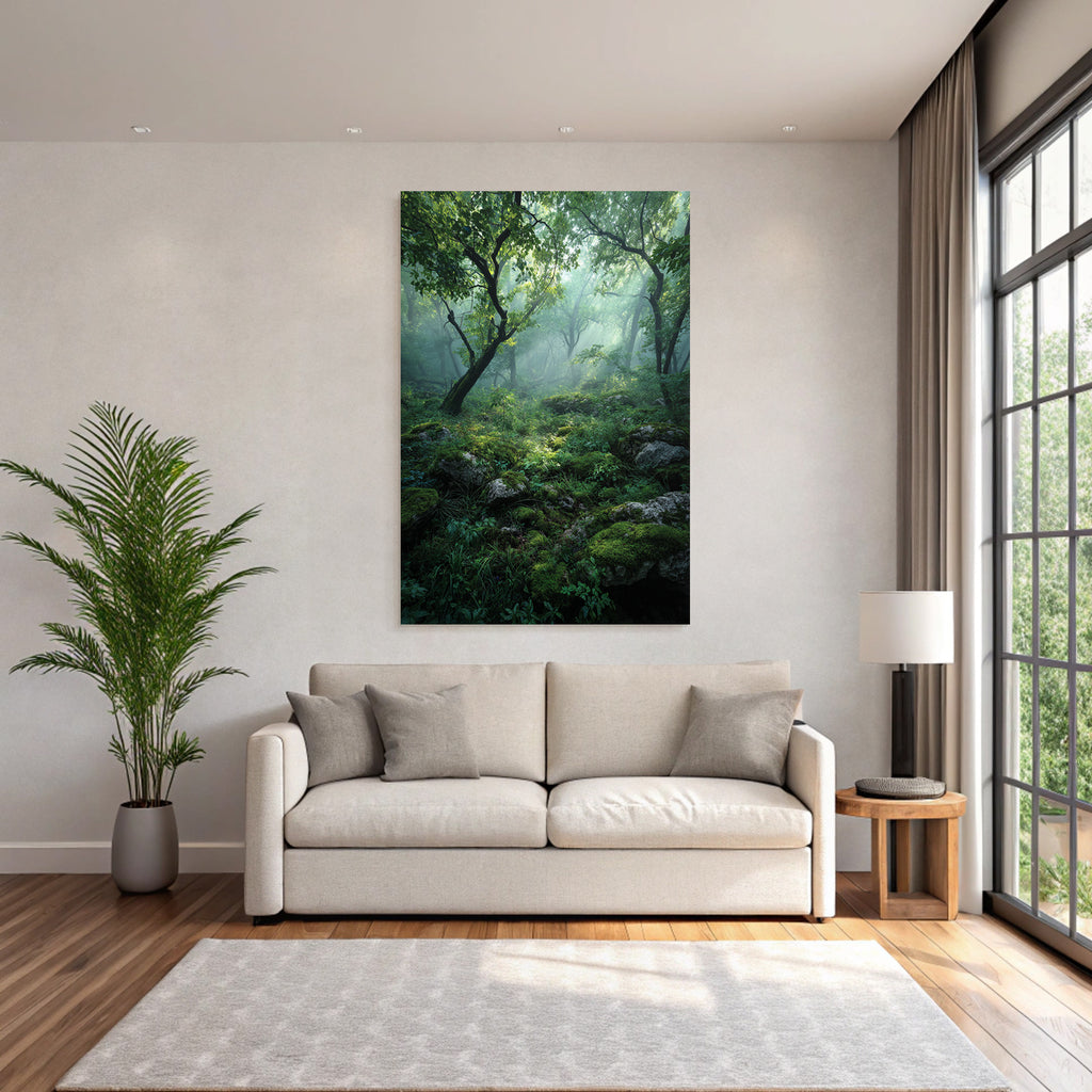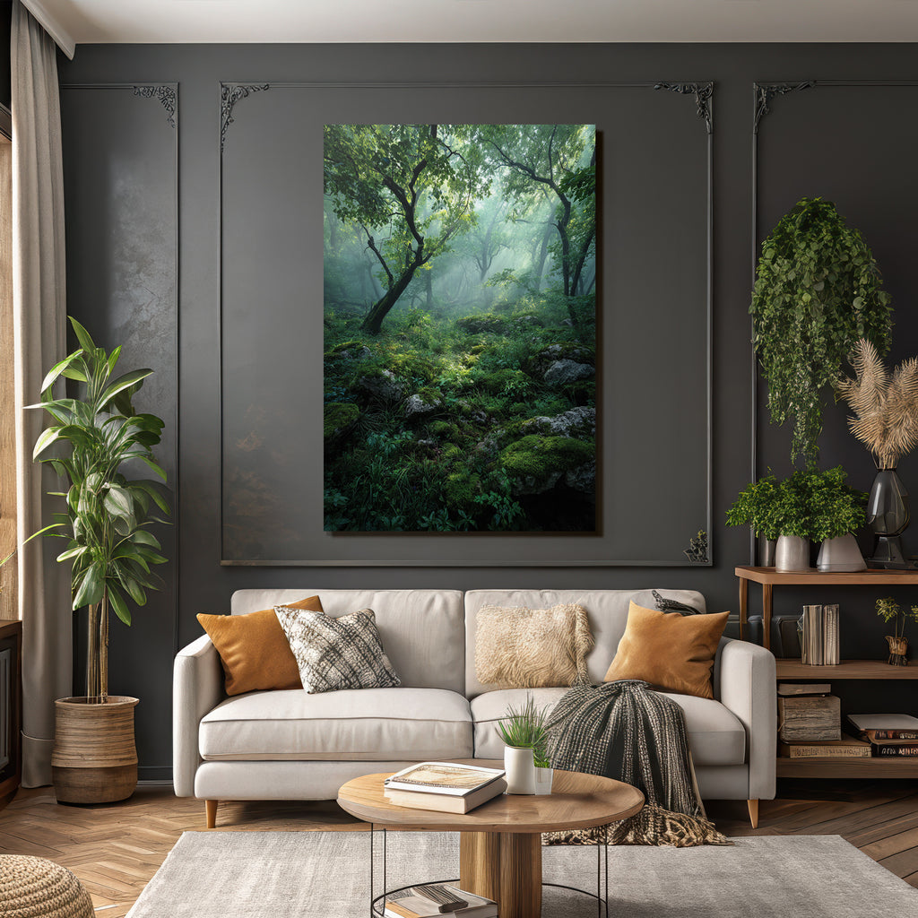 The motif “Forests and Meadows: Quiet Forest in the Fog with Green Trees and Moss-Covered Stones” is a highlight of the Forests and Meadows collection and will be brilliantly showcased on your FameFrame .