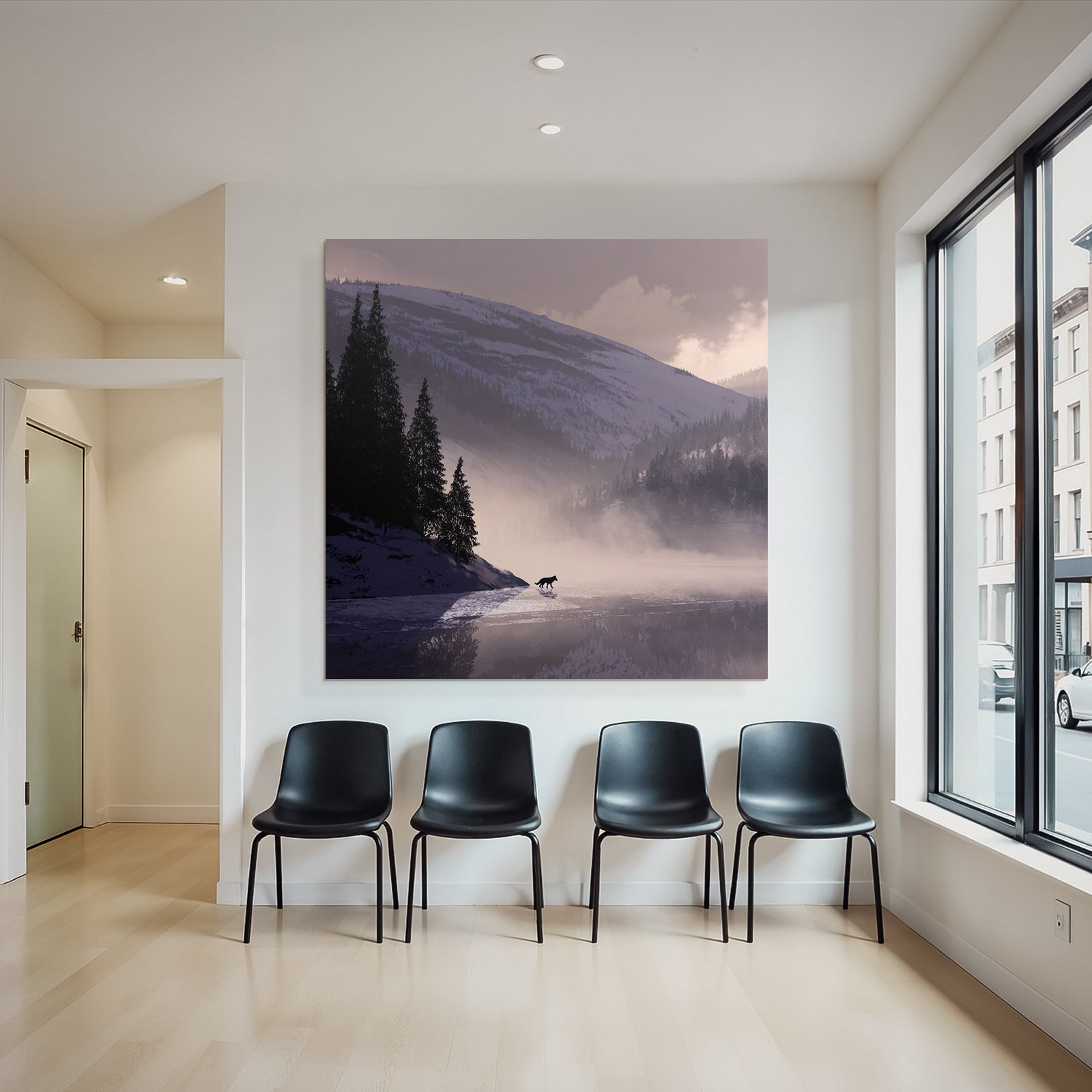 The artwork "Winter: Tranquil Snowy Landscape with a Wolf at the Water's Edge" is a homage to the winter landscape style. The FameFrame perfectly showcases the motif's vibrant colors and depth of detail.