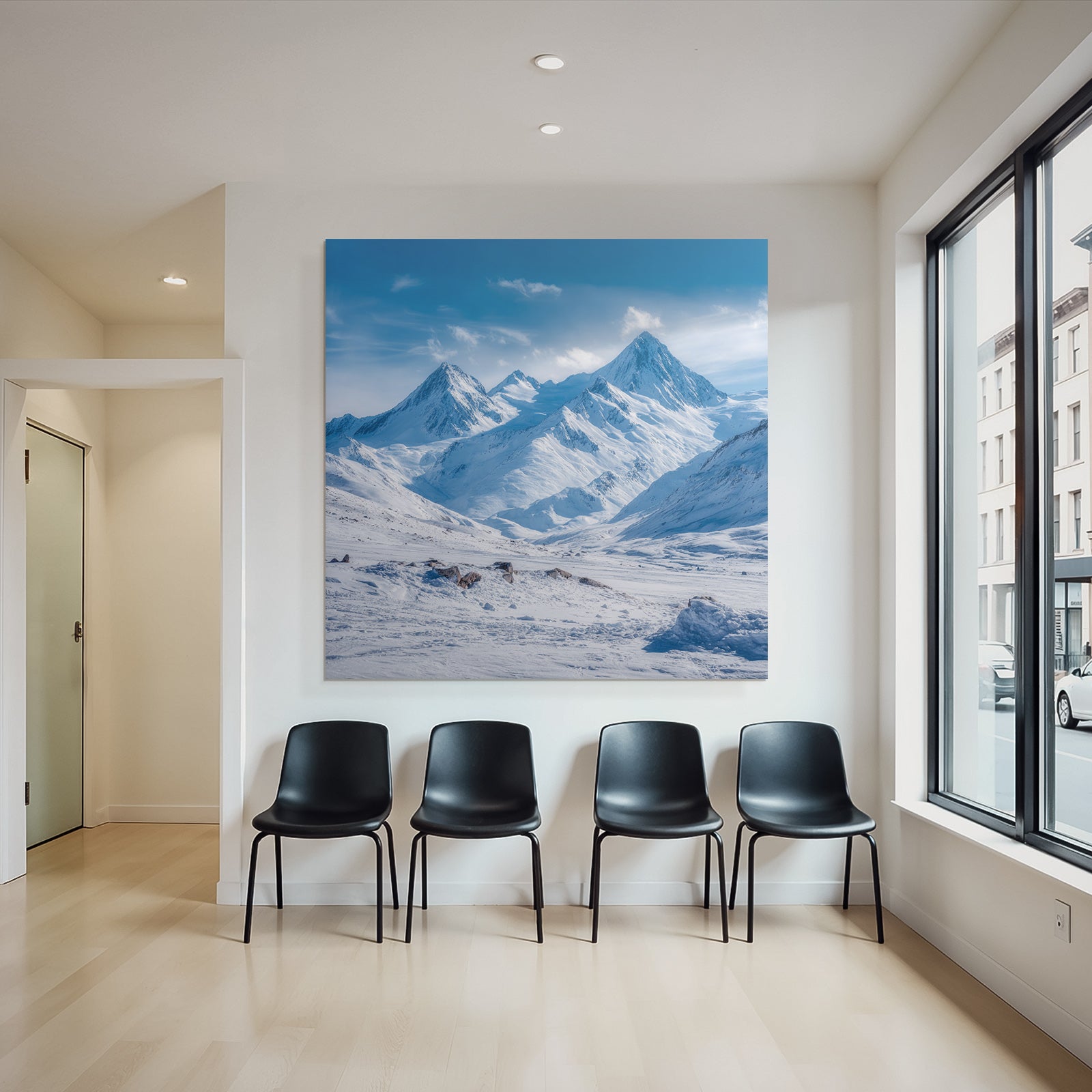 The motif “Winter Snow-Covered Mountain Landscape With Clear Blue Sky” brings winter landscape inspiration into your home – brilliantly printed and elegantly mounted in a FameFrame .