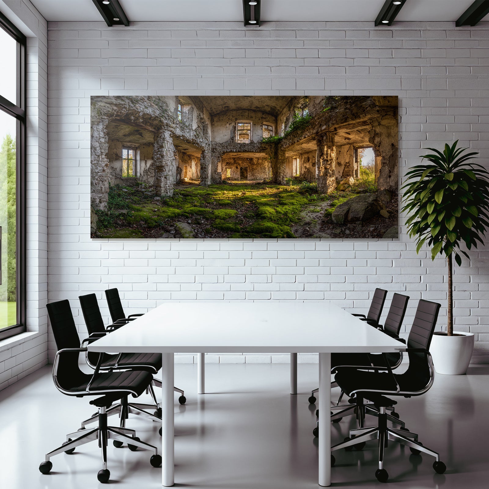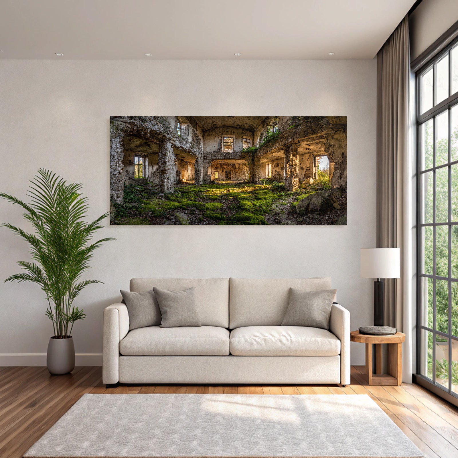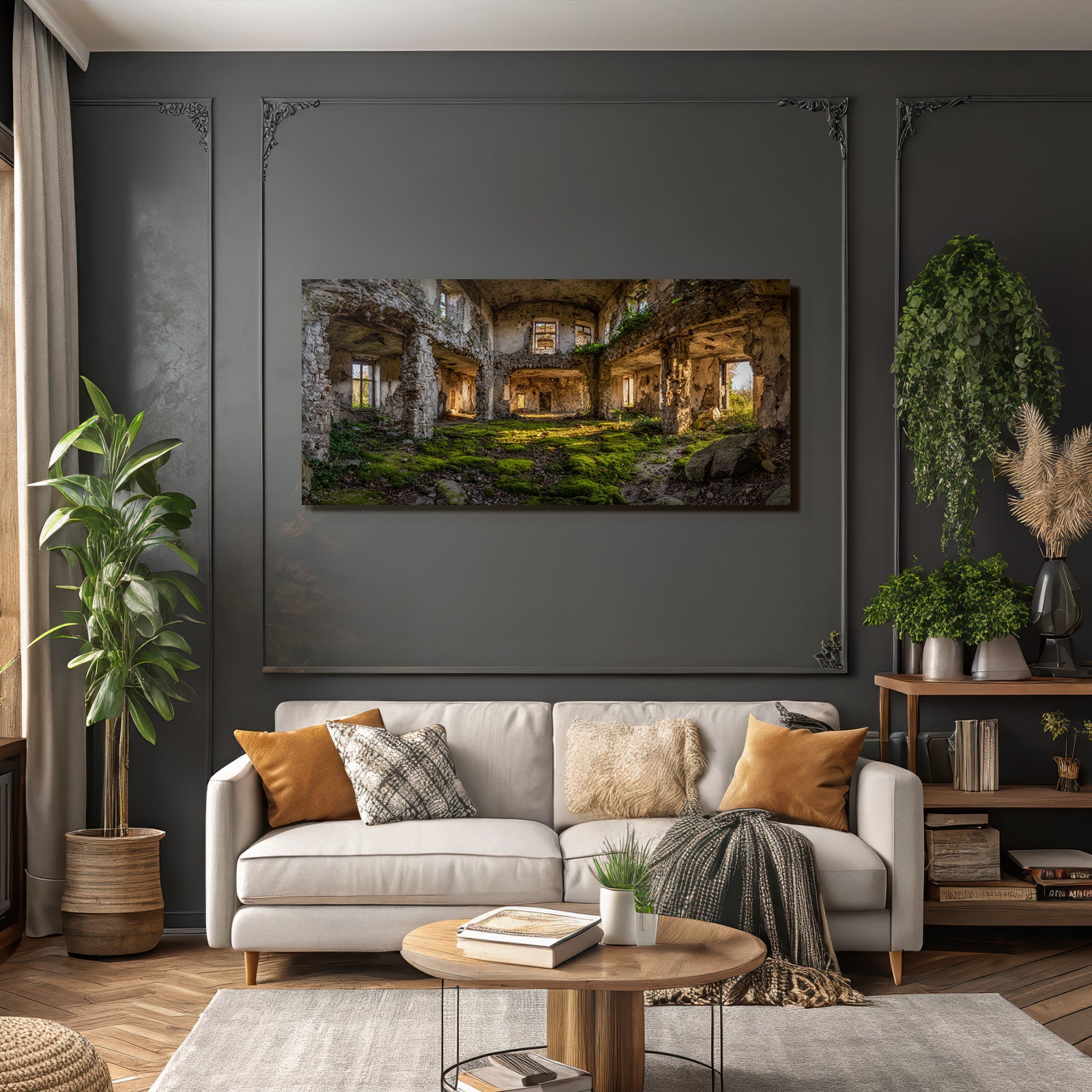Ob für eine exklusive Boutique, ein modernes Restaurant oder Ihr Esszimmer – „Abandoned Structure Mit Verfallenem Innenraum Und Wuchernden Vegetation“ im Lost Places-Design schafft im FameFrame™ ein unvergessliches Ambiente.