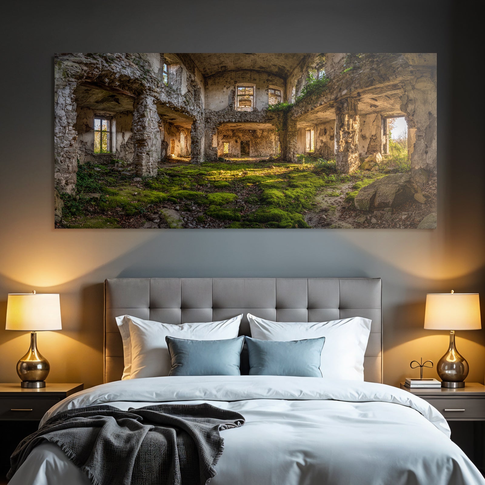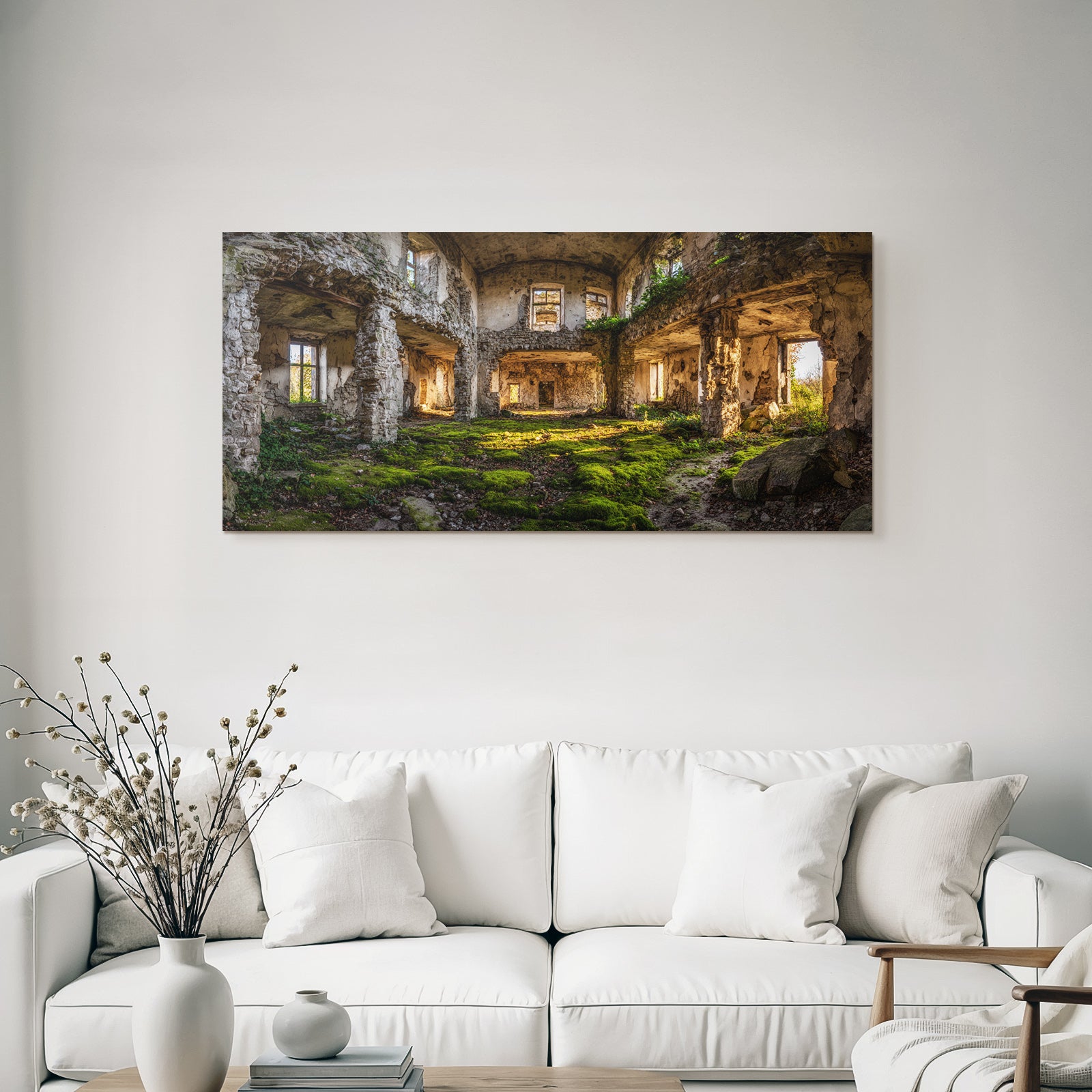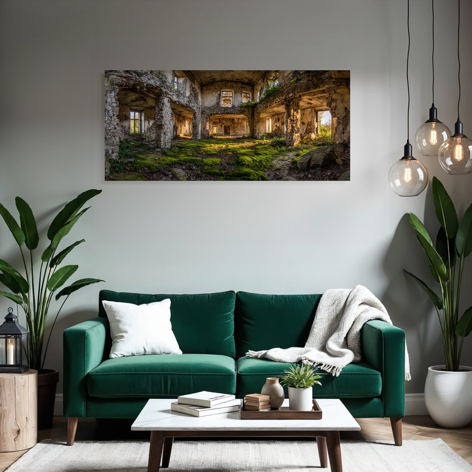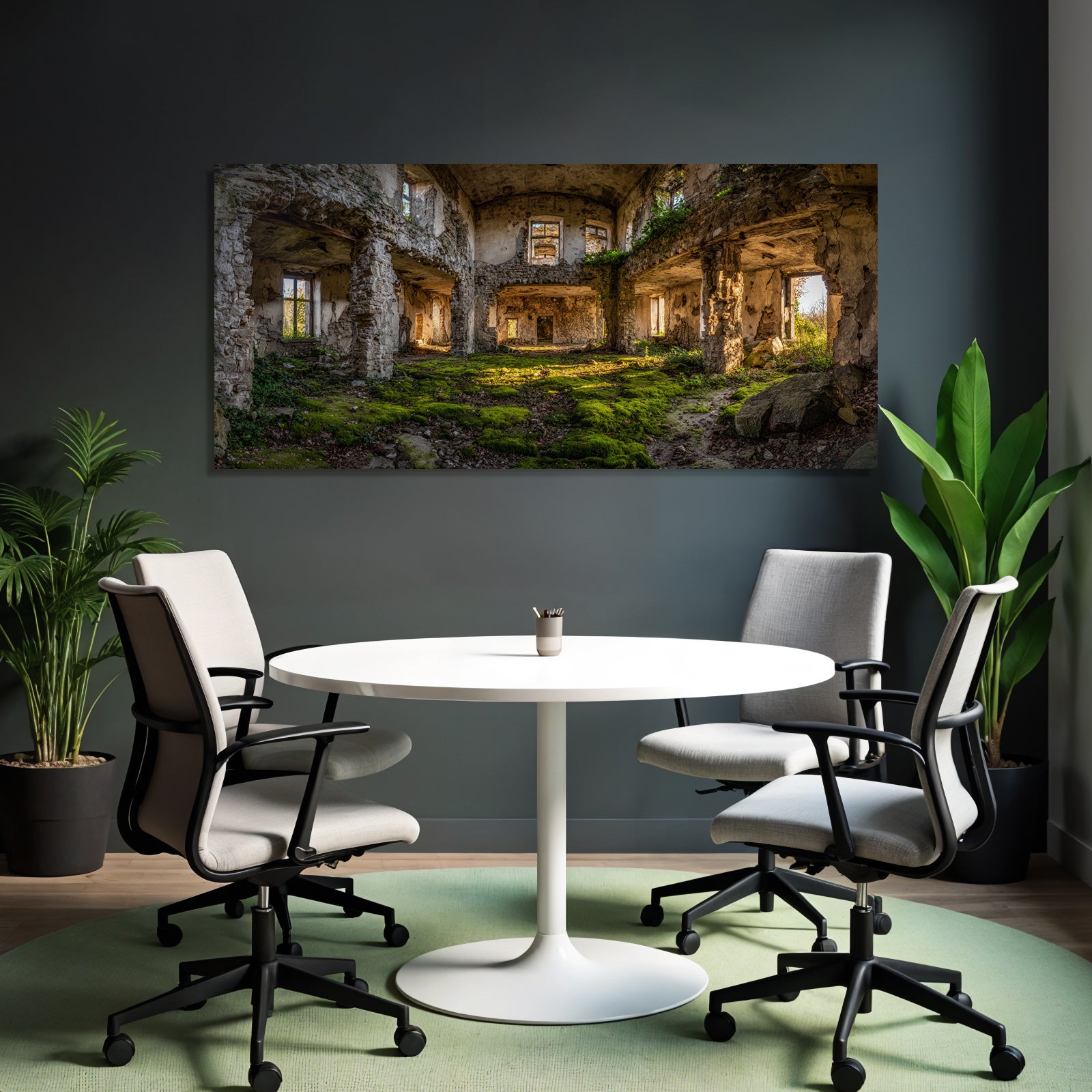 Ob für eine exklusive Boutique, ein modernes Restaurant oder Ihr Esszimmer – „Abandoned Structure Mit Verfallenem Innenraum Und Wuchernden Vegetation“ im Lost Places-Design schafft im FameFrame™ ein unvergessliches Ambiente.