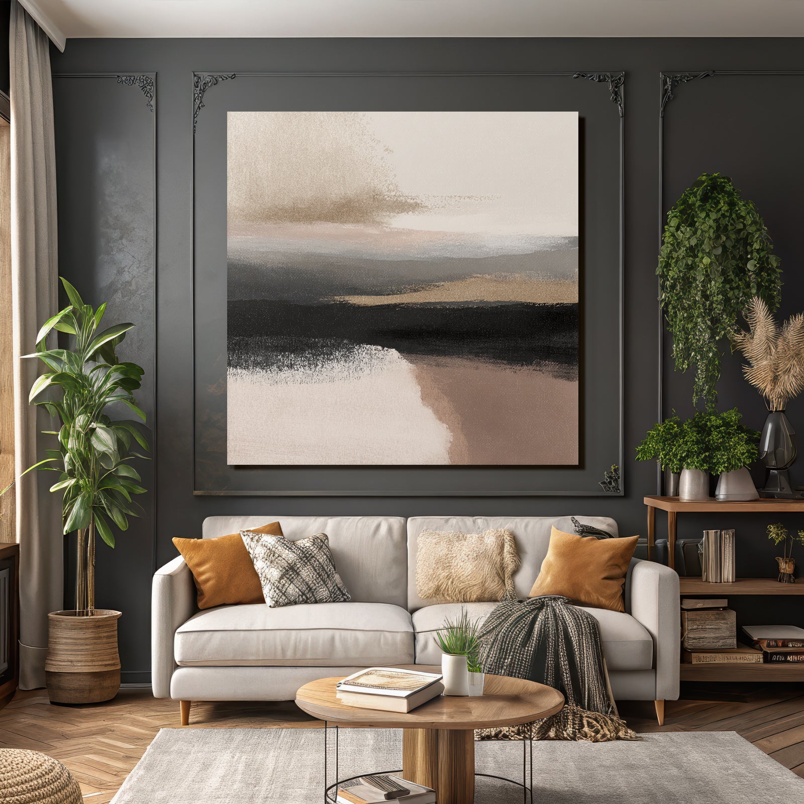 Setze Akzente im Esszimmer, Salon oder Praxisraum mit dem Kunstwerk „„Abstract Kunst Sanftefarben Texturen Landschaftsszene““ im Stil Japandi – gespannt im edlen FameFrame.