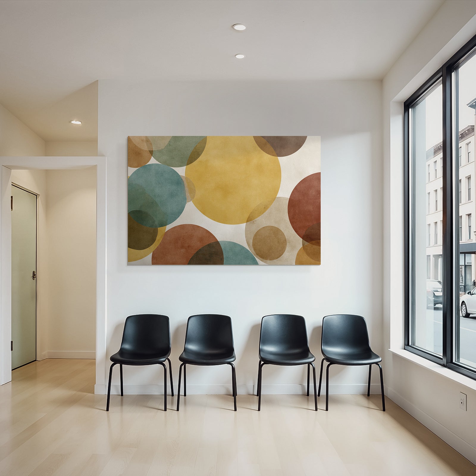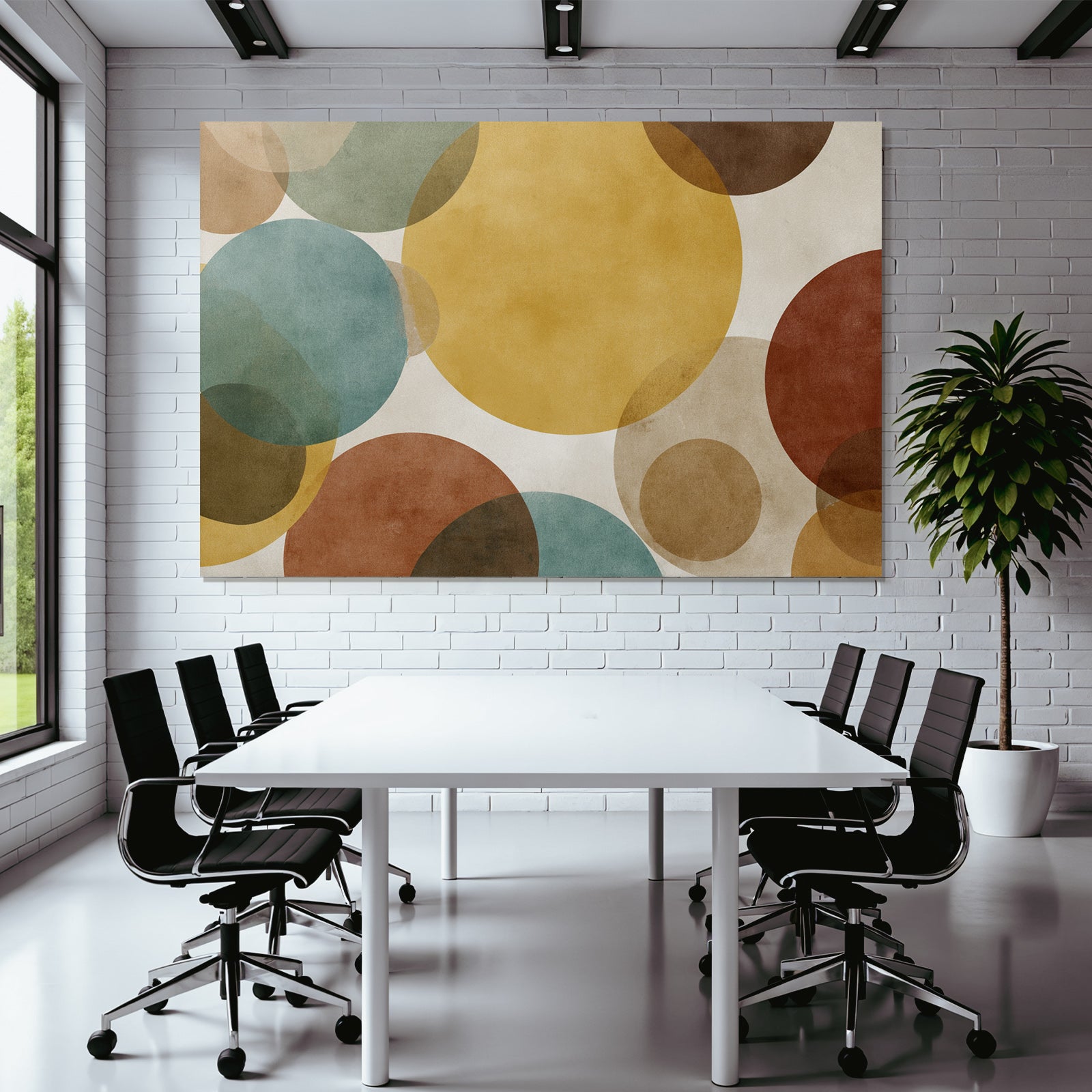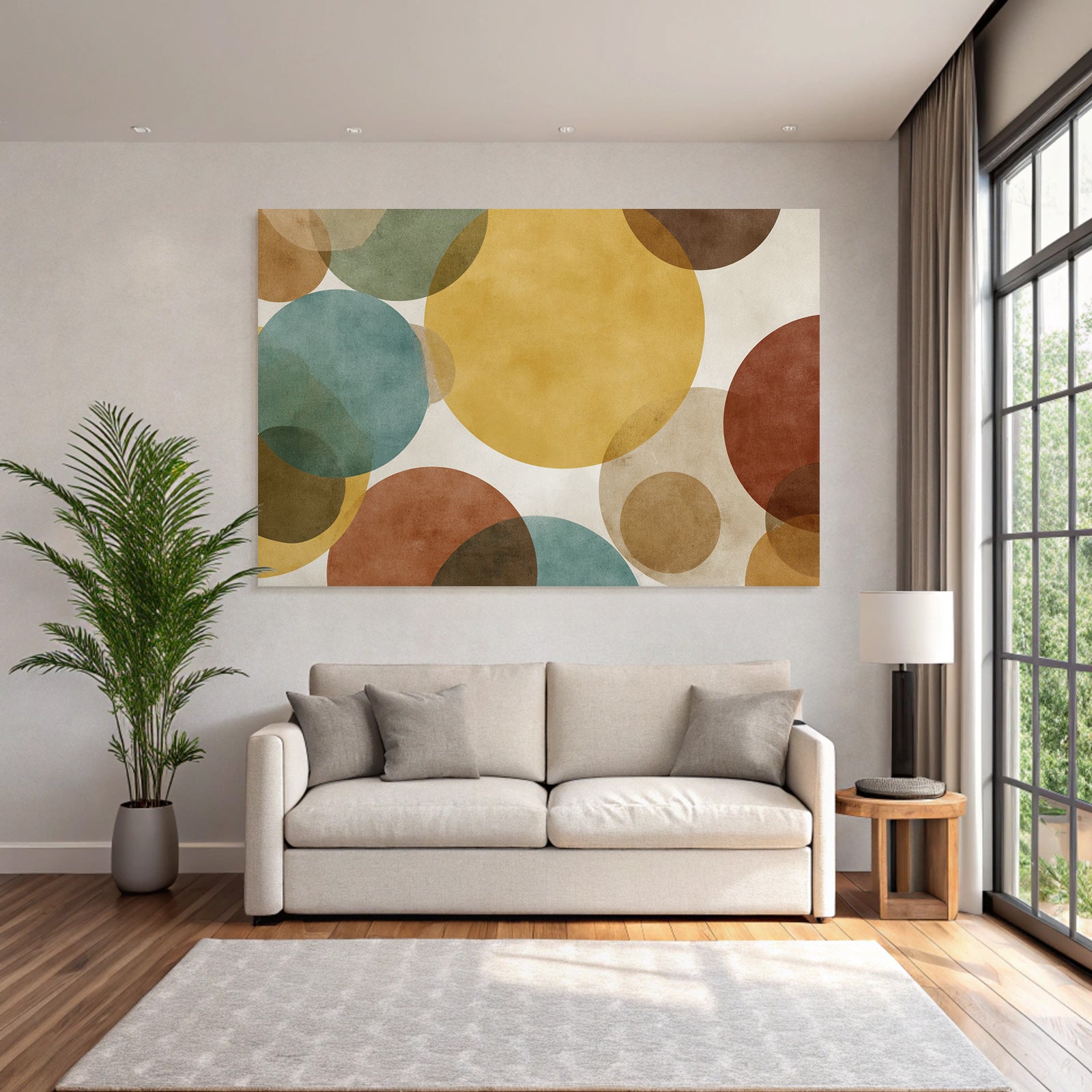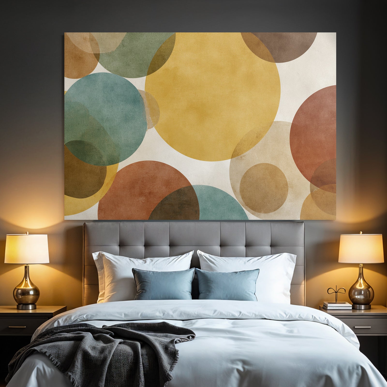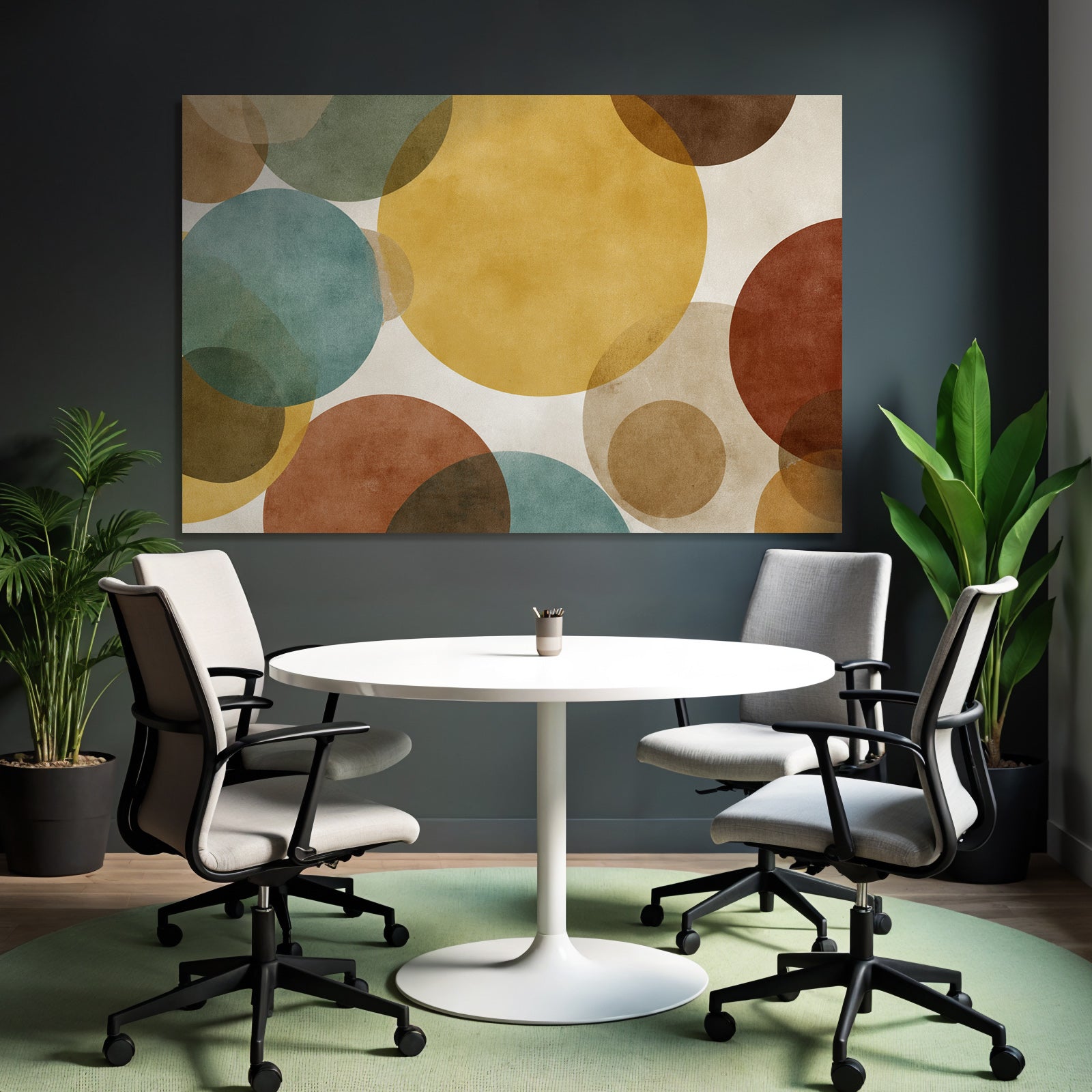 „„Abstraktes Design Kreis““ bringt den Stil Mid Century Modern an Deine Wand – perfekt für Schlafzimmer, Homeoffice oder Besprechungsräume, edel gerahmt im FameFrame.