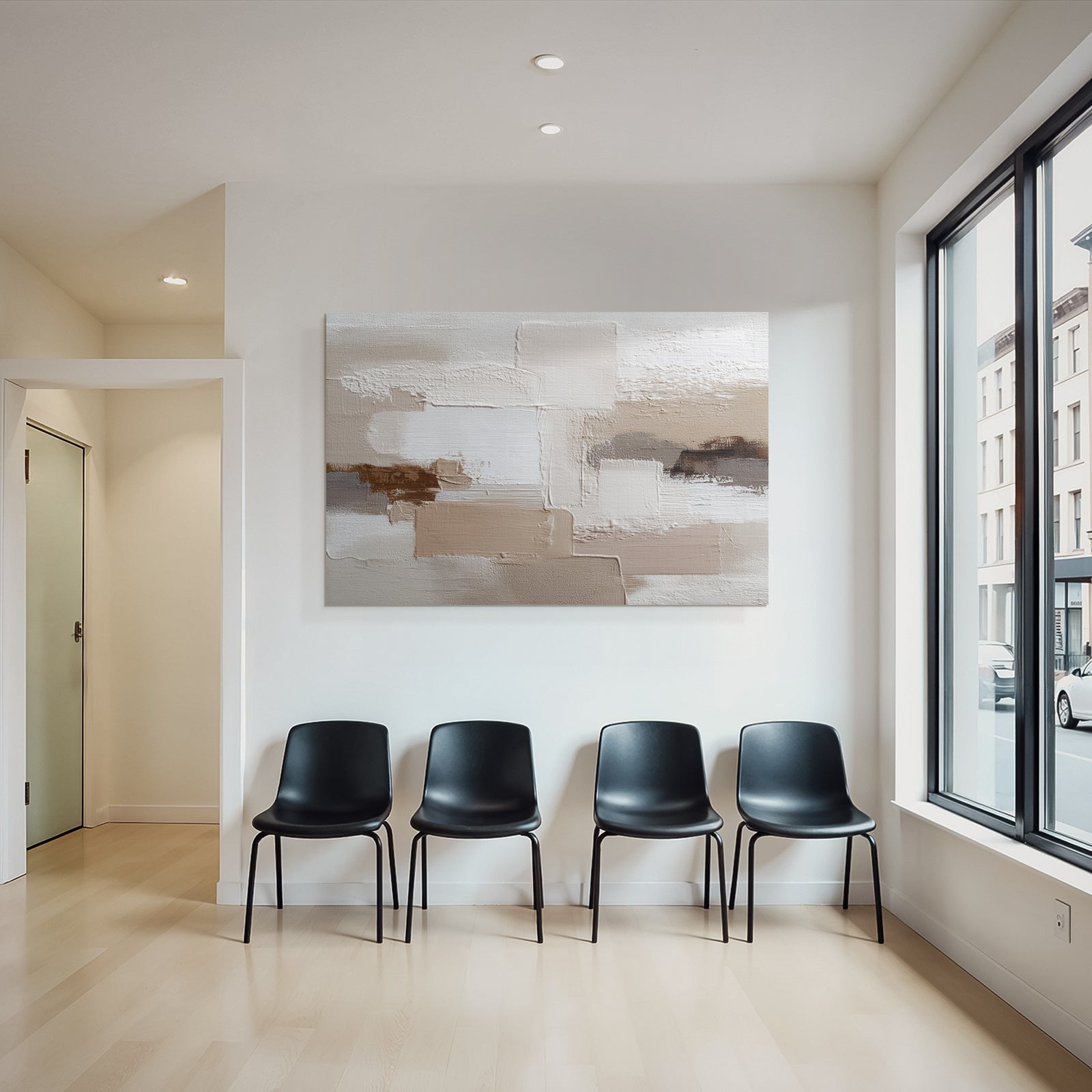 Verleihe Lobby, Wartezimmer oder Studio eine besondere Atmosphäre mit „„Abstraktes Gemaelde Beige Weiss Braun““ im Stil Japandi – eindrucksvoll im FameFrame präsentiert.