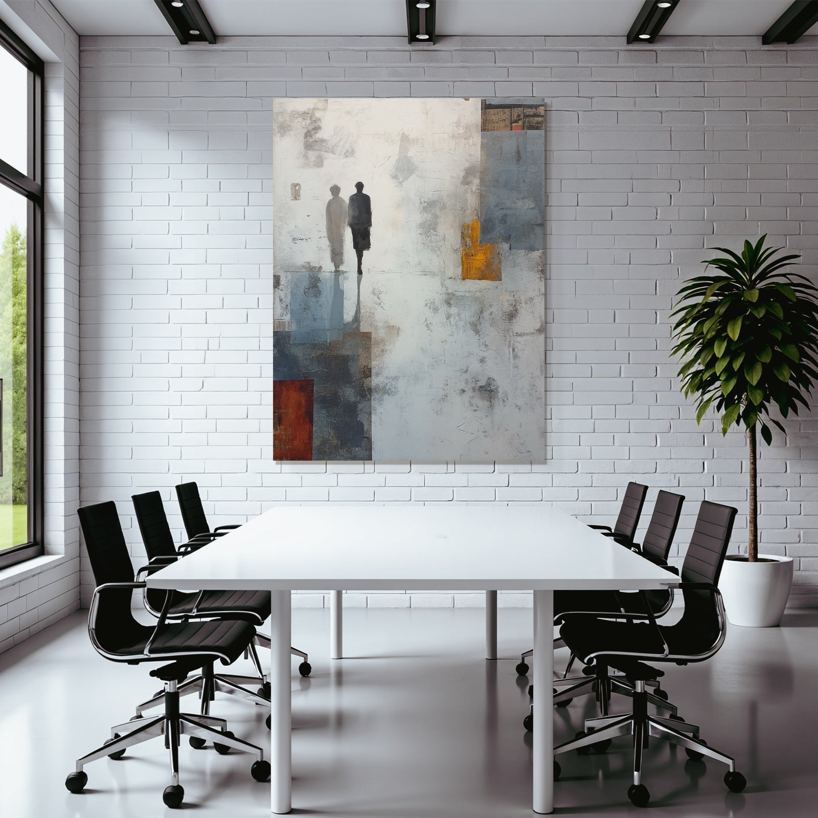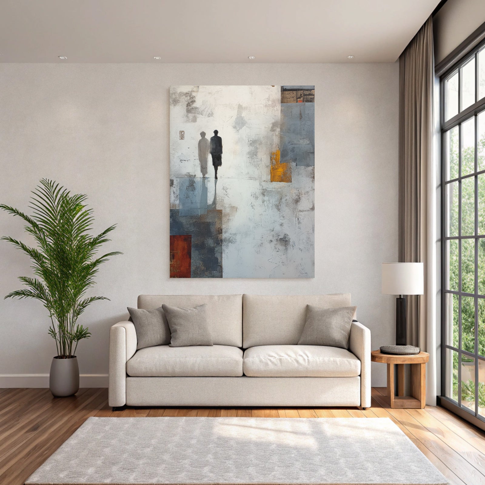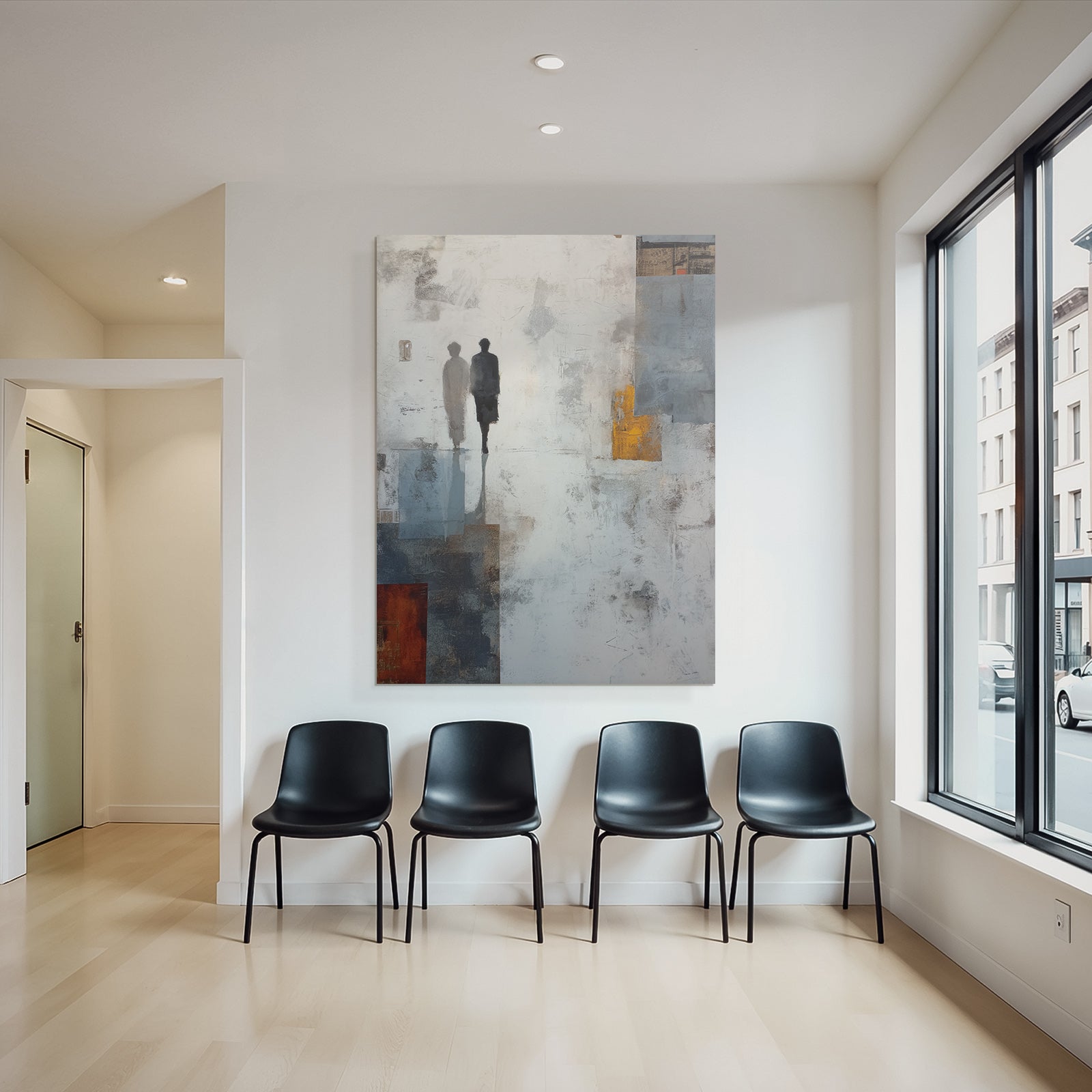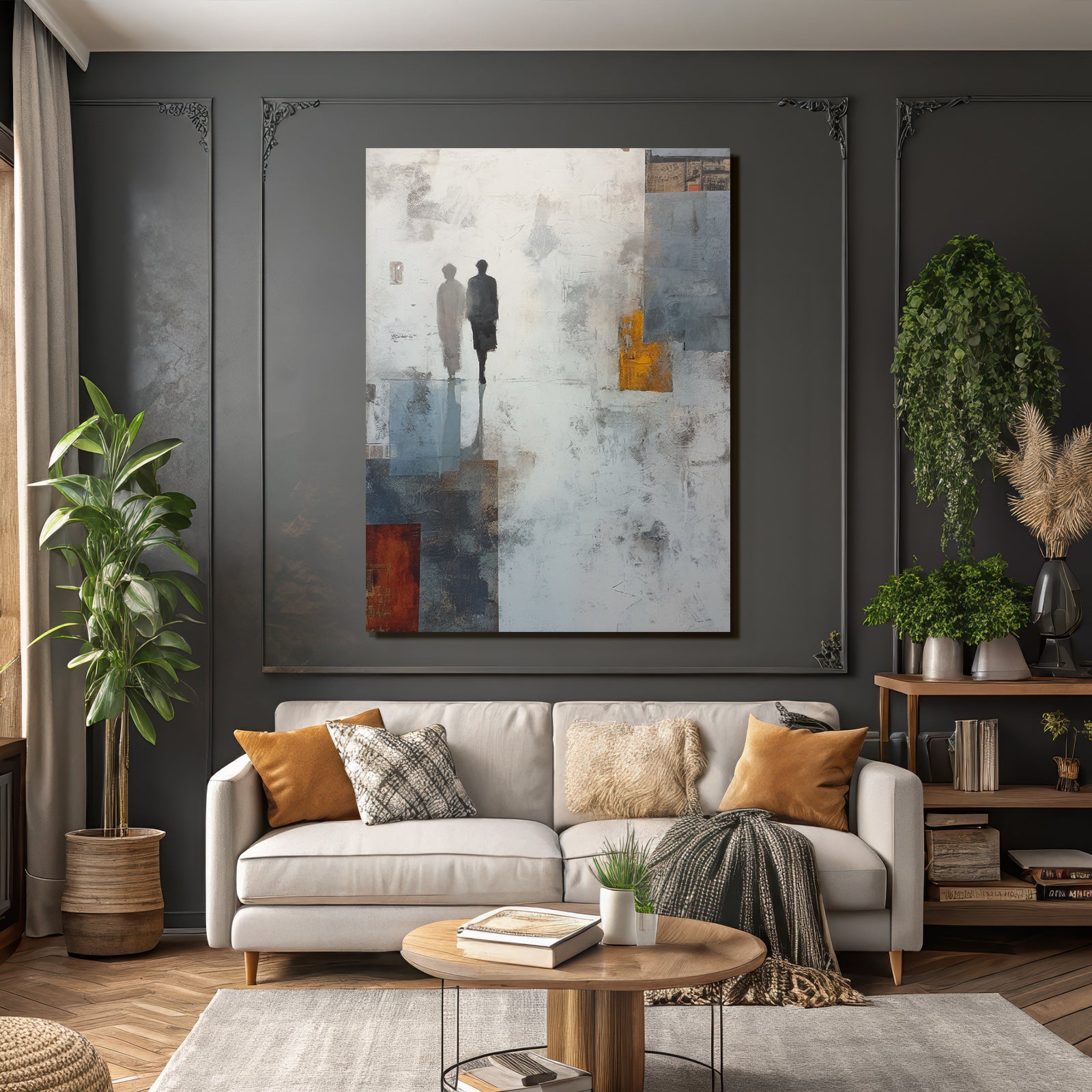 Mit dem Werk „„ Abstraktes Gemalde Figuren““ im Stil Industrial gestaltest Du Dein Wartezimmer oder Deine Hotel-Lobby eindrucksvoll und modern – auf Stoff im FameFrame.
