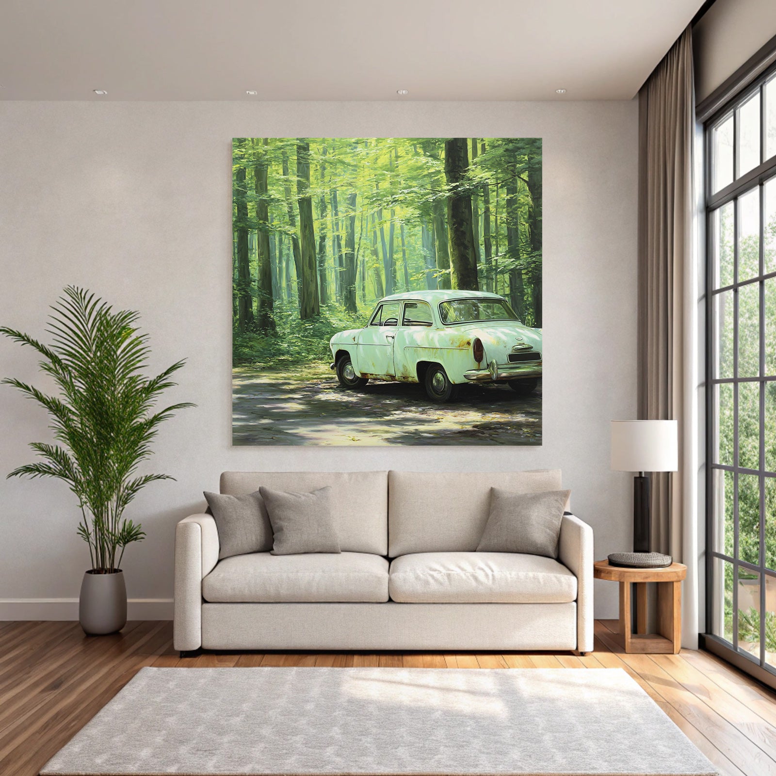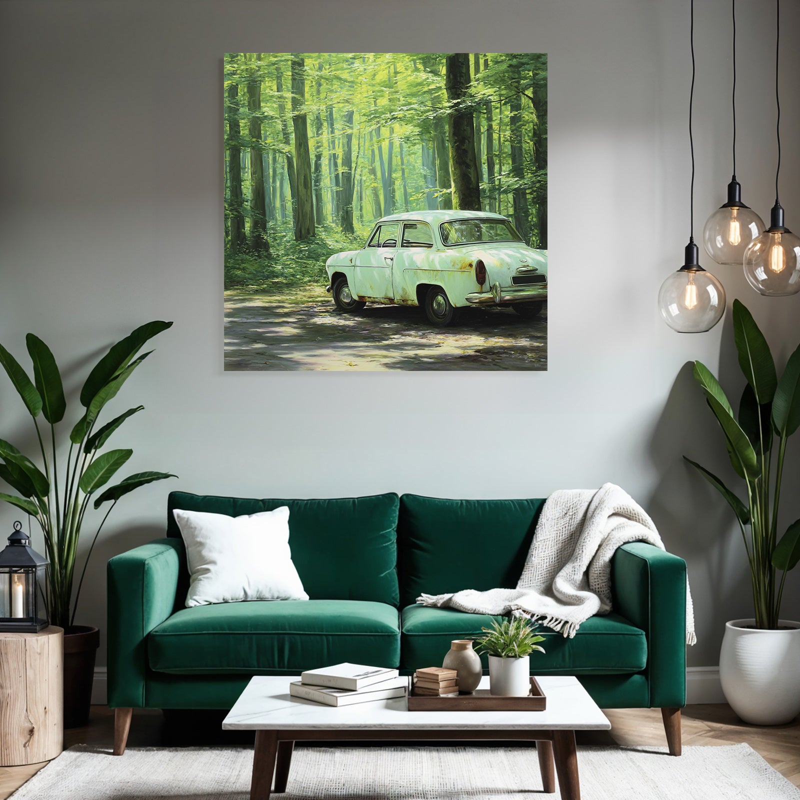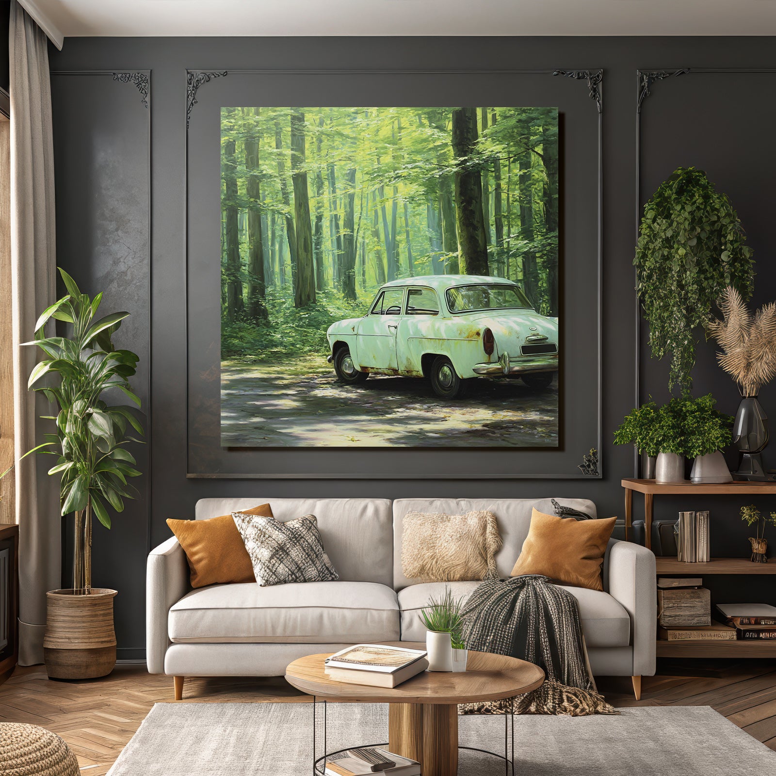 „Alte Rostige Auto Im Wald Unter Lichtstrahlen“ im Stil Dünen und Heide sorgt für stilvolle Ruhe im Schlafzimmer oder inspirierende Energie im Büro – perfekt im FameFrame™ inszeniert.