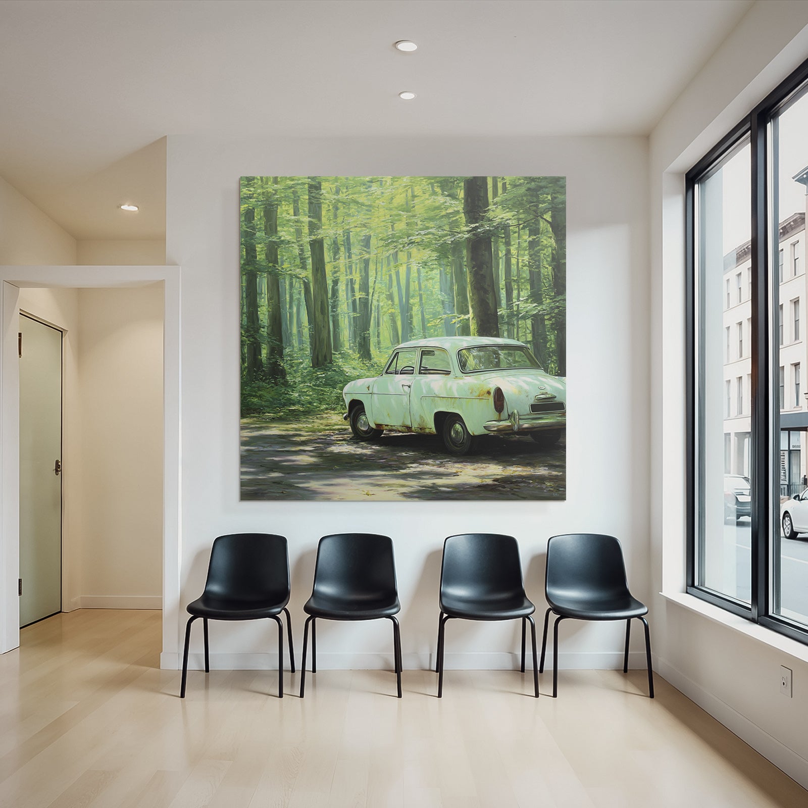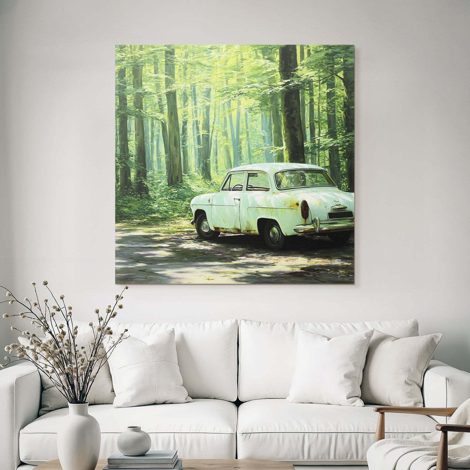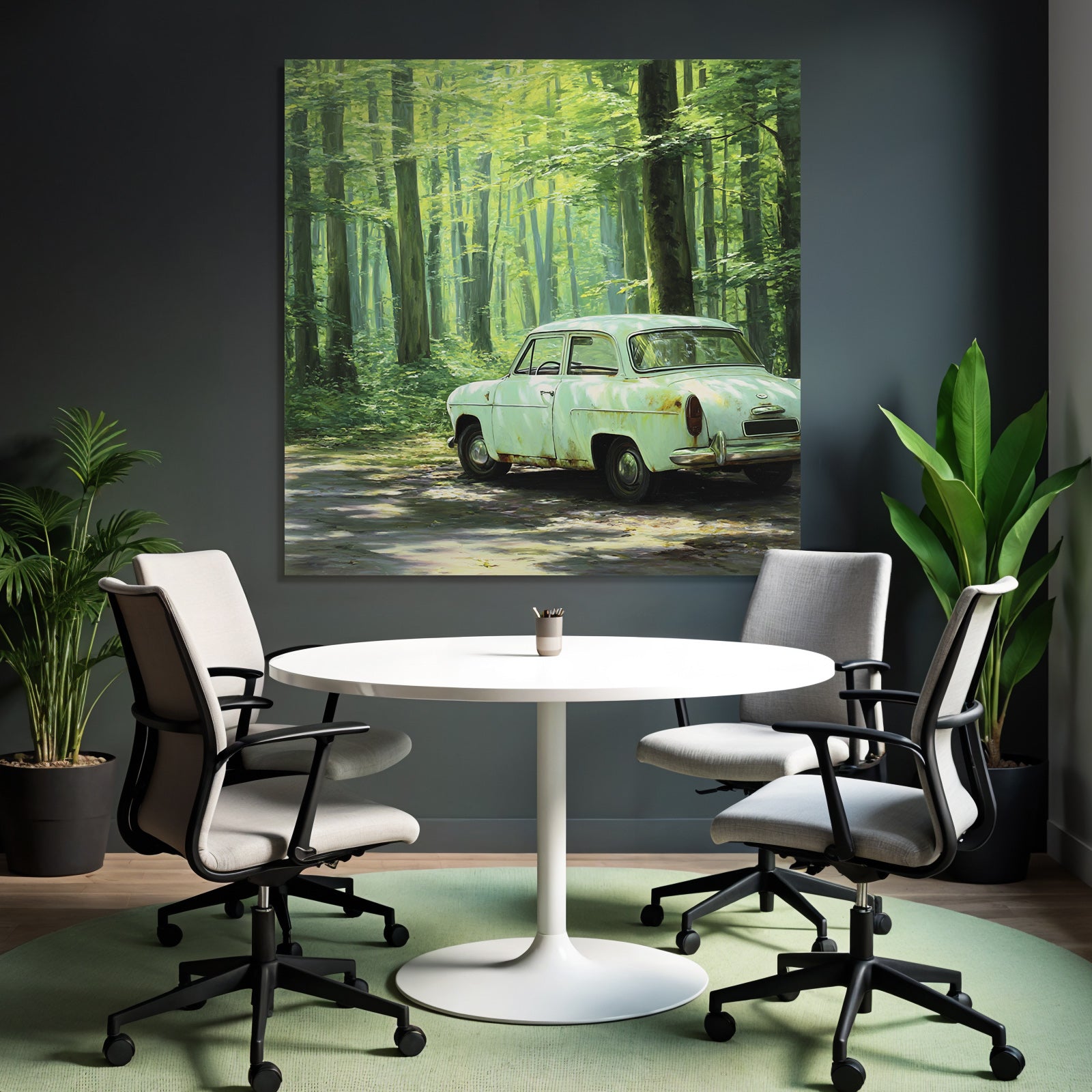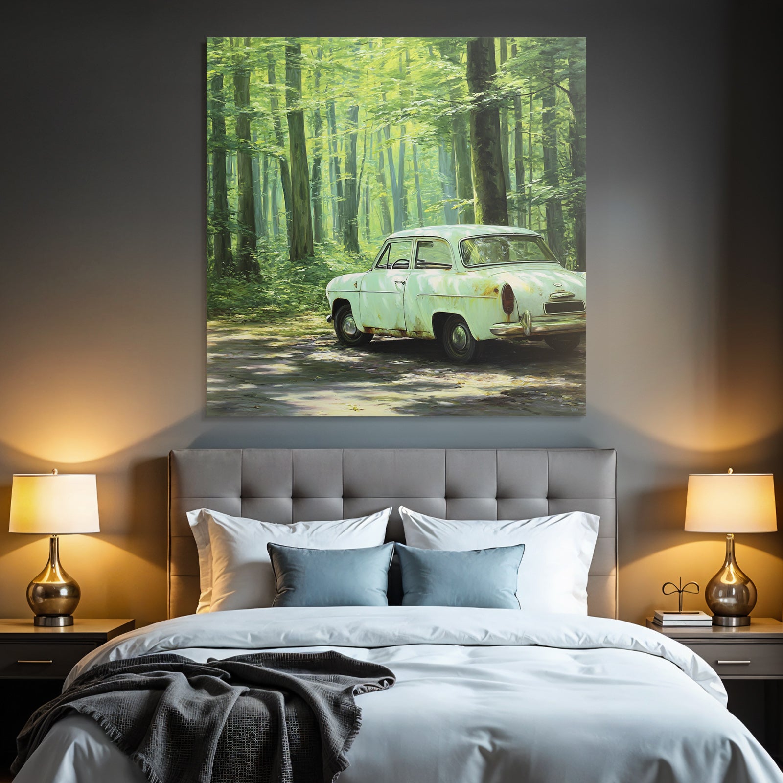 „Alte Rostige Auto Im Wald Unter Lichtstrahlen“ im Stil Dünen und Heide sorgt für stilvolle Ruhe im Schlafzimmer oder inspirierende Energie im Büro – perfekt im FameFrame™ inszeniert.