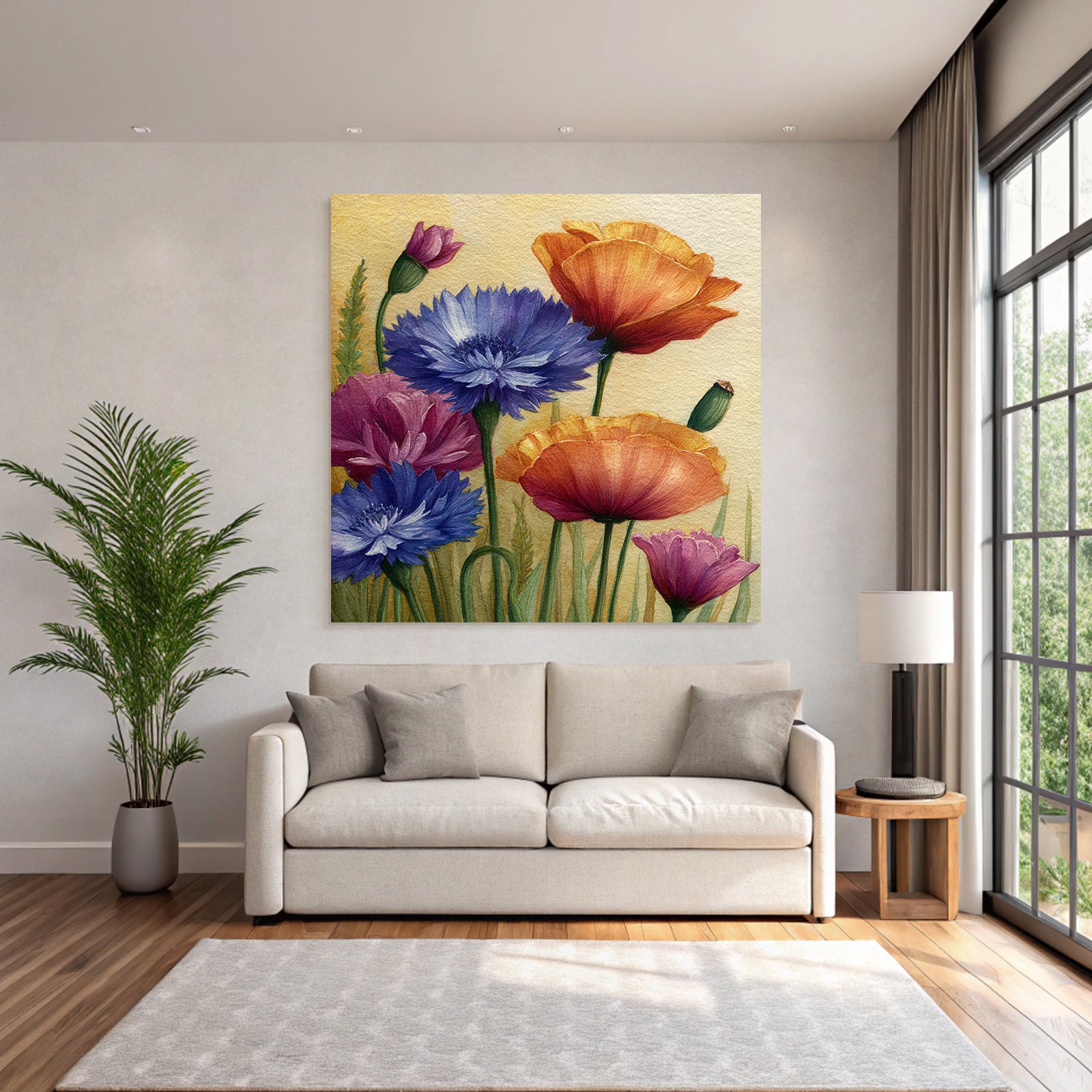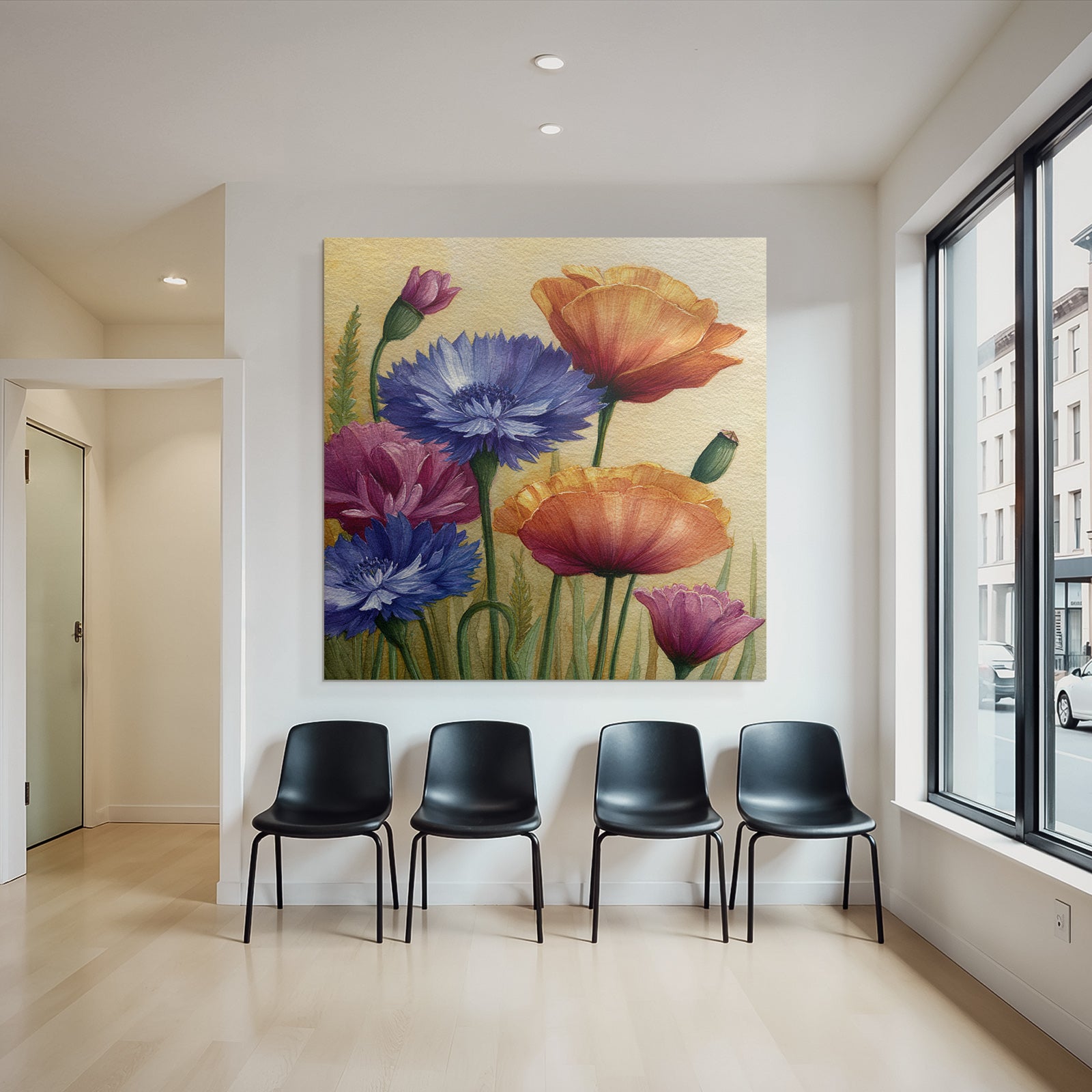 Die Kombination aus dem Motiv „Aquarell Mit Blaün Violetten Orangen Und Pinken Farben“ und dem Stil Mohn Pusteblume Kornblume schafft eine Brücke zwischen Klassik und Moderne. Der FameFrame vollendet dieses Zusammenspiel perfekt.