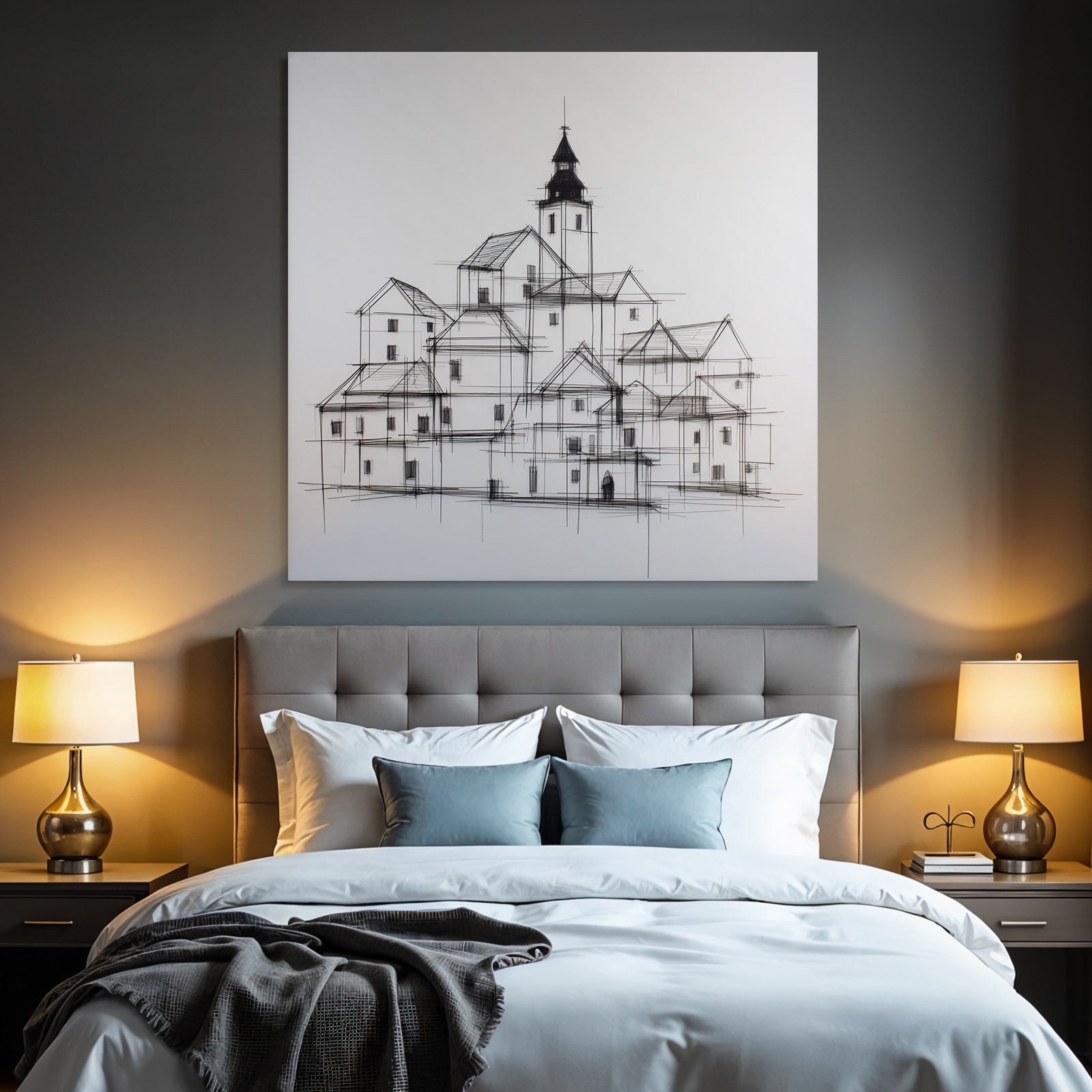 Mit Minimalistisch-Elementen und klarer Wirkung verleiht „Architekturzeichnung Stilisierte Dorfansicht“ Deinem Raum Persönlichkeit – eingerahmt im exklusiven FameFrame™.