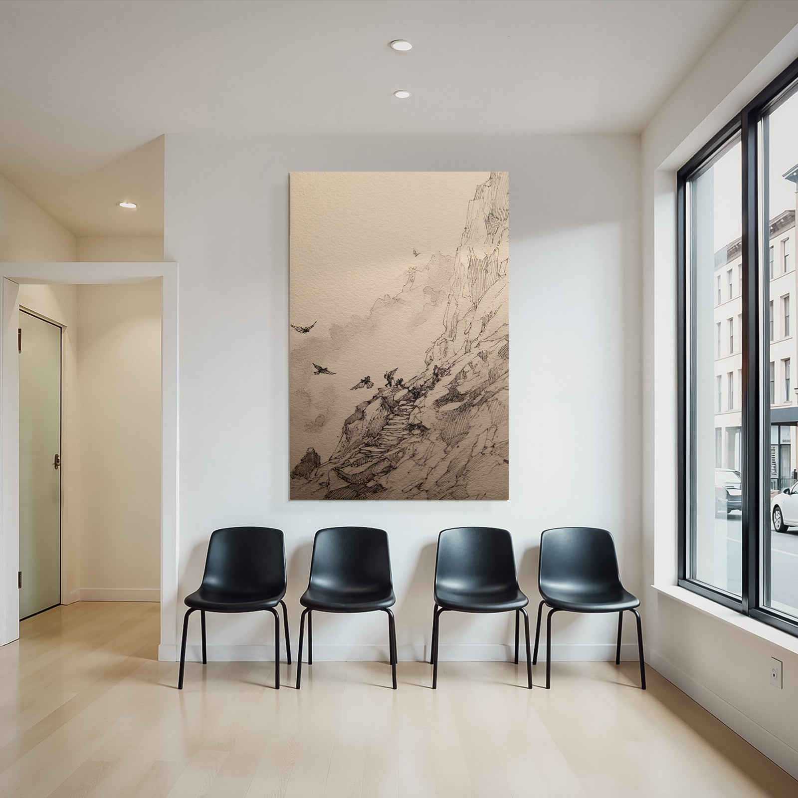 Verleihe Lobby, Wartezimmer oder Studio eine besondere Atmosphäre mit „Berglandschaft Hiker Abenteür Illustration“ im Stil Illustration und Zeichnung – eindrucksvoll im FameFrame präsentiert.