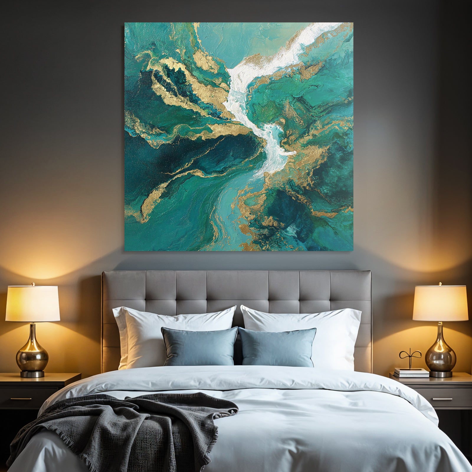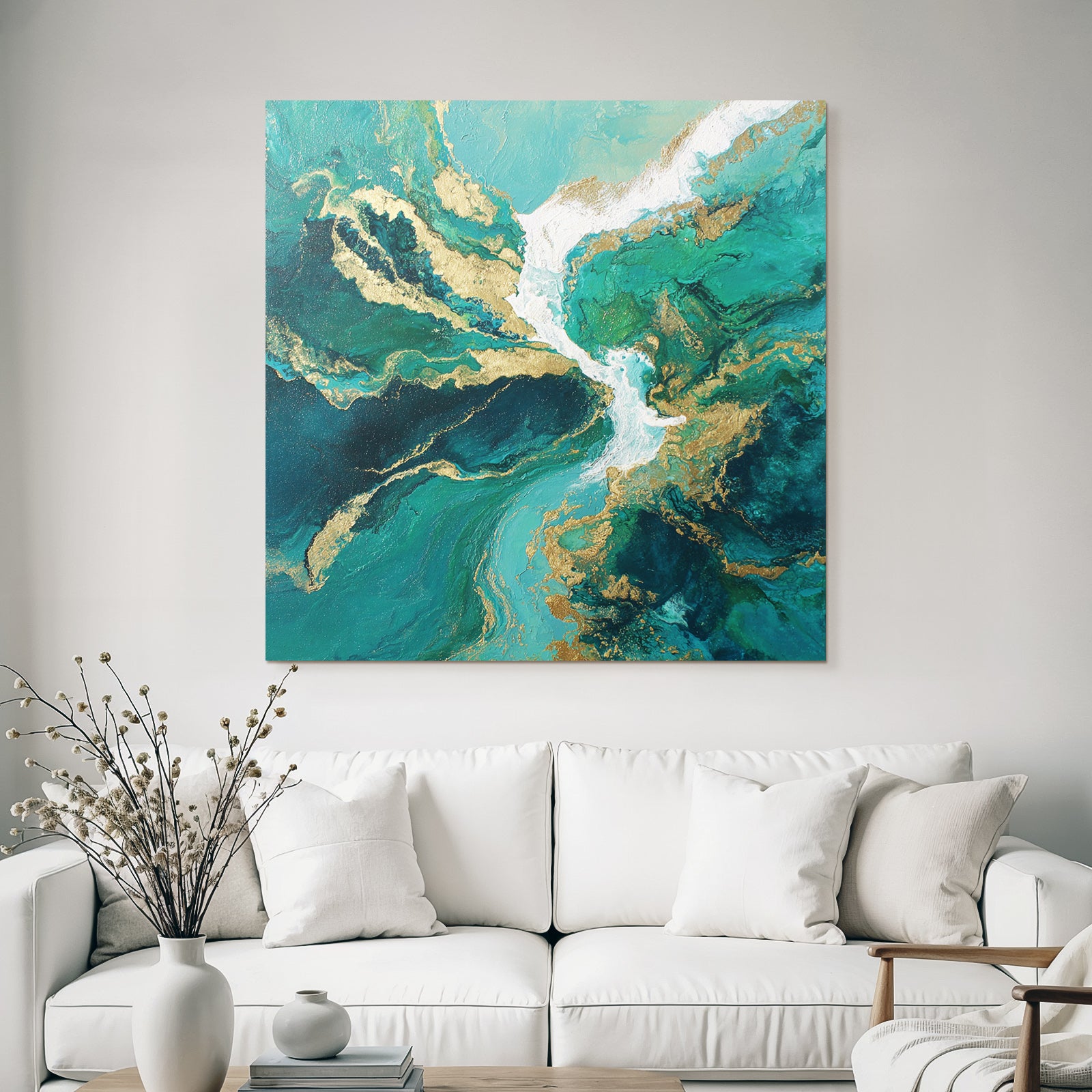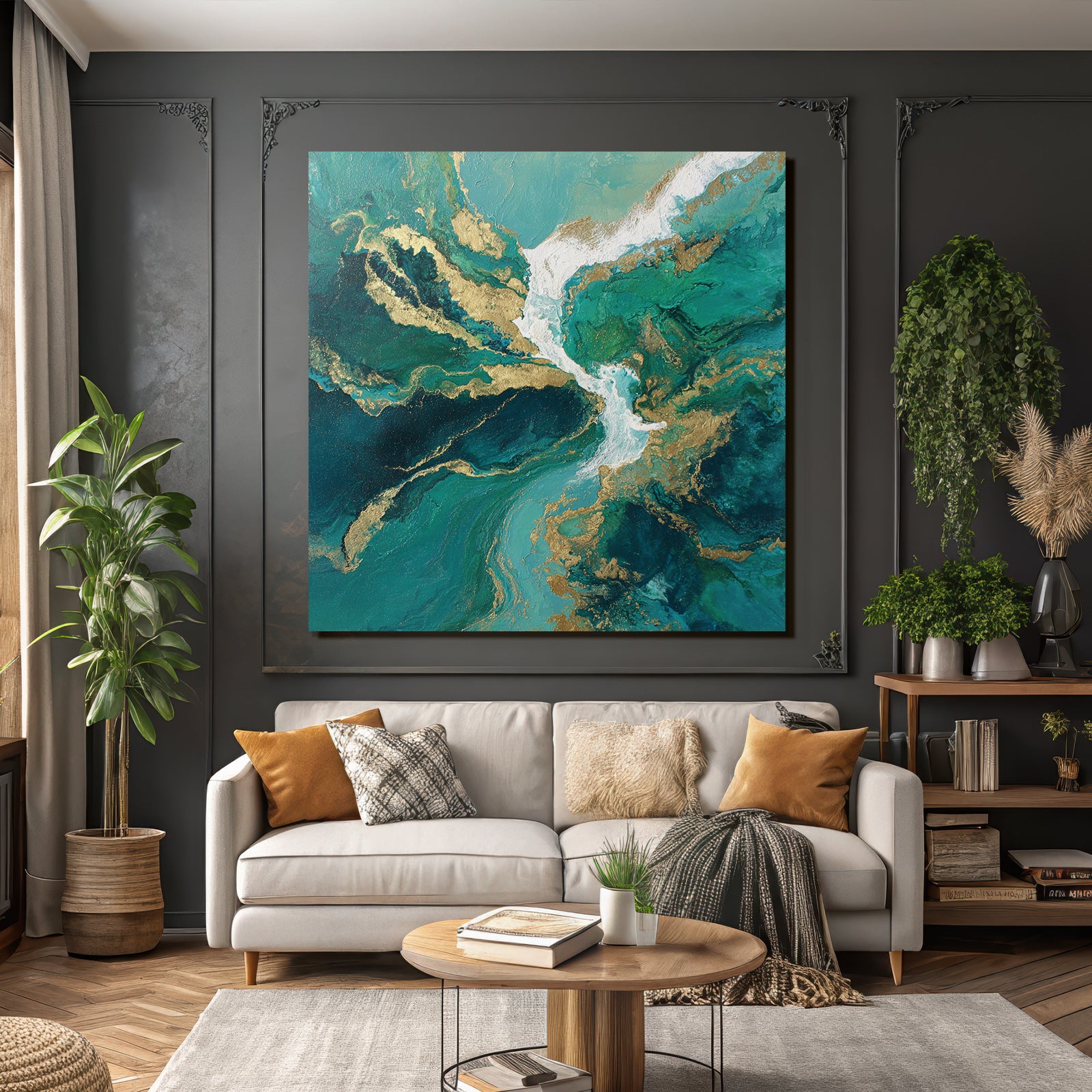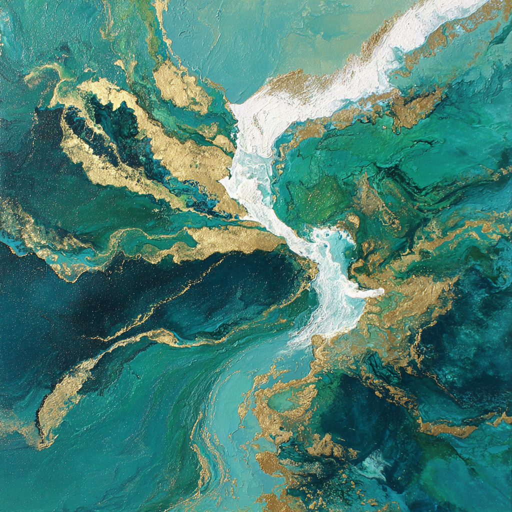 Ein einzigartiges Kunstwerk der Produktlinie FameFrame mit dem Titel „Bild Türkis Blaugrüne Goldwirbel“, im Stil Abstrakt.