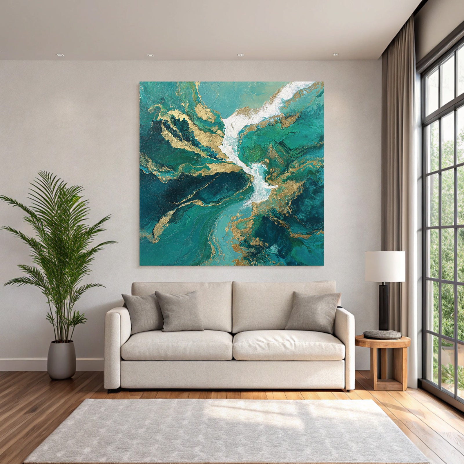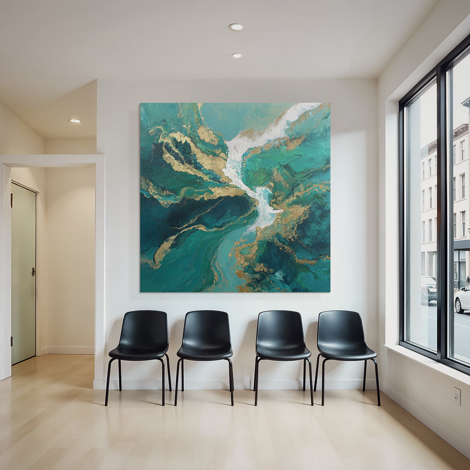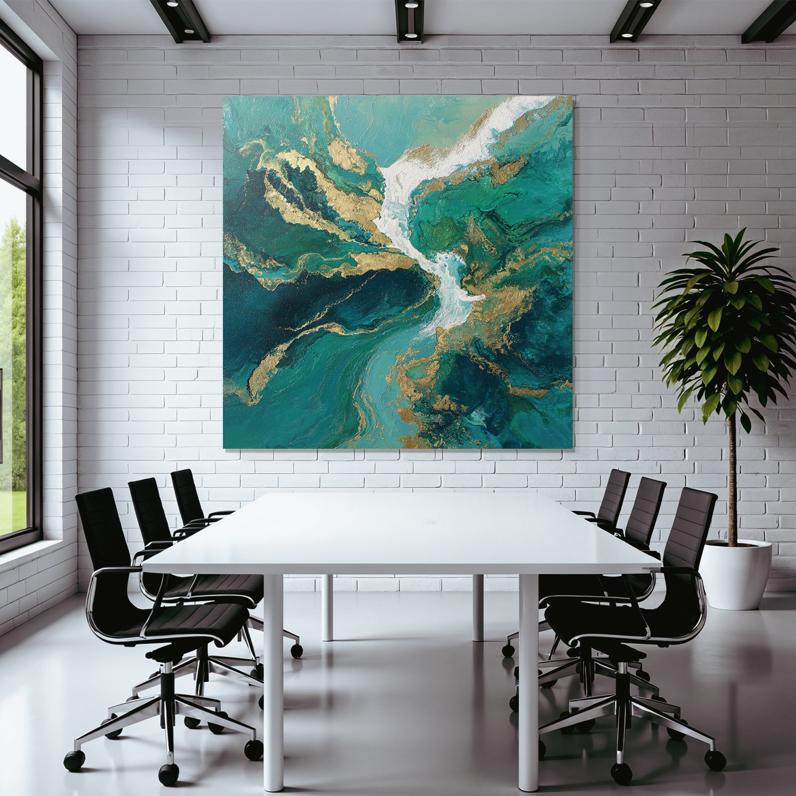Ein einzigartiges Kunstwerk der Produktlinie FameFrame mit dem Titel „Bild Türkis Blaugrüne Goldwirbel“, im Stil Abstrakt.