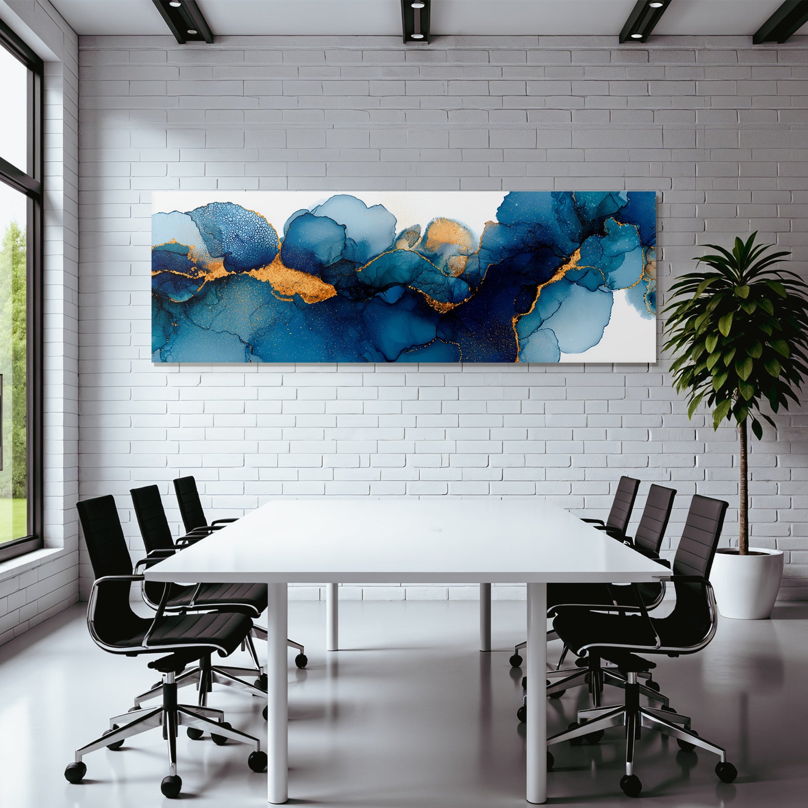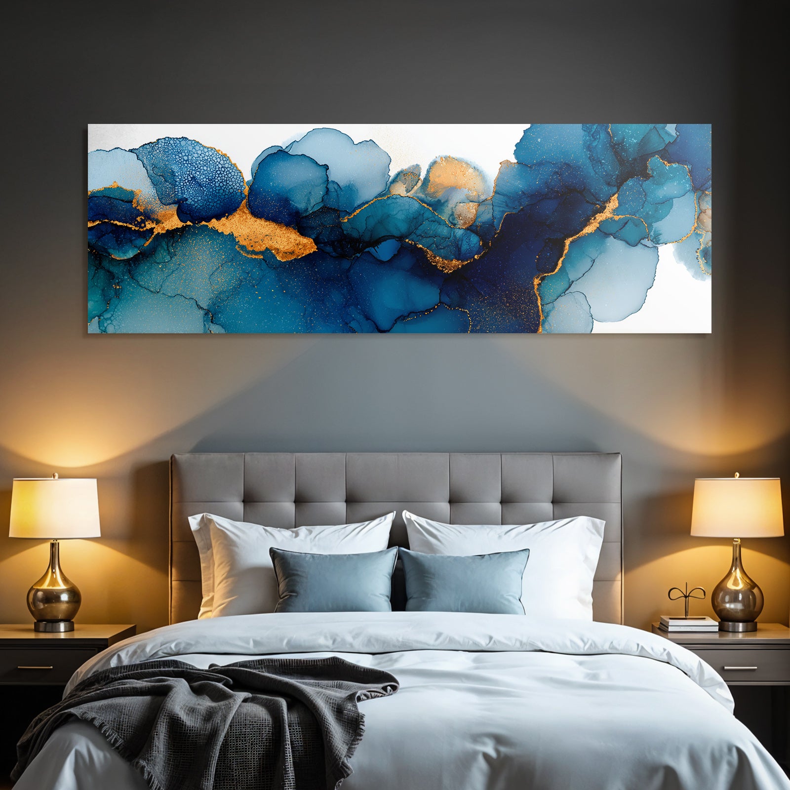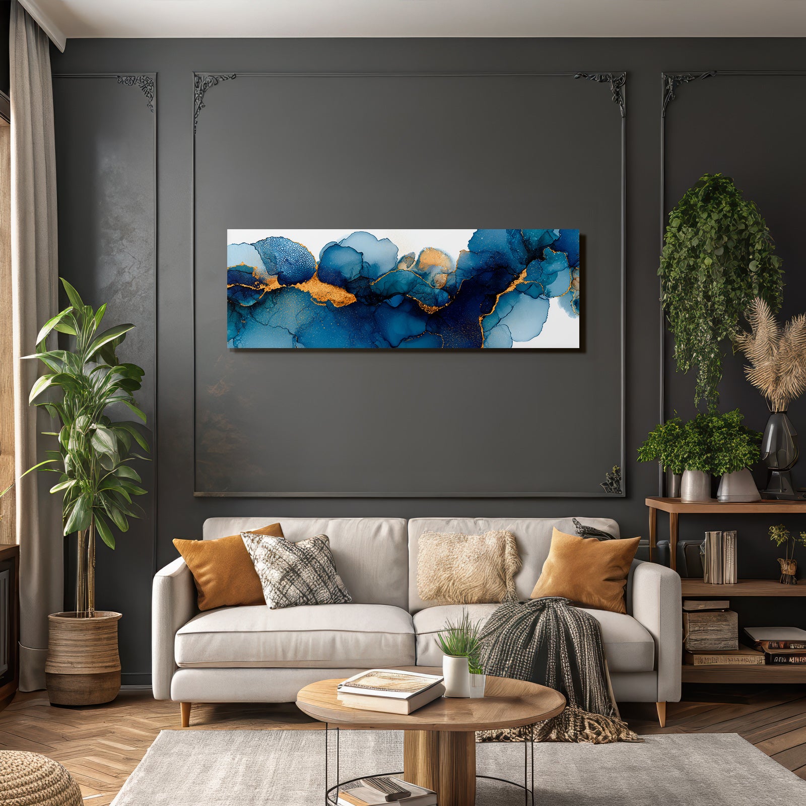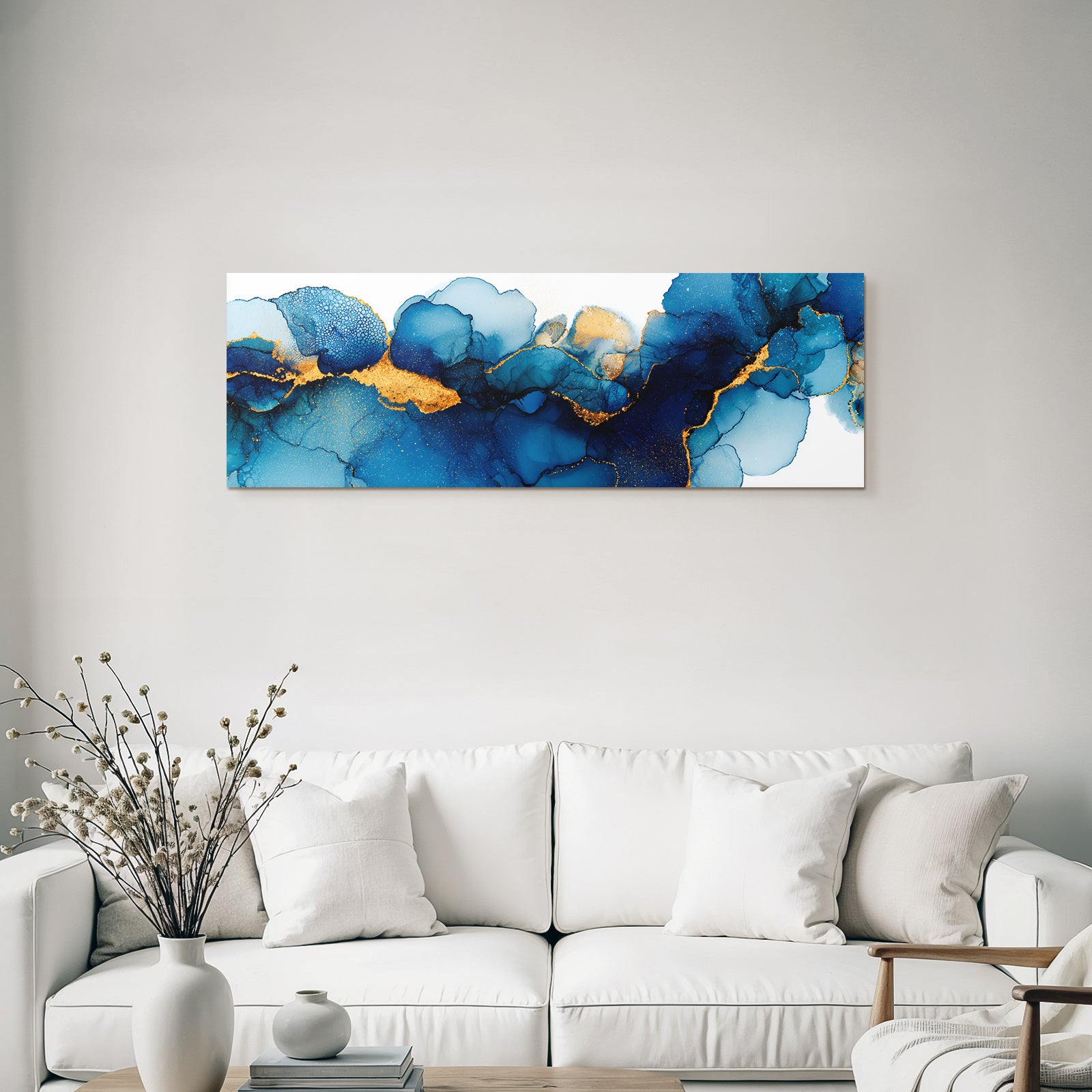 Bringen Sie frischen Wind in Ihr Studio oder Ihren Kreativraum. „Blaü Und Goldene Farbflusskunst“ als Textildruck im Stil Abstrakt inspiriert im FameFrame zu neuen Ideen.