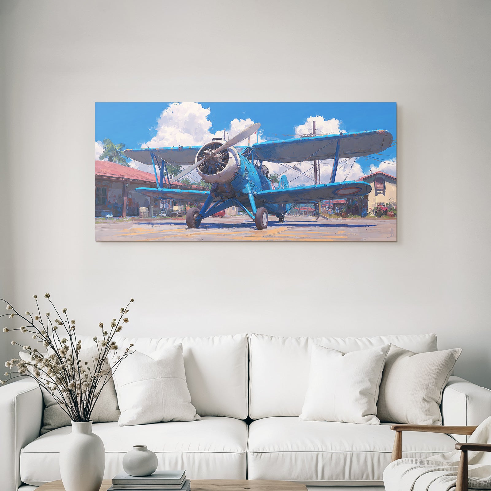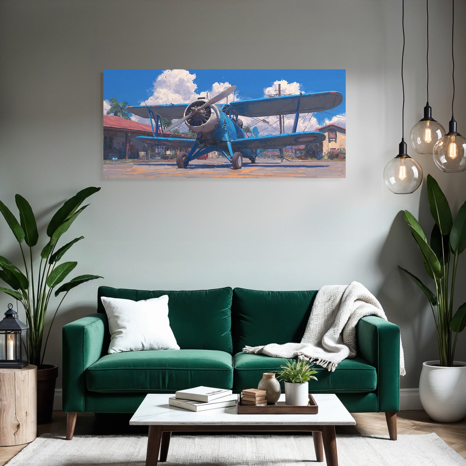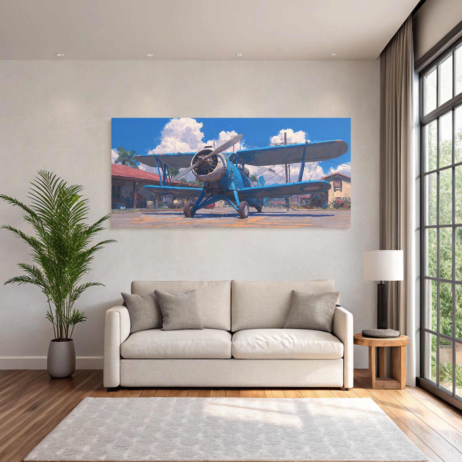 „Blaür Biplan Impressionistische Malerei Mit Palmen Und Blaüm Himmel“ verleiht Ihrem Raum Charakter. Die Anlehnung an den Stil Flugzeuge, kombiniert mit der schlichten Eleganz des FameFrame™, schafft eine einzigartige Atmosphäre.