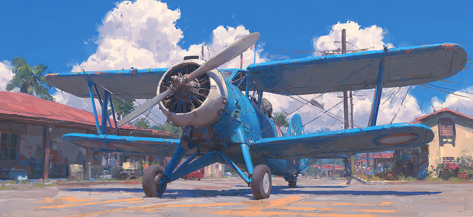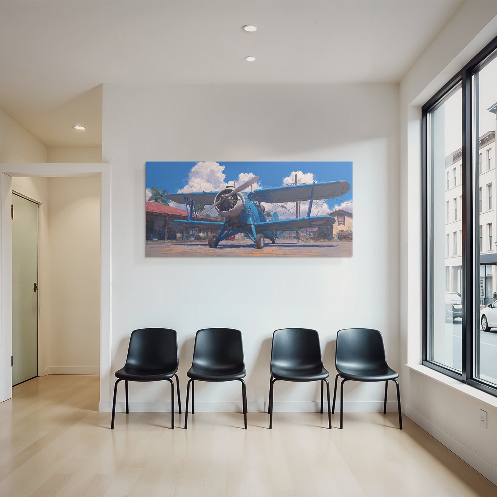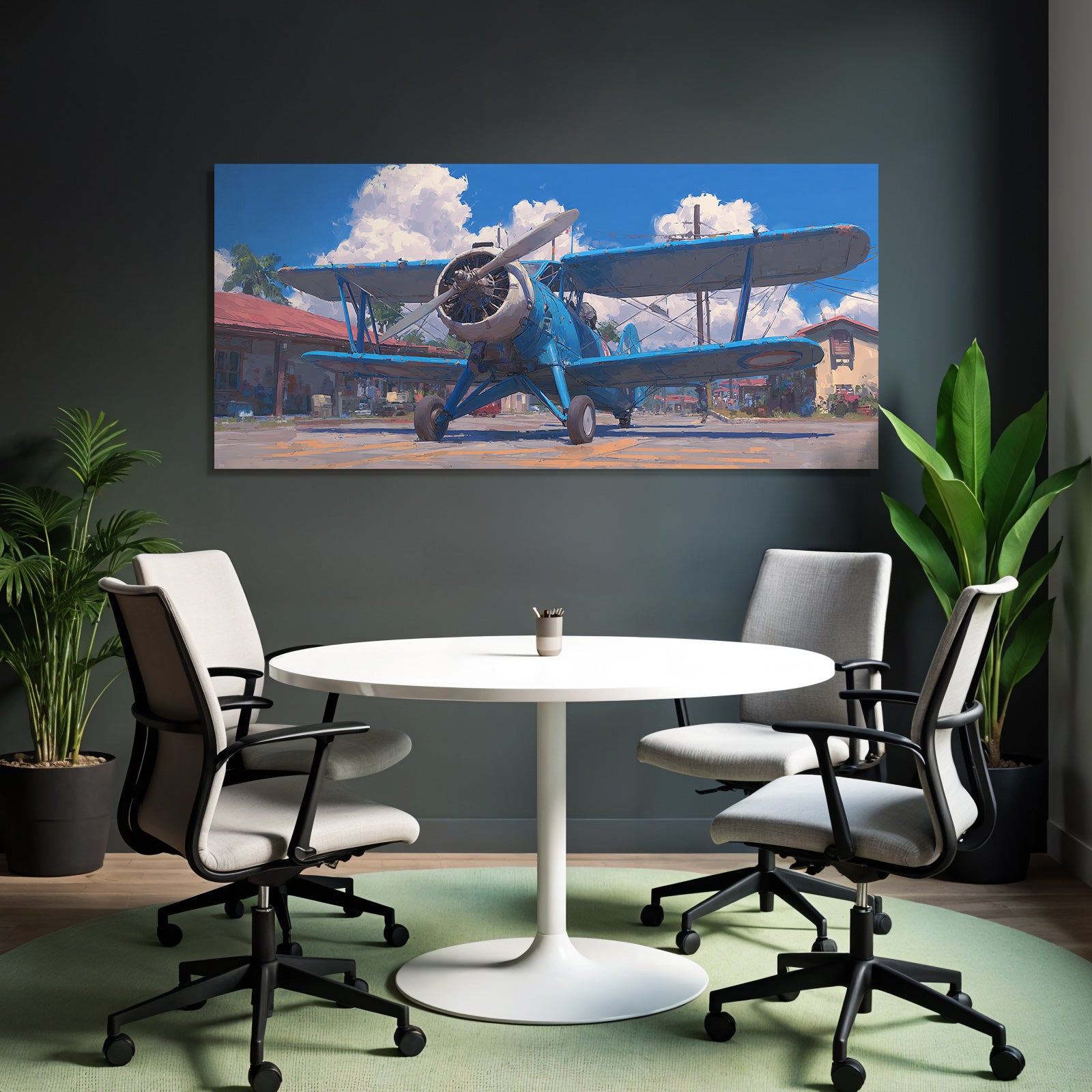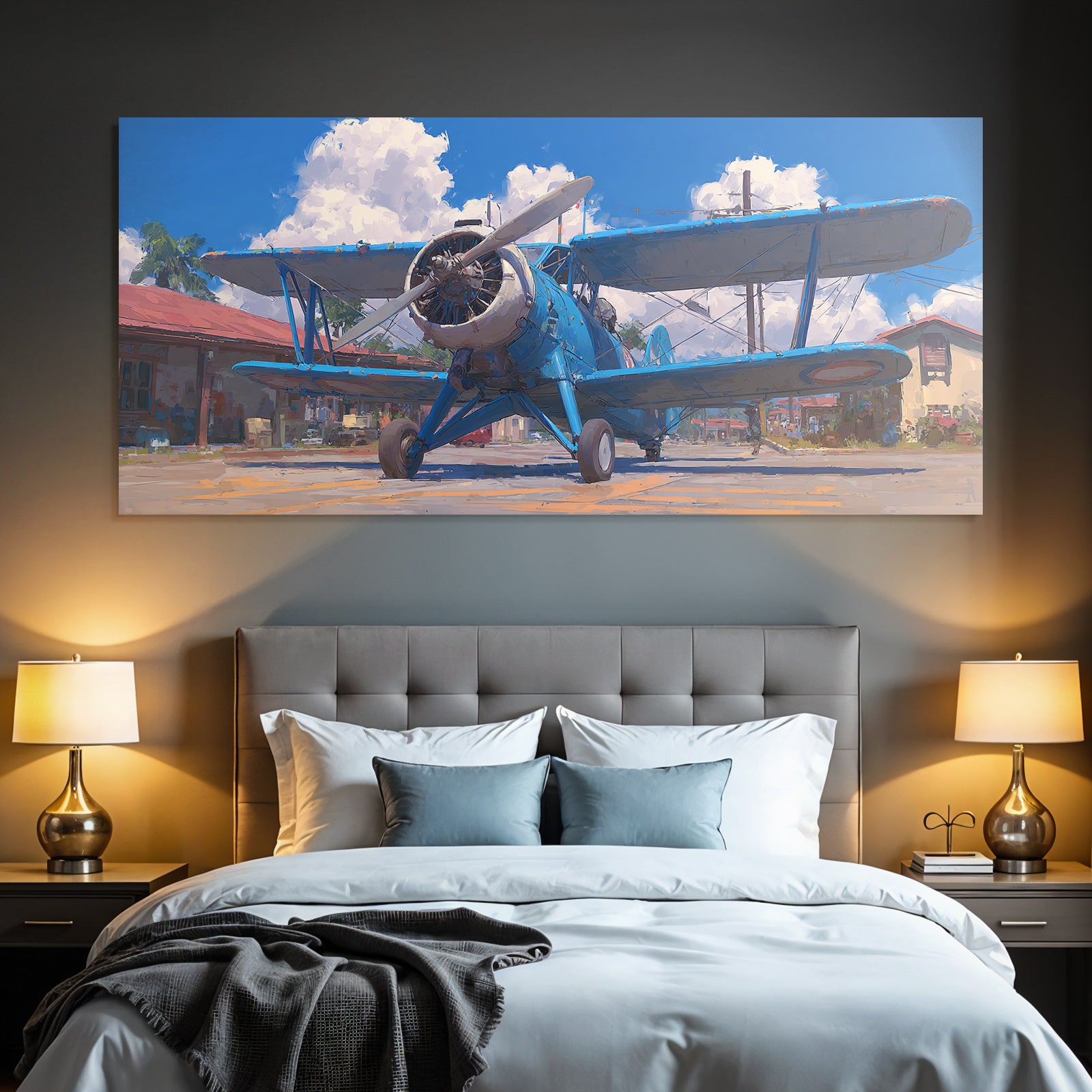 „Blaür Biplan Impressionistische Malerei Mit Palmen Und Blaüm Himmel“ verleiht Ihrem Raum Charakter. Die Anlehnung an den Stil Flugzeuge, kombiniert mit der schlichten Eleganz des FameFrame™, schafft eine einzigartige Atmosphäre.