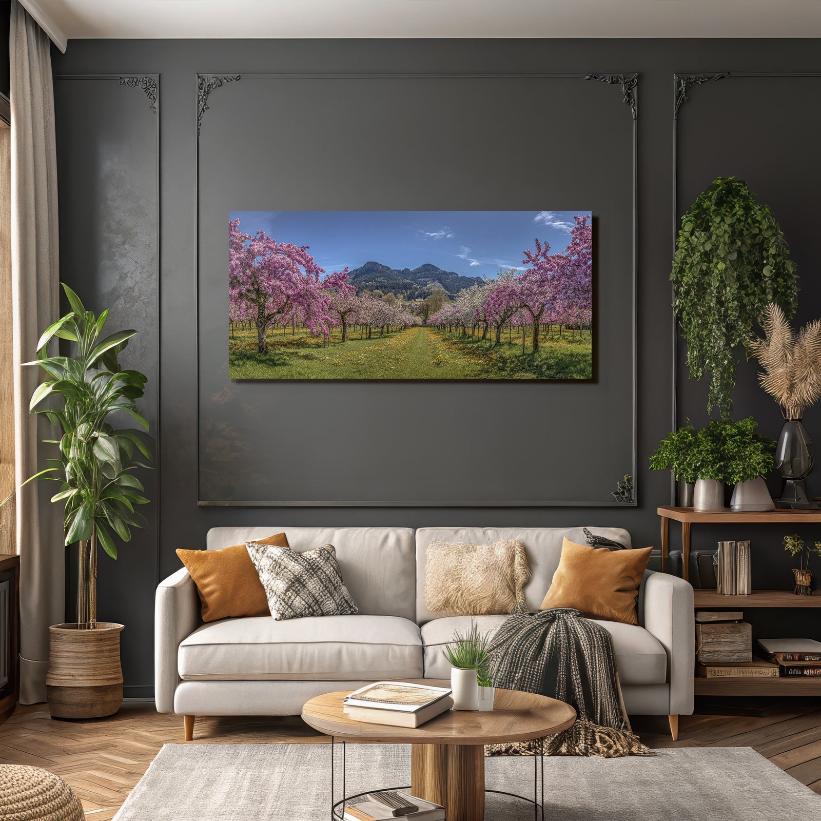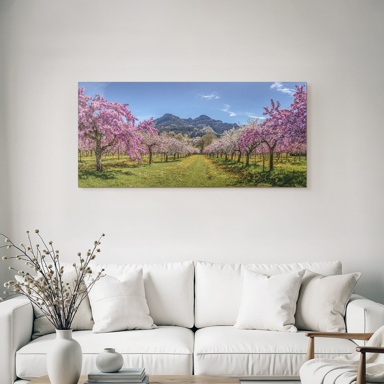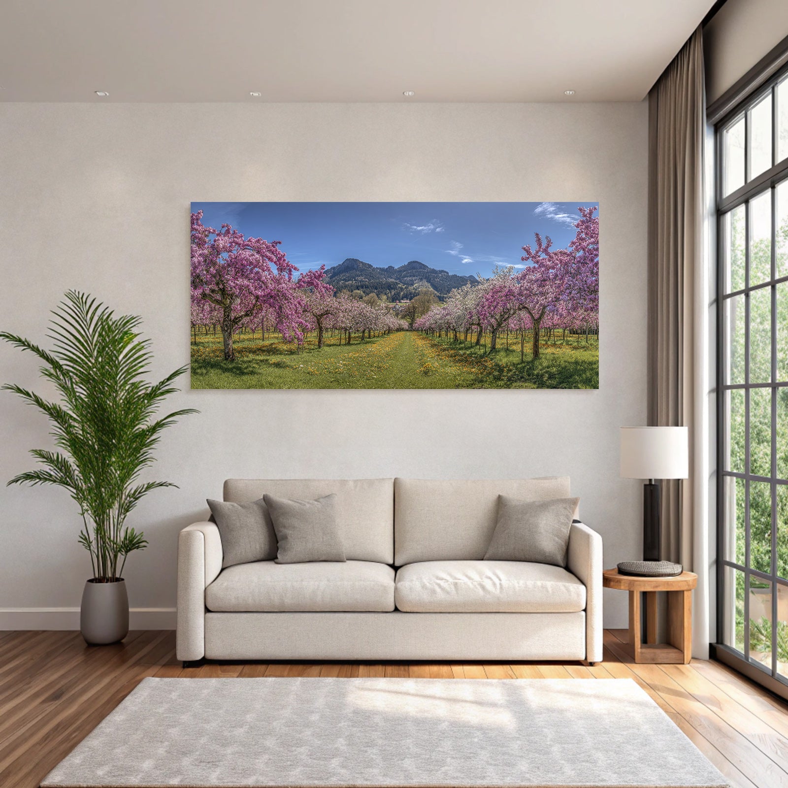 Erlebe Kunst im Stil Fruehling neu: „Blühende Bäume Berglandschaft Frühling“ wird durch den eleganten FameFrame zum Blickfang in jedem Raum.