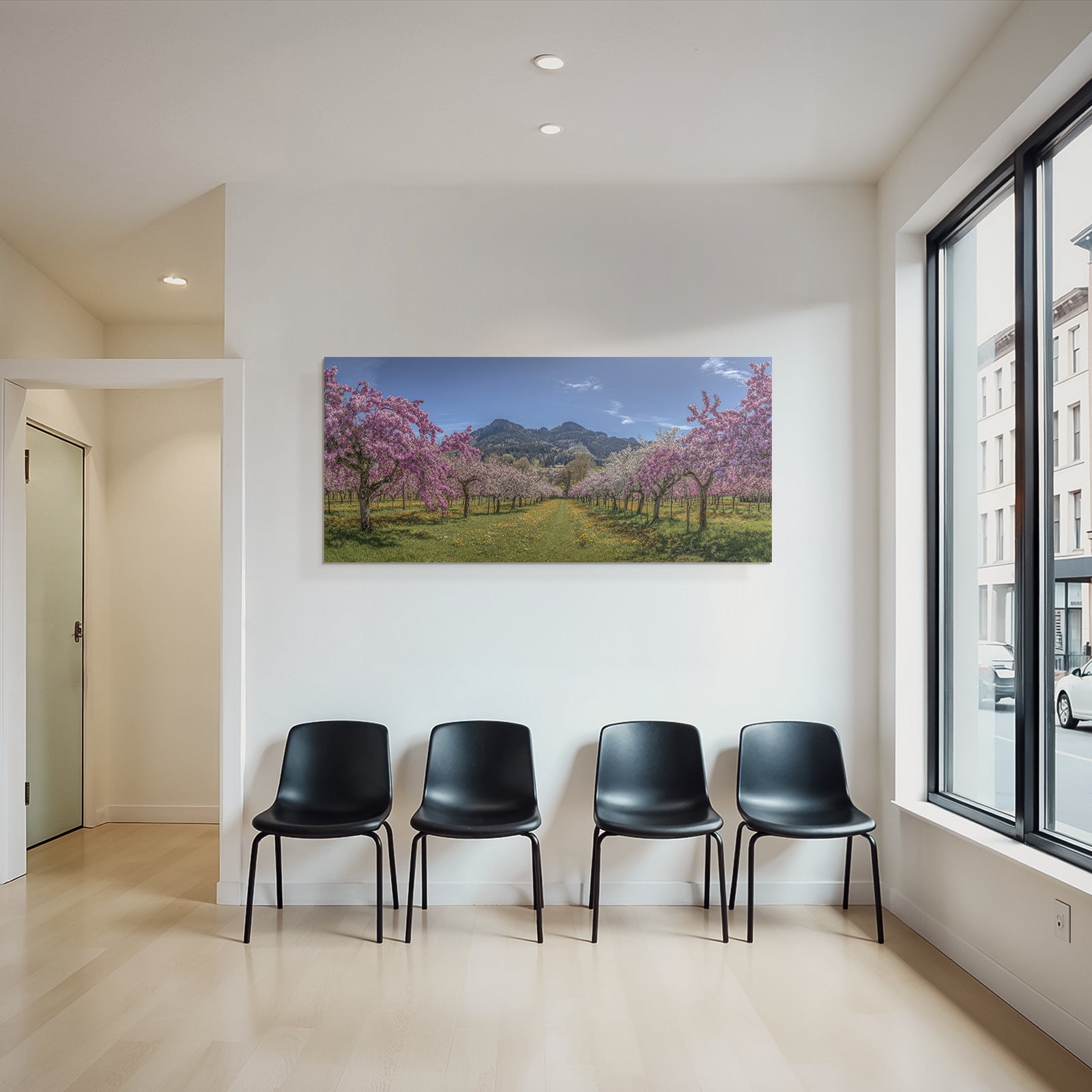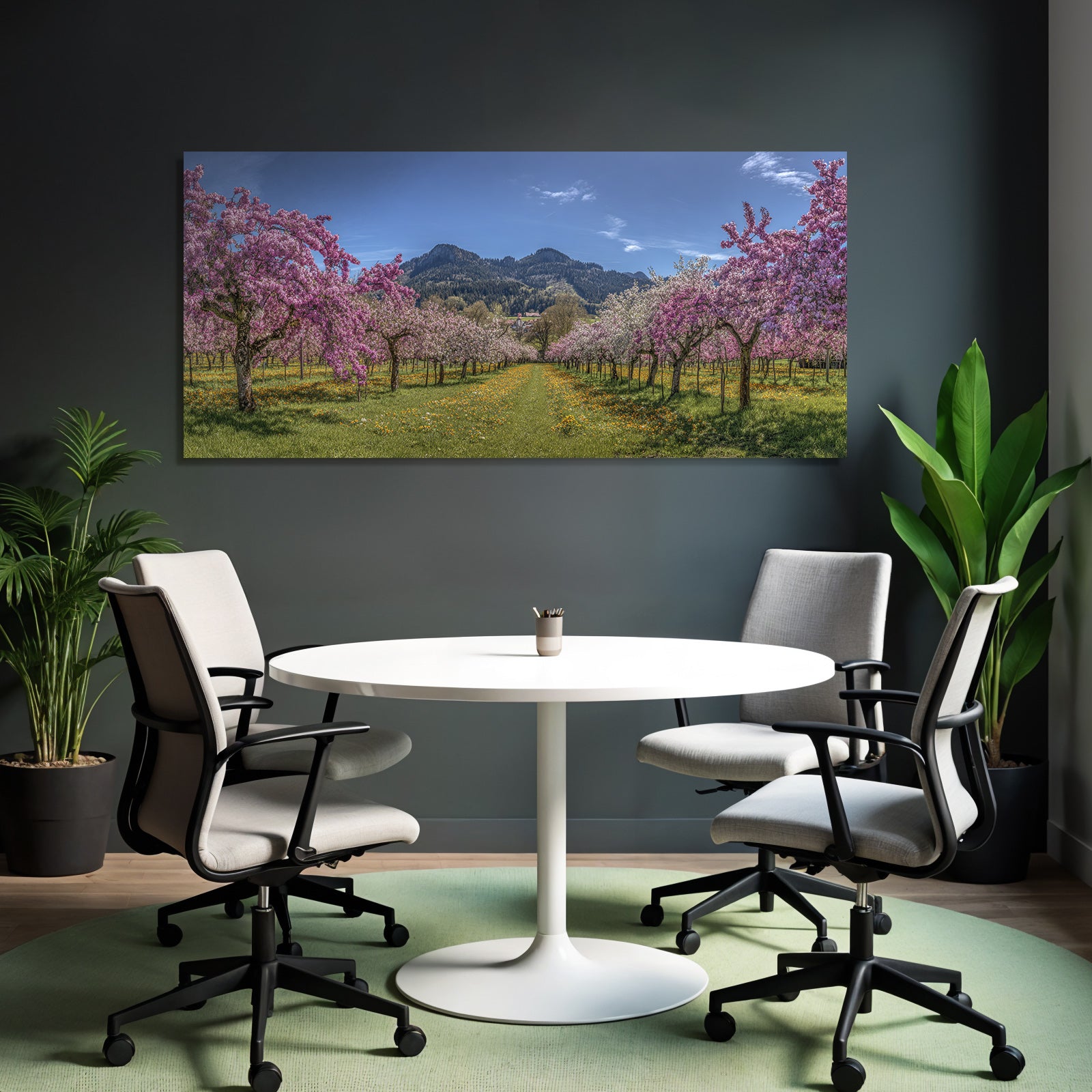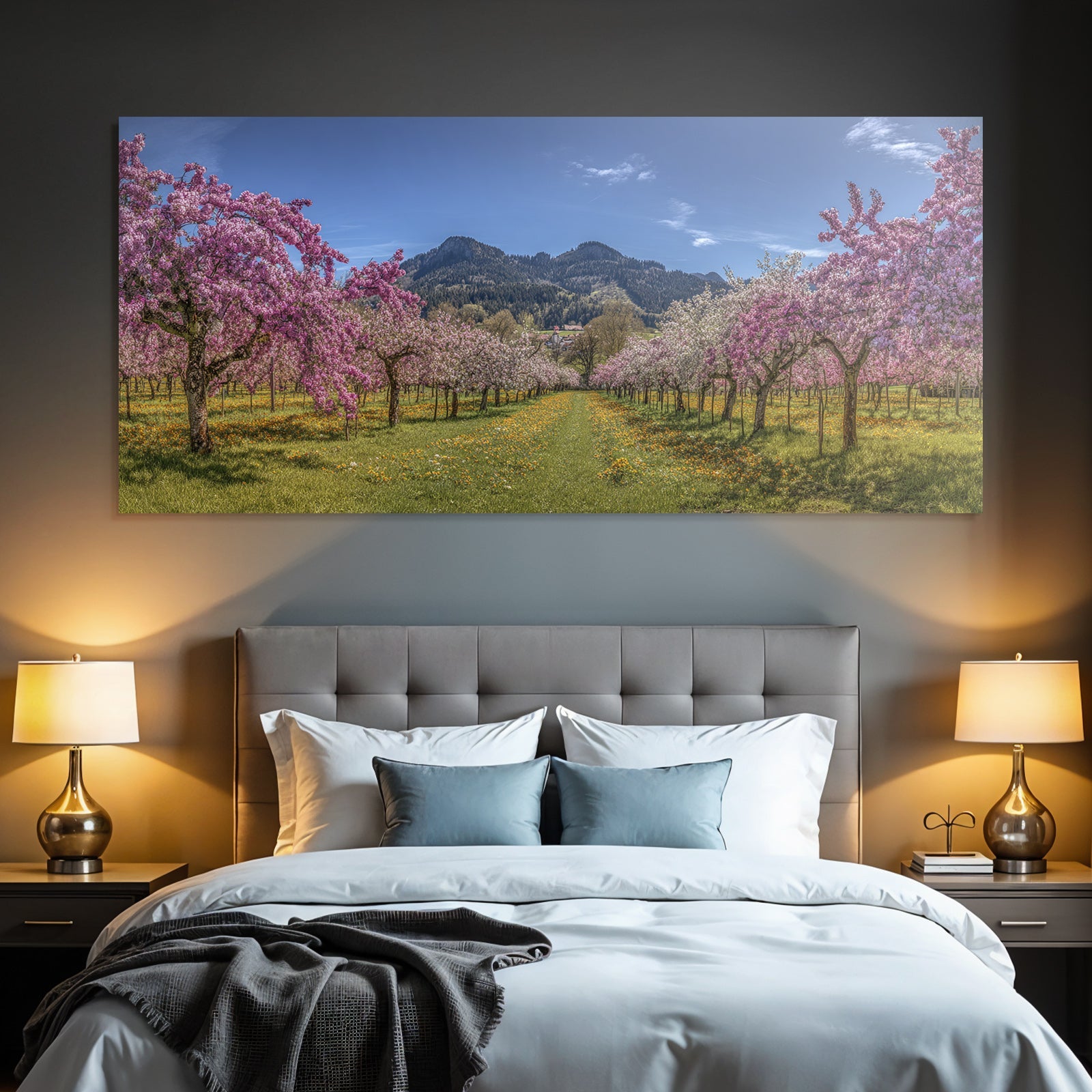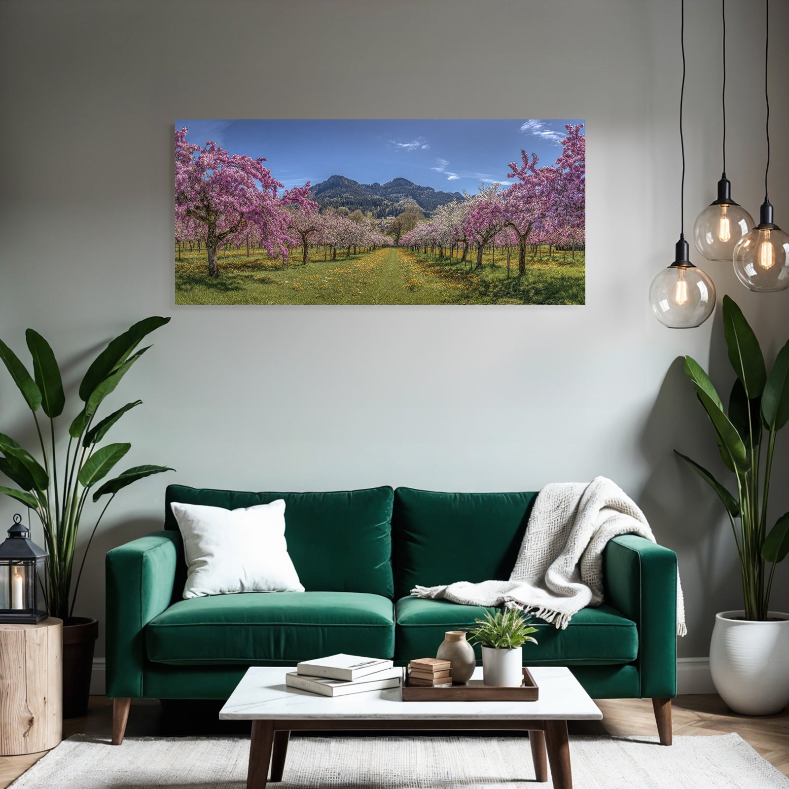 Erlebe Kunst im Stil Fruehling neu: „Blühende Bäume Berglandschaft Frühling“ wird durch den eleganten FameFrame zum Blickfang in jedem Raum.
