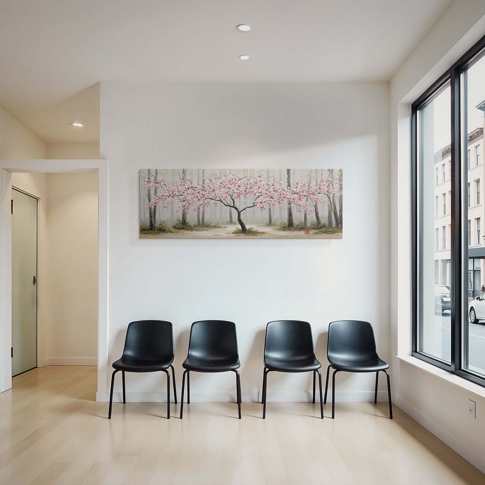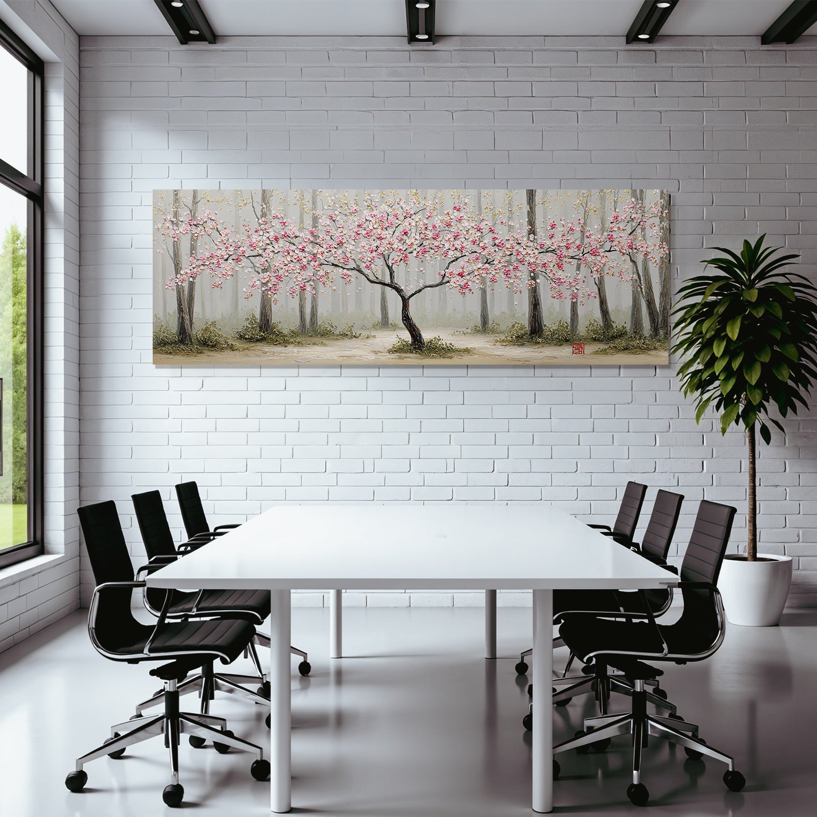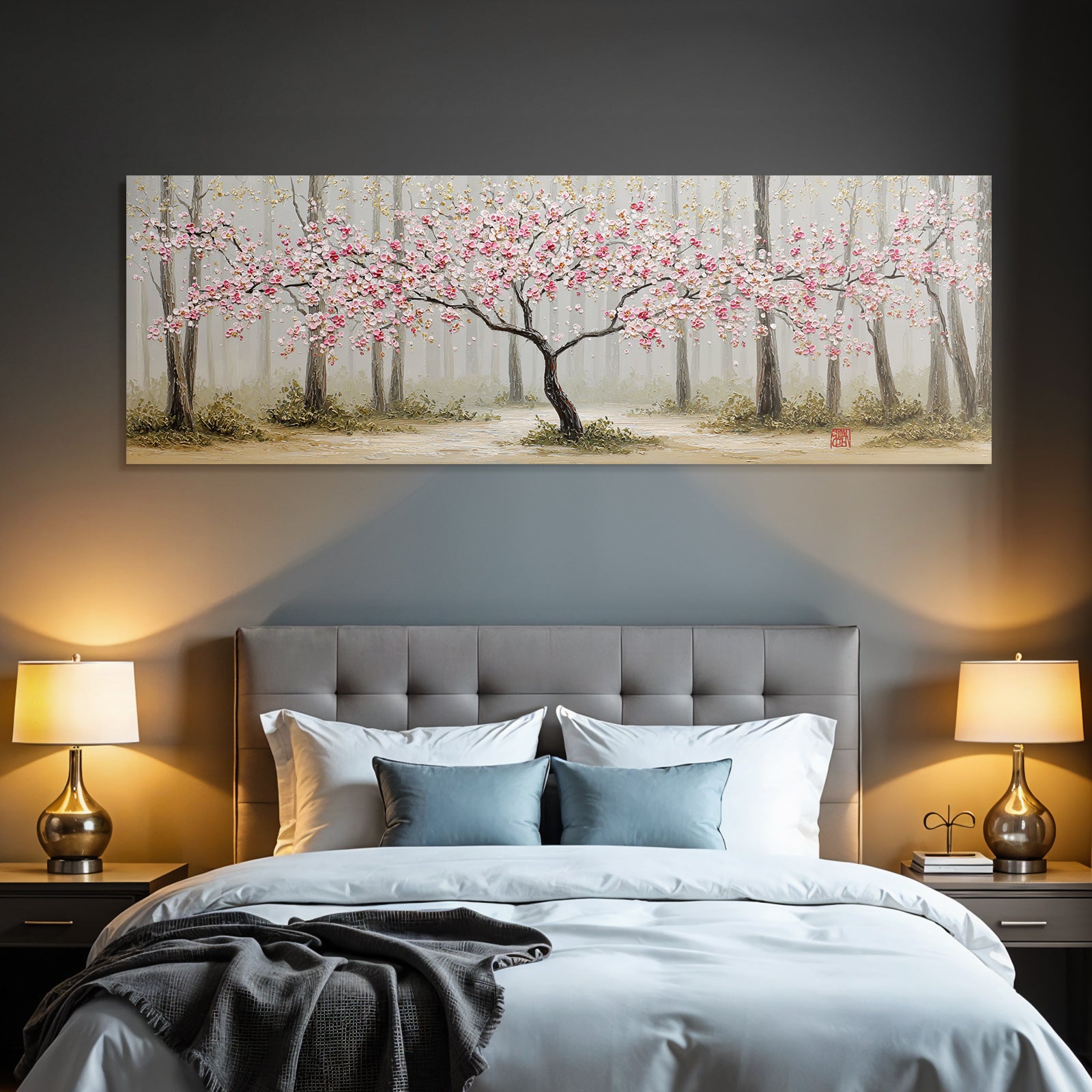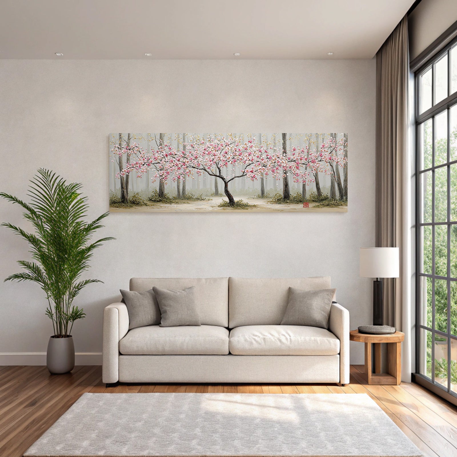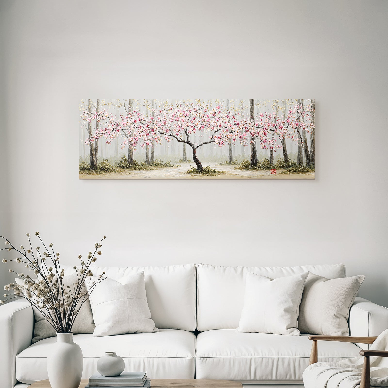 Bring die Atmosphäre von Japanische Zierkirsche in Dein Zuhause – mit „Blühender Baum Im Mystischen Wald“ auf Stoff im austauschbaren FameFrame.