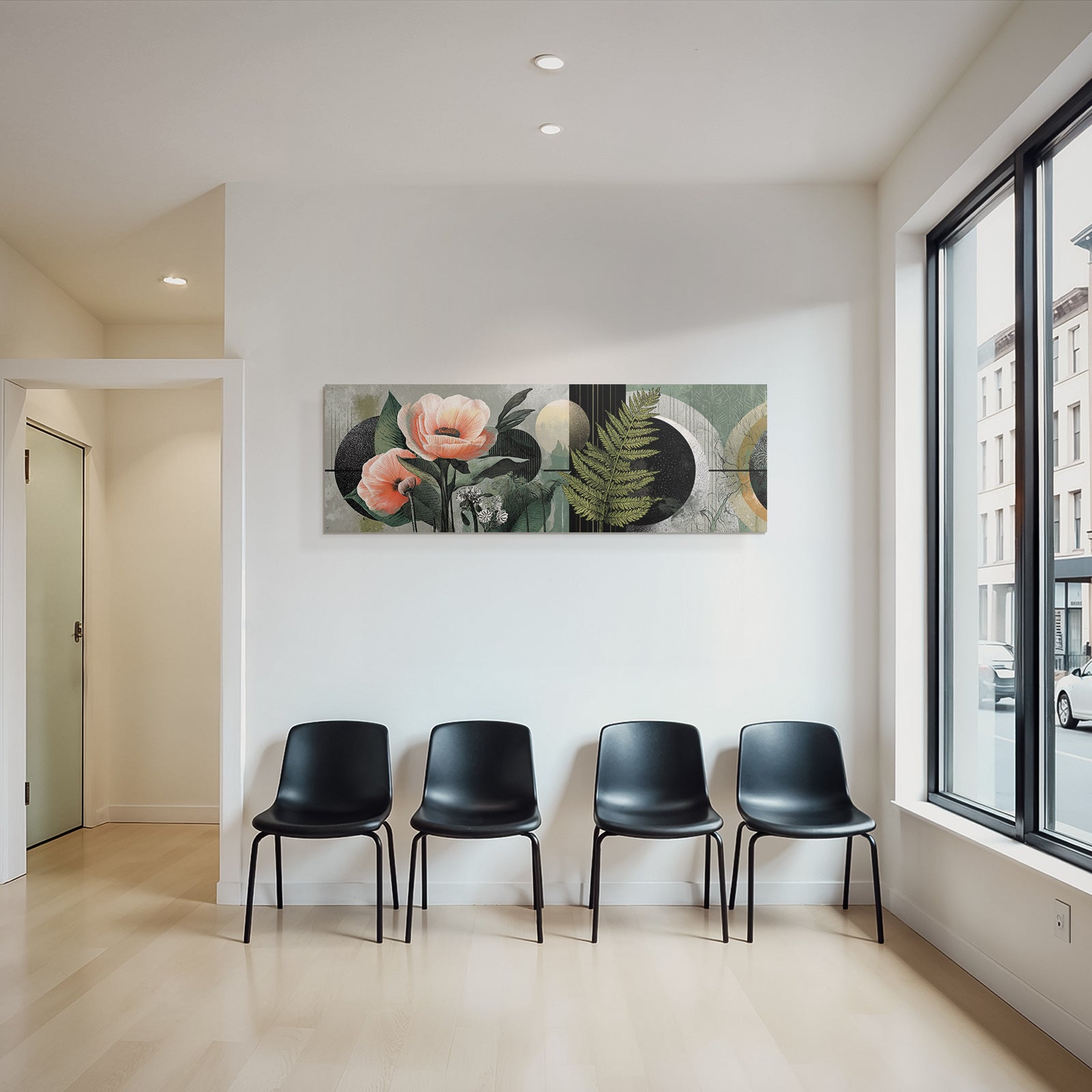 Ein Highlight für Wohnzimmer, Studio oder Empfangsbereich: „„Blumen Illustration Mit Geometrischen Hintergrund““ bringt den Stil Collagen auf Stoff – gespannt im edlen FameFrame.