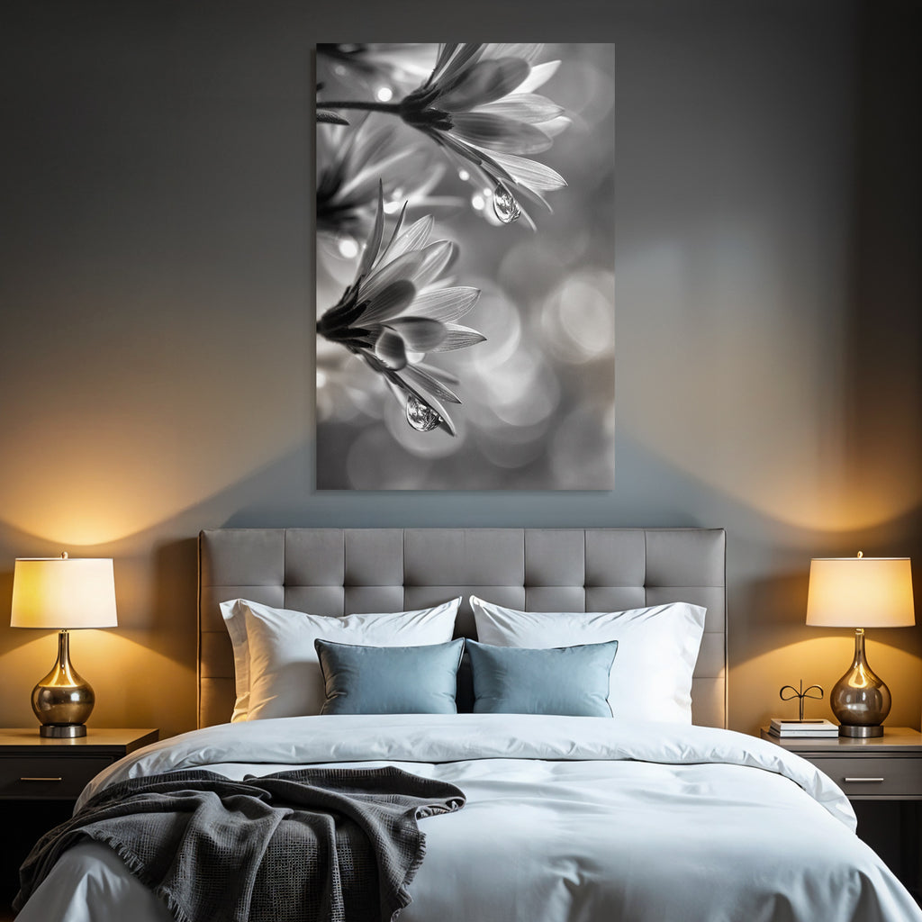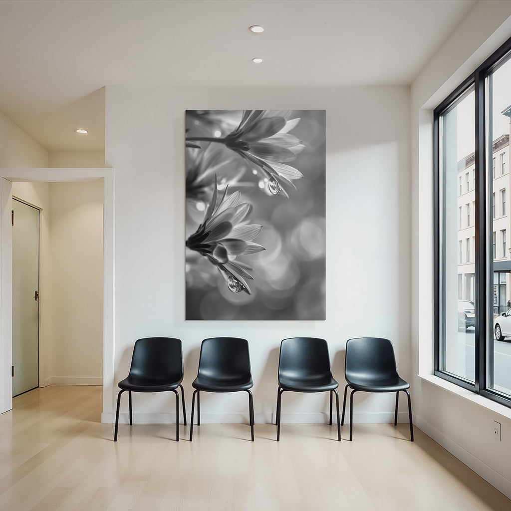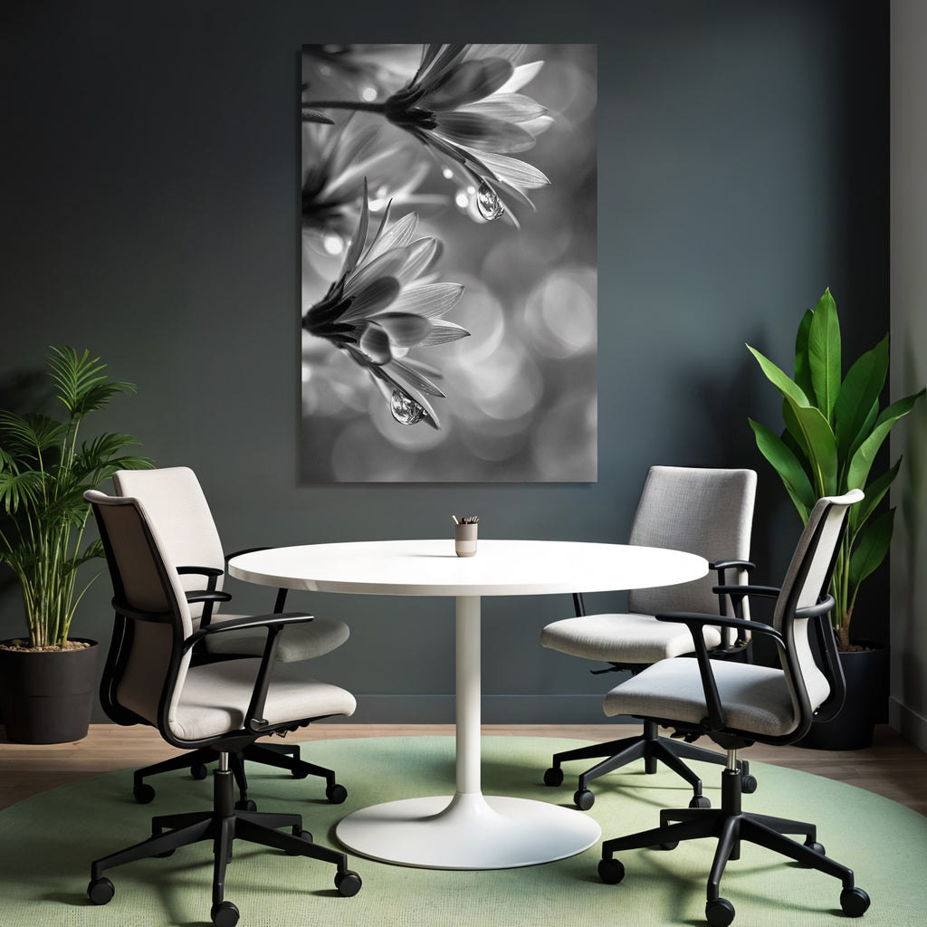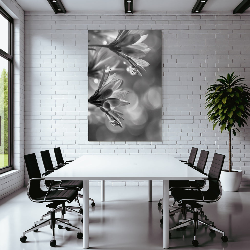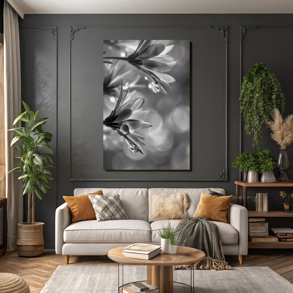 „Blumen Mit Wassertropfen Im Bokeh“ verleiht Ihrem Raum Charakter. Die Anlehnung an den Stil Wasserfaelle und Tropfen, kombiniert mit der schlichten Eleganz des FameFrame, schafft eine einzigartige Atmosphäre.