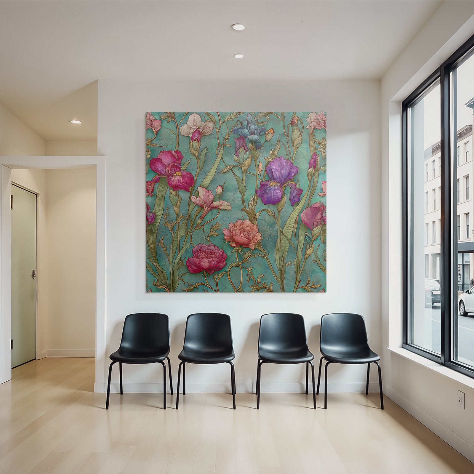 Die Kombination aus dem Motiv „Blumenmuster Mit Türkisem Hintergrund Und Filigranen Blüten“ und dem Stil Jugendstil schafft eine Brücke zwischen Klassik und Moderne. Der FameFrame™ vollendet dieses Zusammenspiel perfekt.