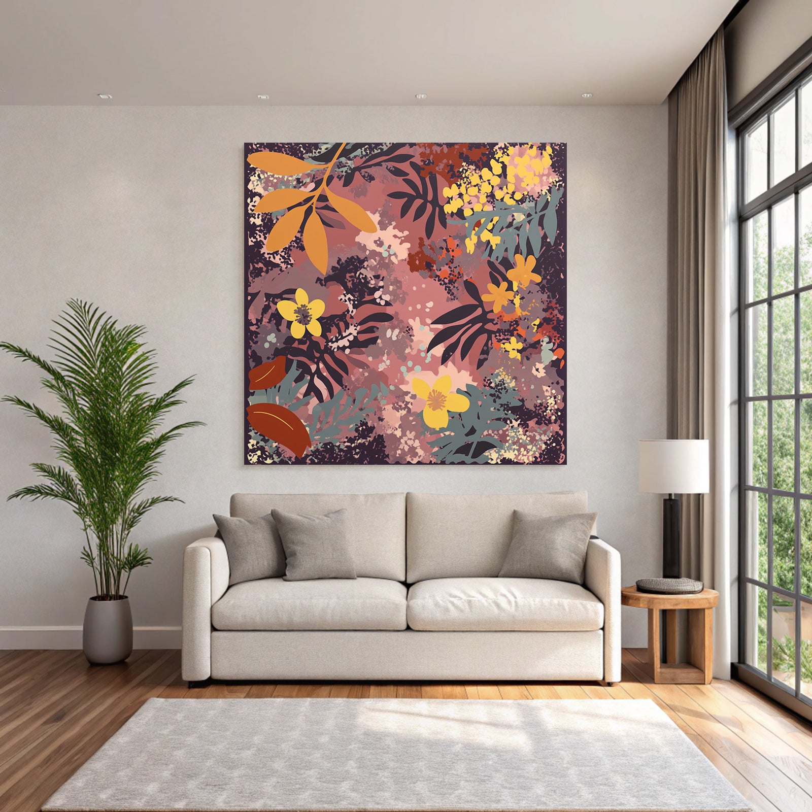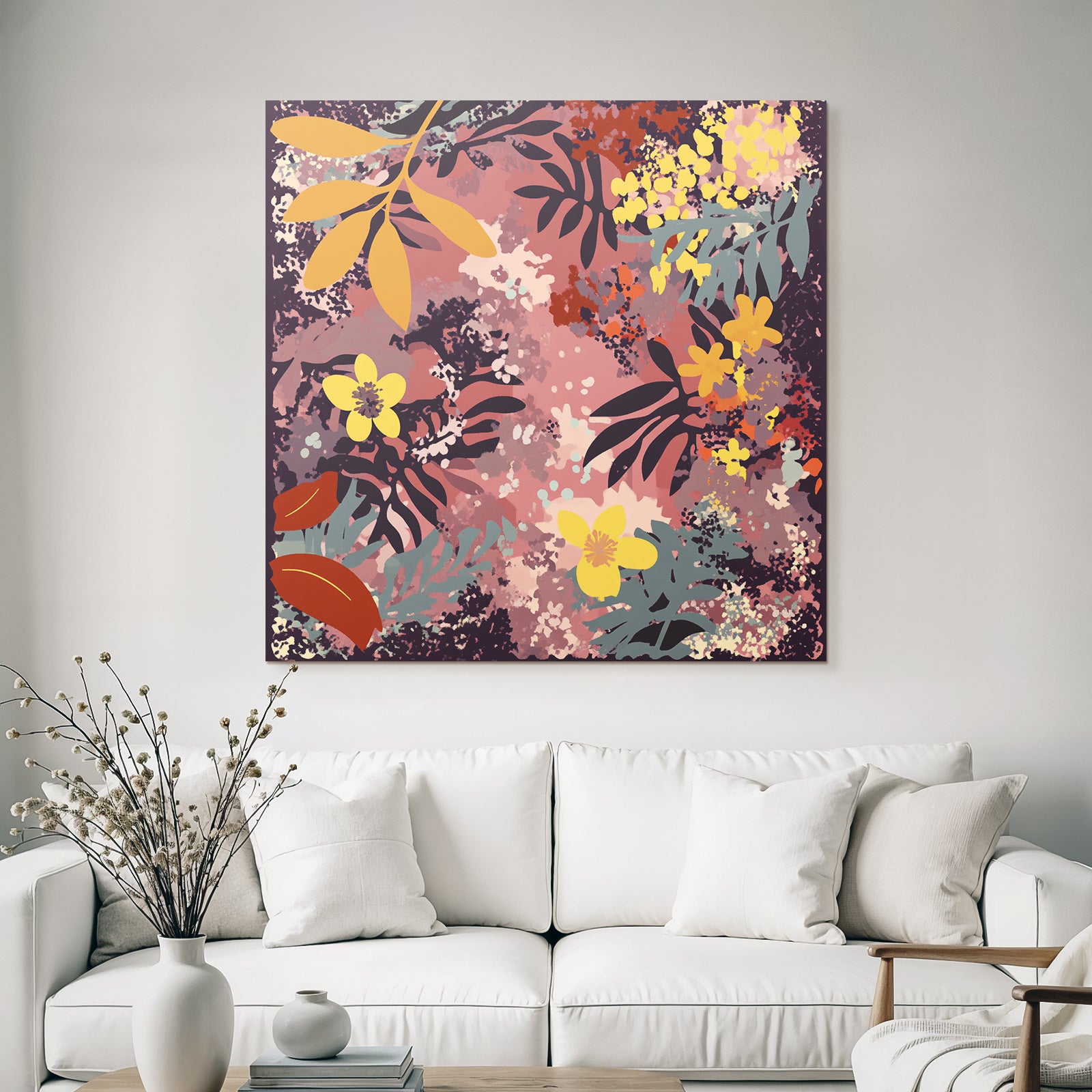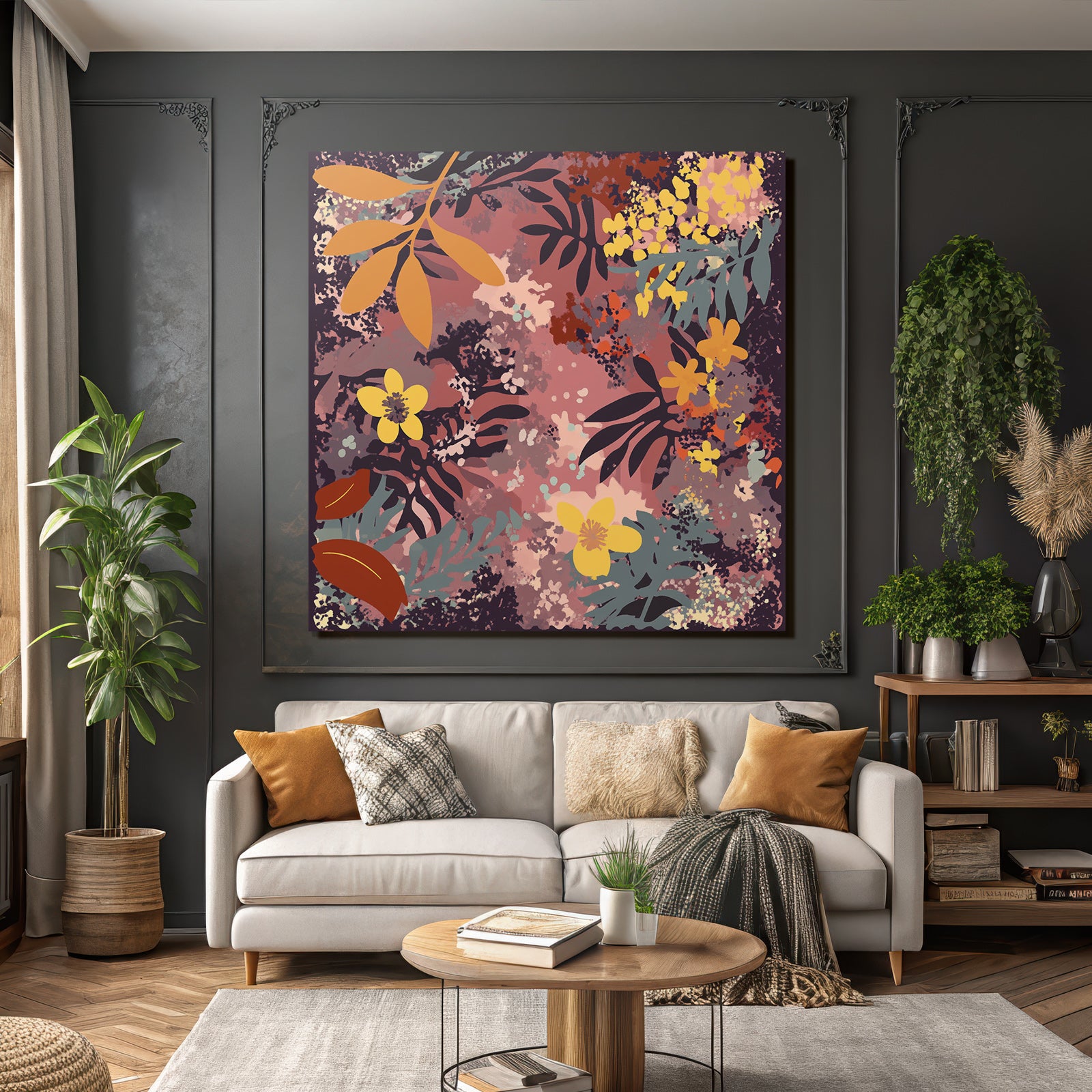 Ob im Wohnzimmer oder Essbereich – das Werk „„Blumige Muster Mit Blatter Und Blumen““ im Stil Boho Eklektisch wird im FameFrame zum stilvollen Blickfang.