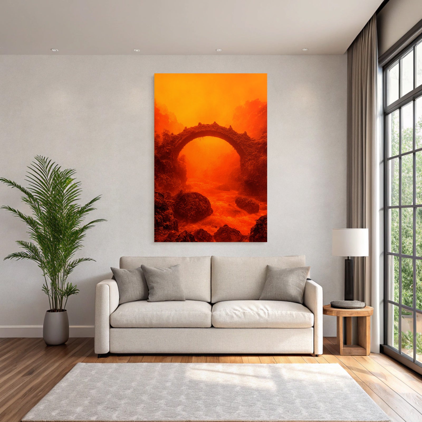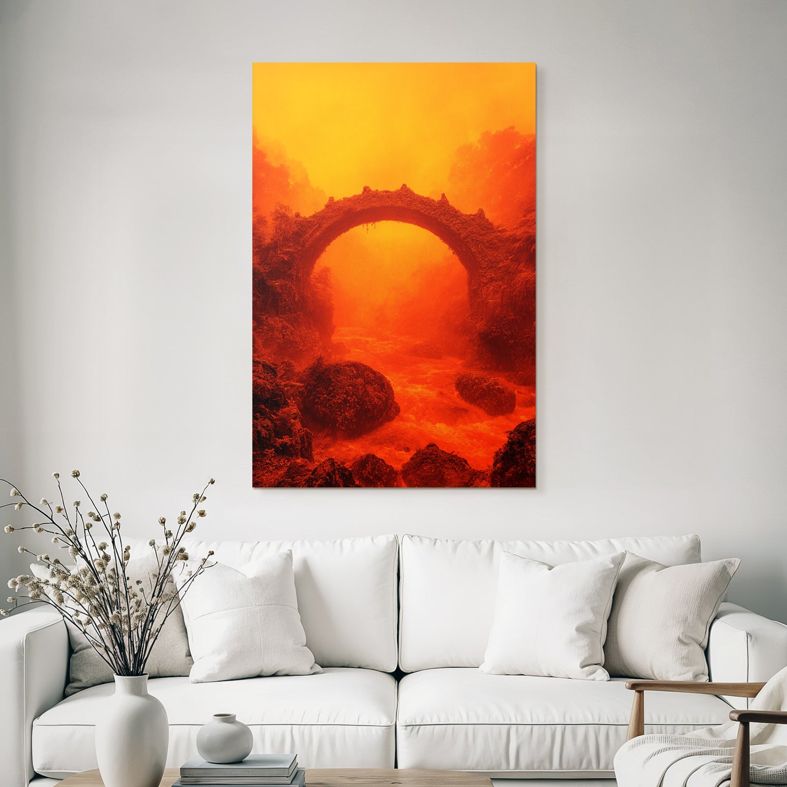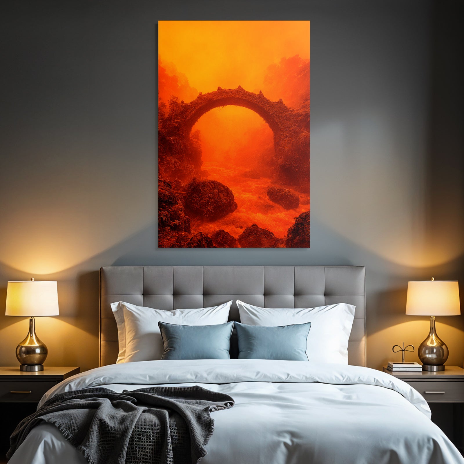 Bring die Atmosphäre von Feuer und Vulkane in Dein Zuhause – mit „Bogenbrücke Im Morgennebel“ auf Stoff im austauschbaren FameFrame.