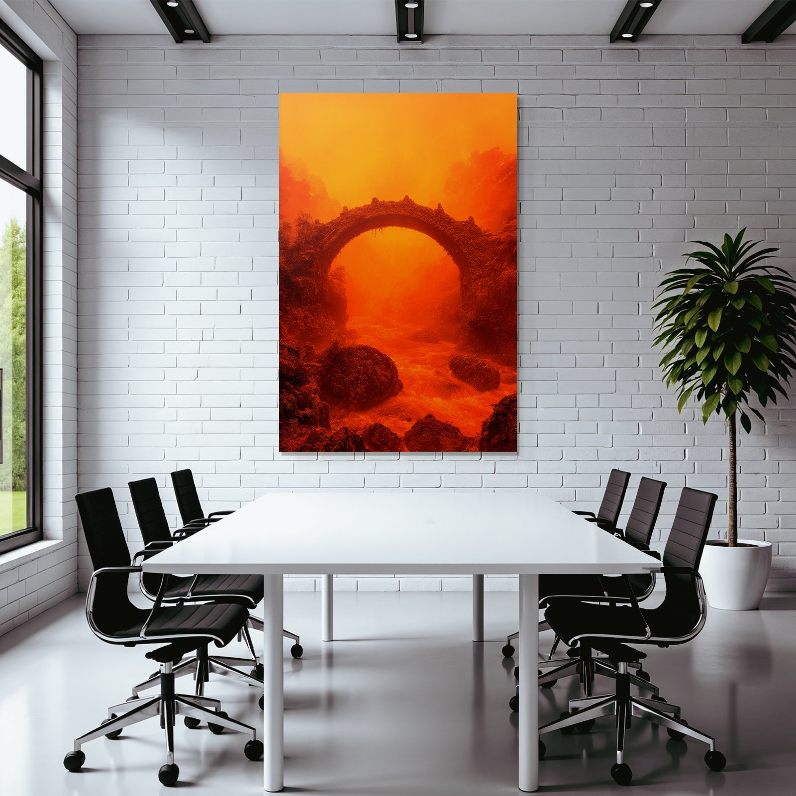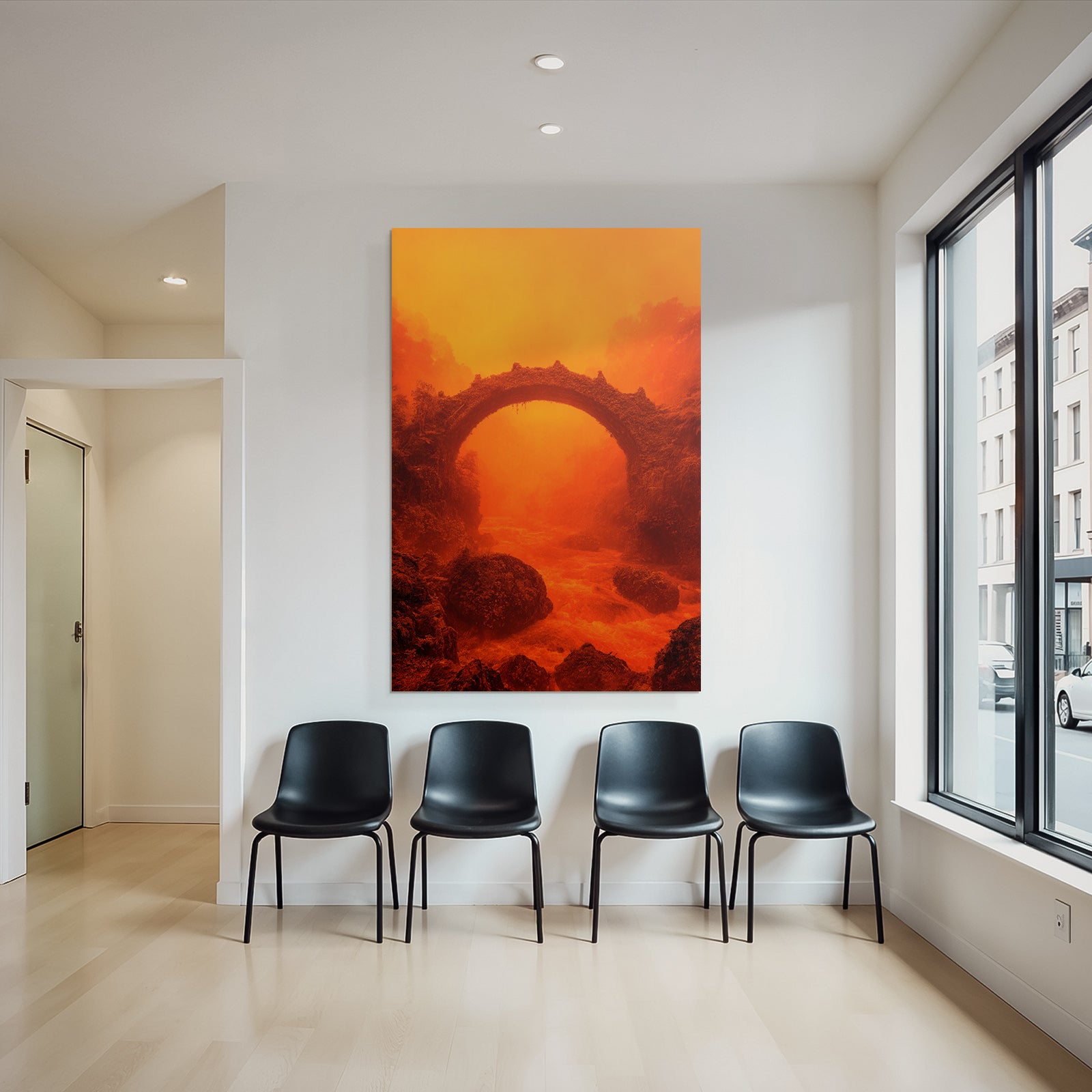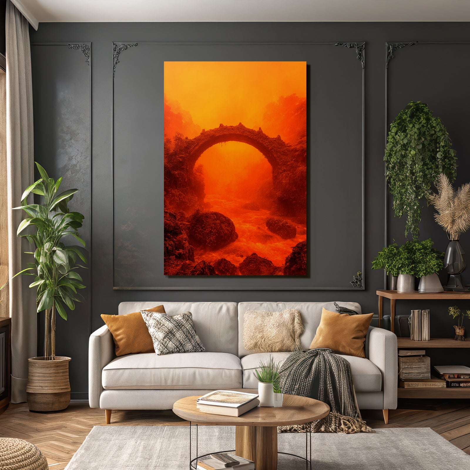 Bring die Atmosphäre von Feuer und Vulkane in Dein Zuhause – mit „Bogenbrücke Im Morgennebel“ auf Stoff im austauschbaren FameFrame.