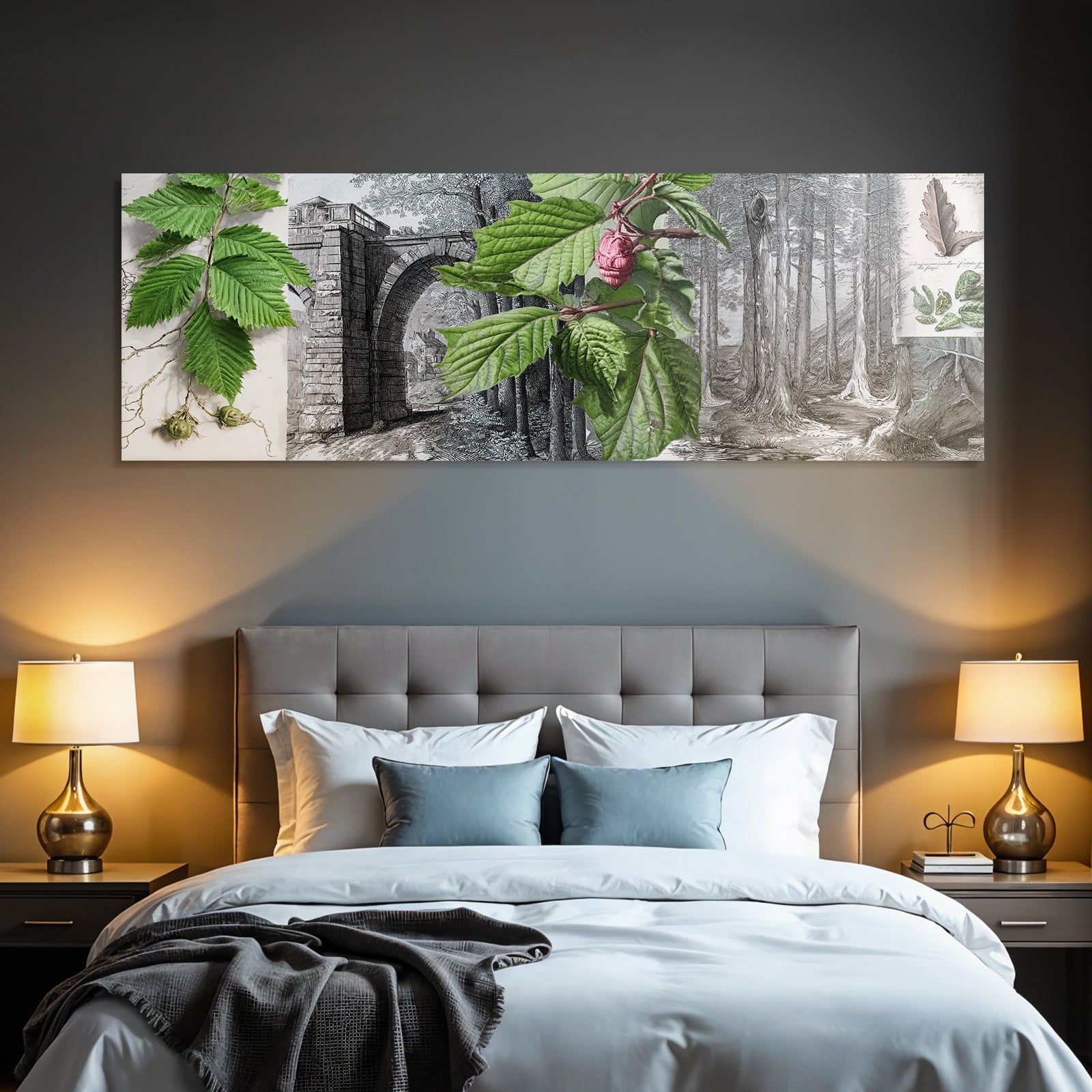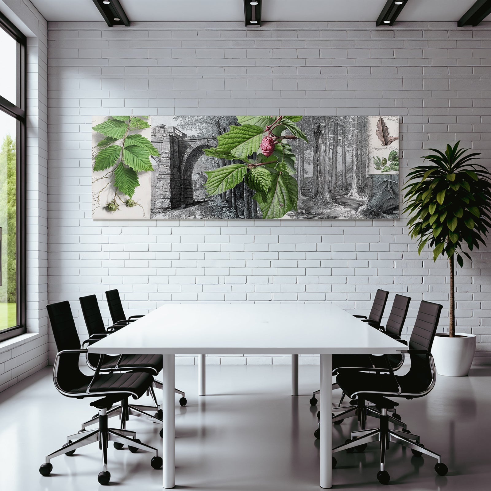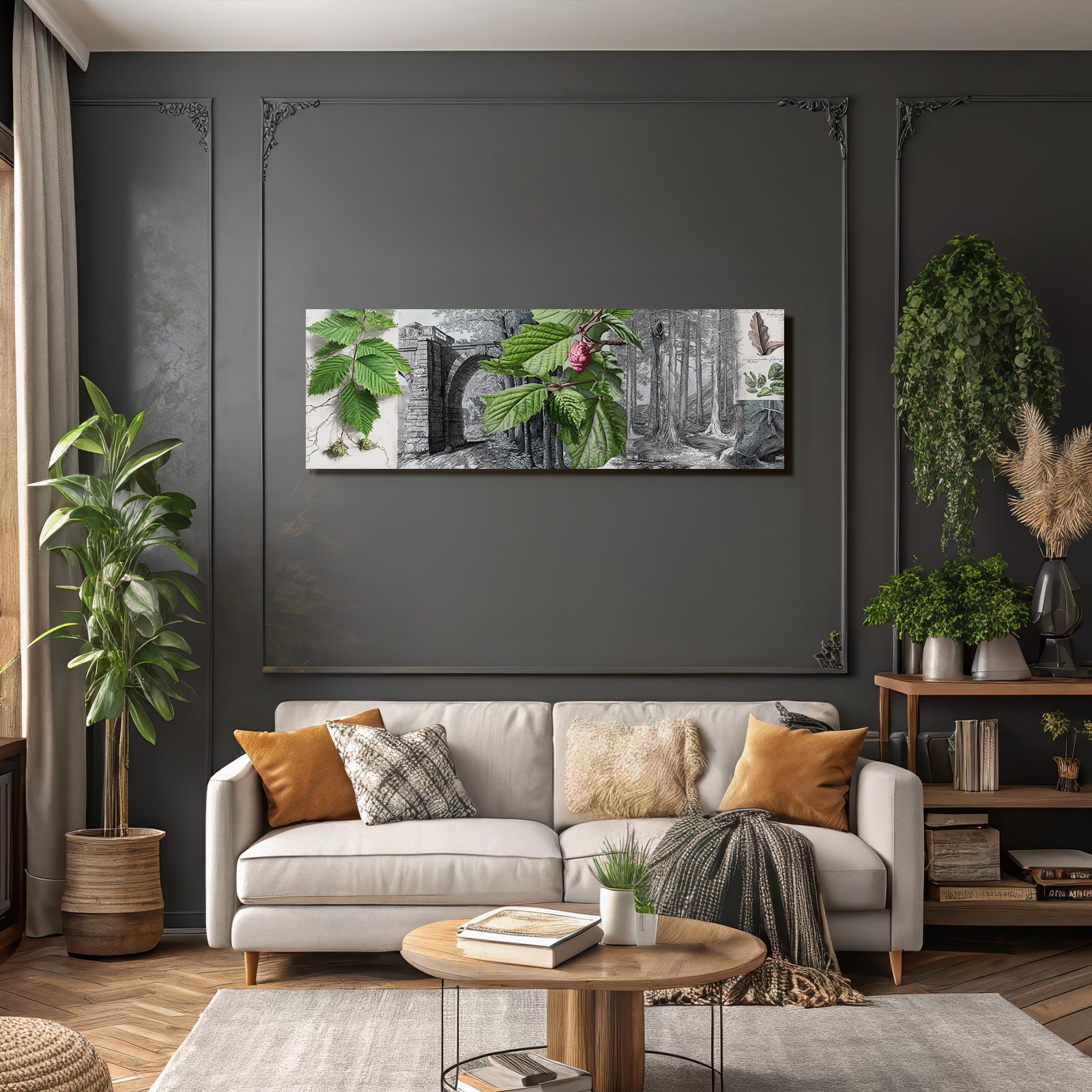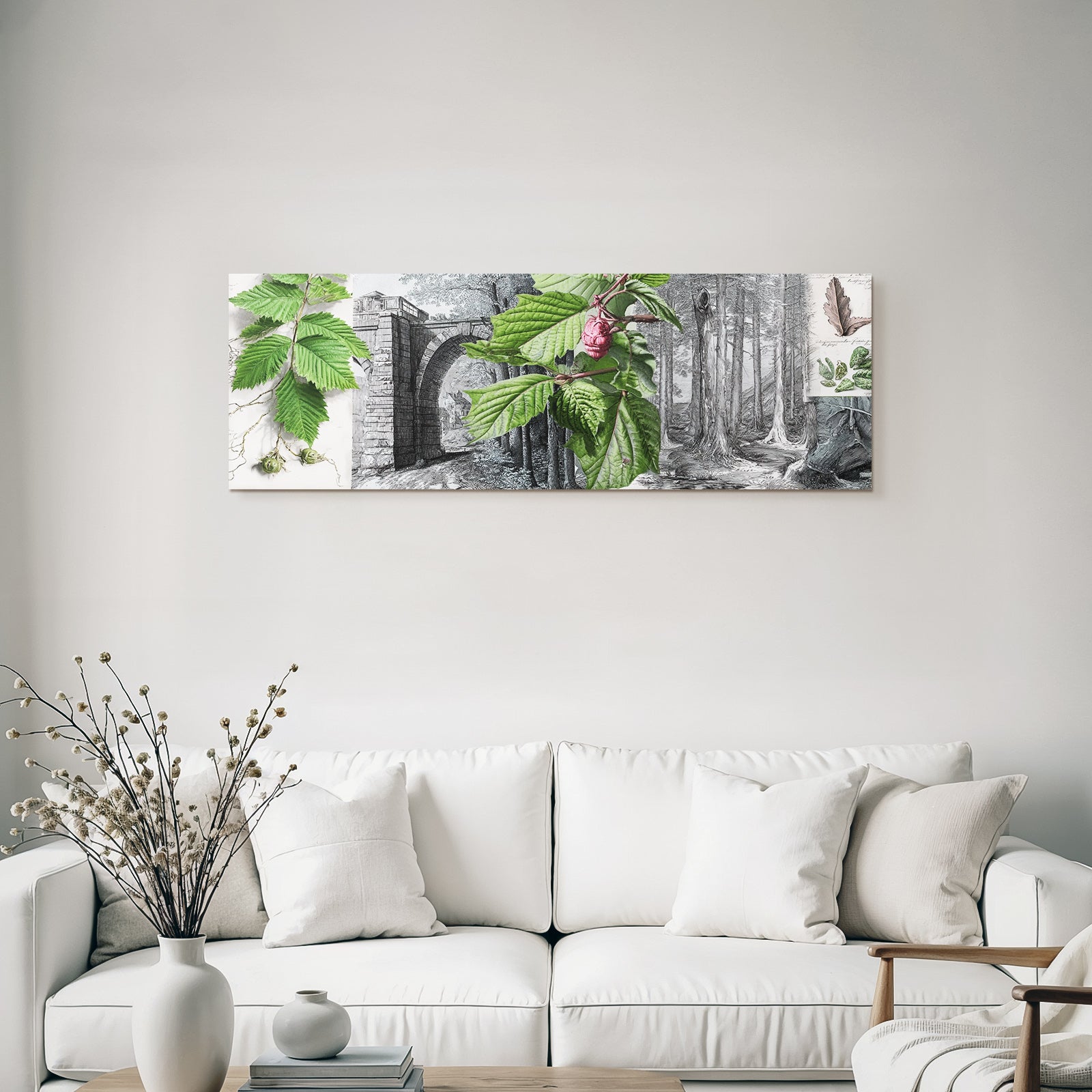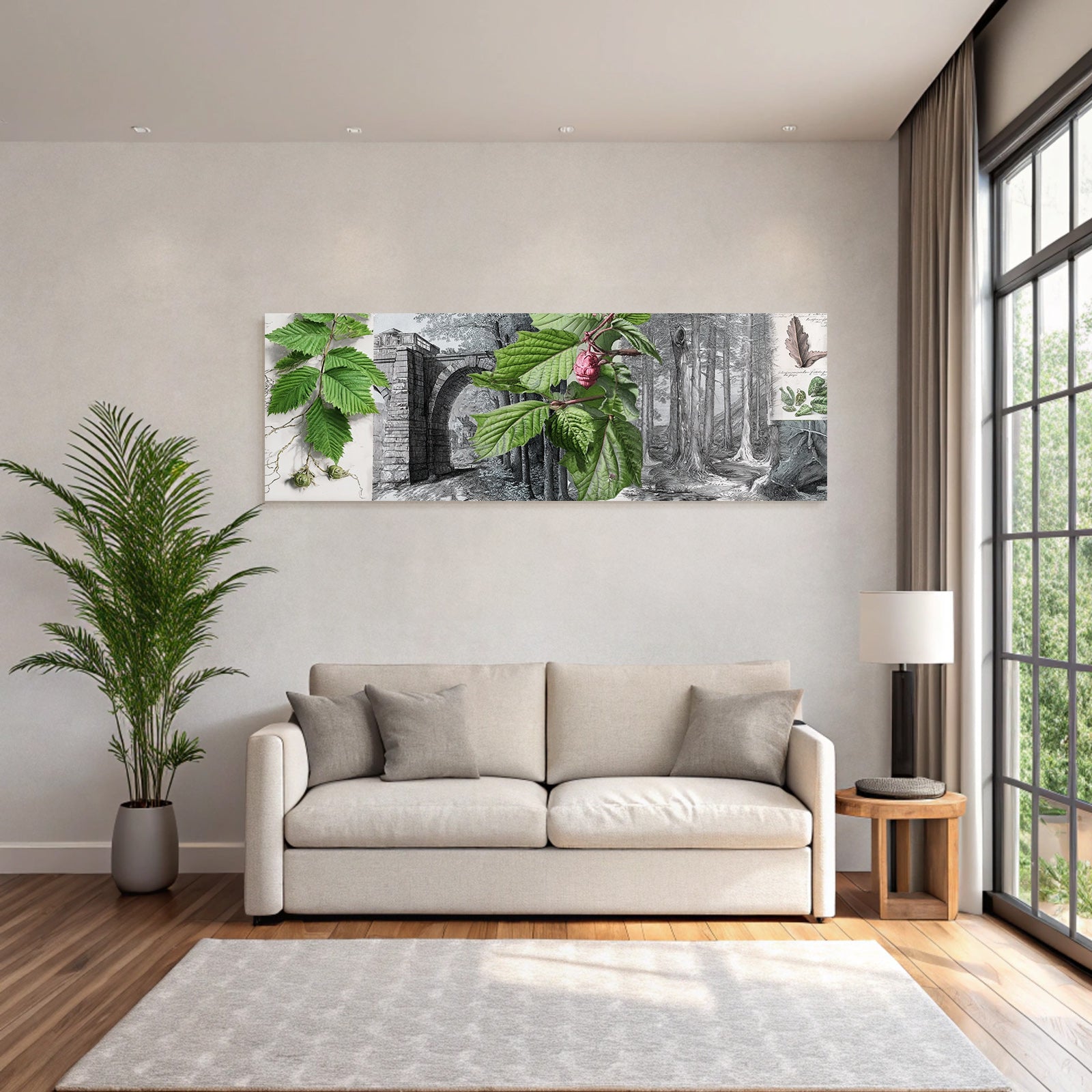 Mit Botanische Illustrationen-Elementen und klarer Wirkung verleiht „Botanische Kollage Mit Grünen Blättern Und Historischen Baumskizzen“ Deinem Raum Persönlichkeit – eingerahmt im exklusiven FameFrame.