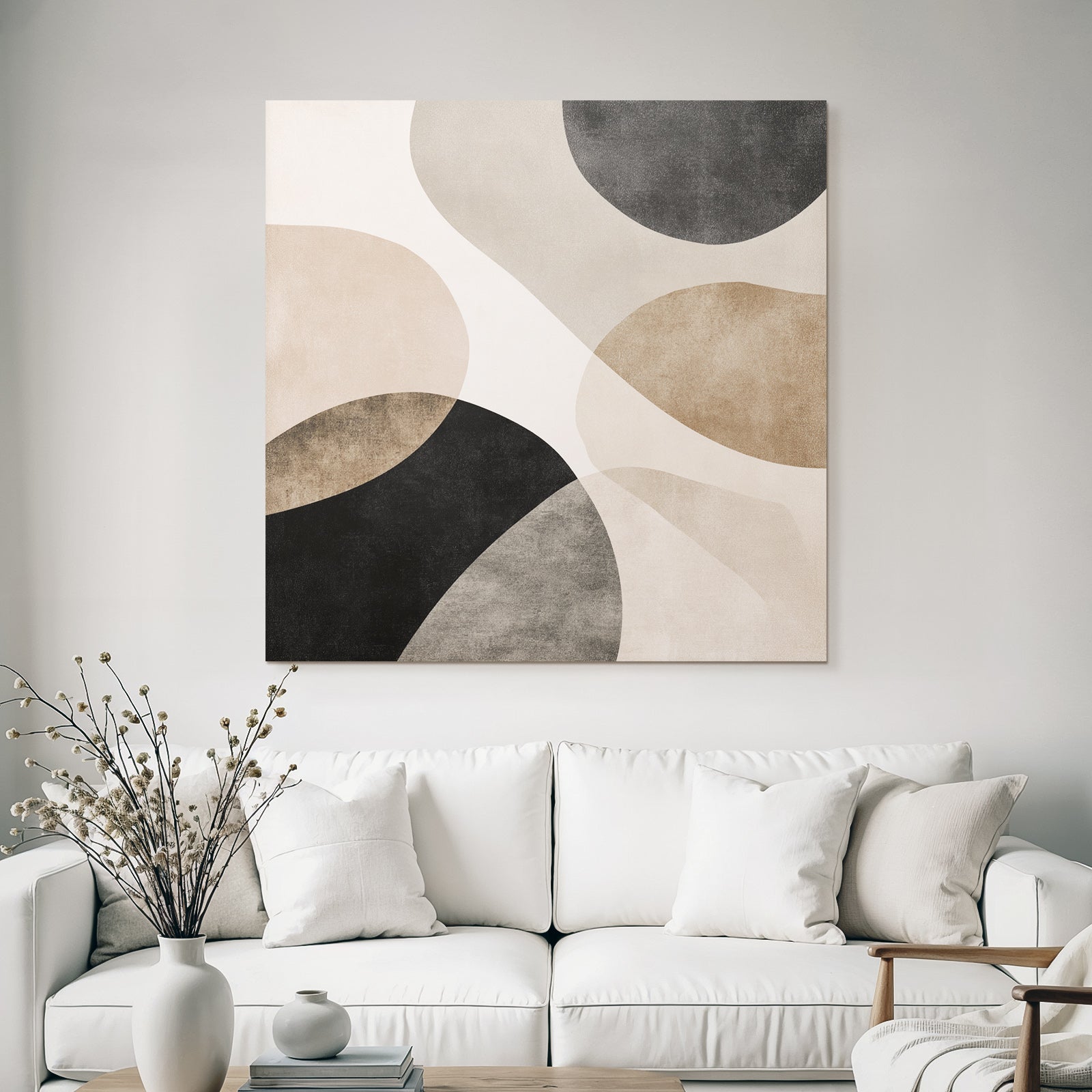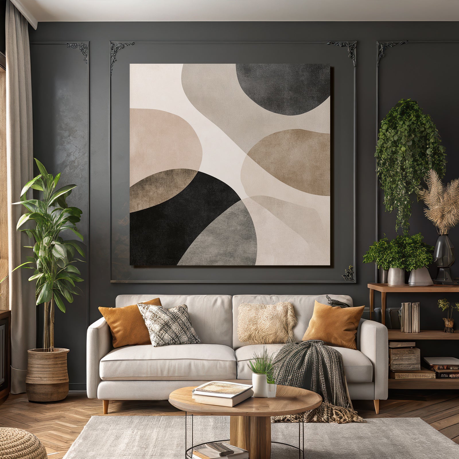 „„Braun Schwa Rabstrakte Kunst Kreisz““ verbindet das Beste aus Japandi mit modernem Textildruck – edel präsentiert im hochwertigen FameFrame.