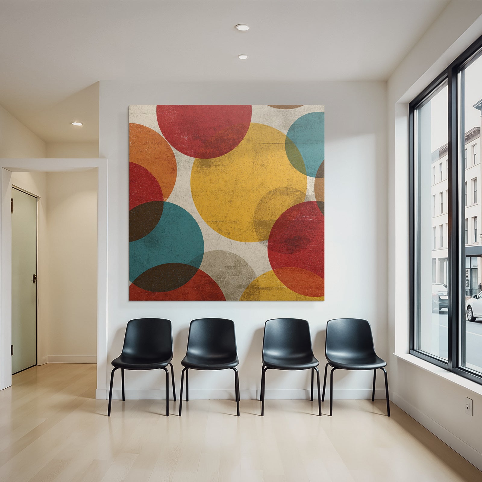 Verschönere Dein Zuhause mit diesem Werk im Stil Mid Century Modern. Der Titel „„Bunte Kreise Mit Texturiertem Hintergrund““ kommt im hochwertigen FameFrame perfekt zur Geltung.