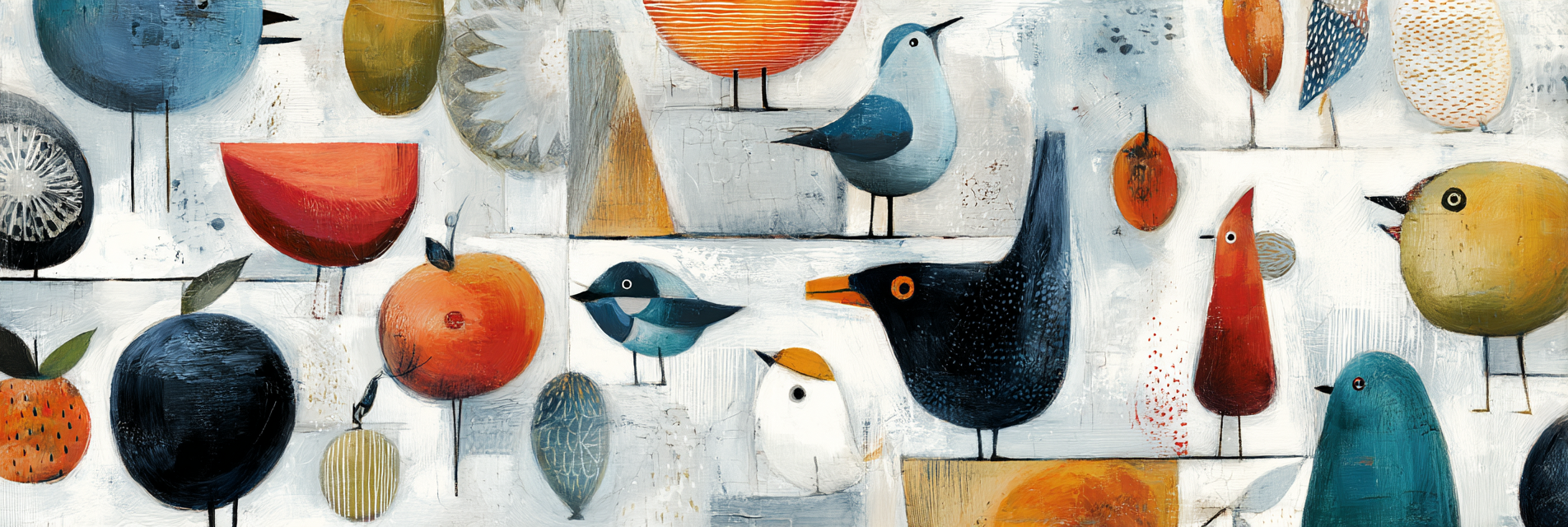 Setze Akzente im Esszimmer, Salon oder Praxisraum mit dem Kunstwerk „„Bunte Voegel Und Fruechte““ im Stil Skandinavisch – gespannt im edlen FameFrame.