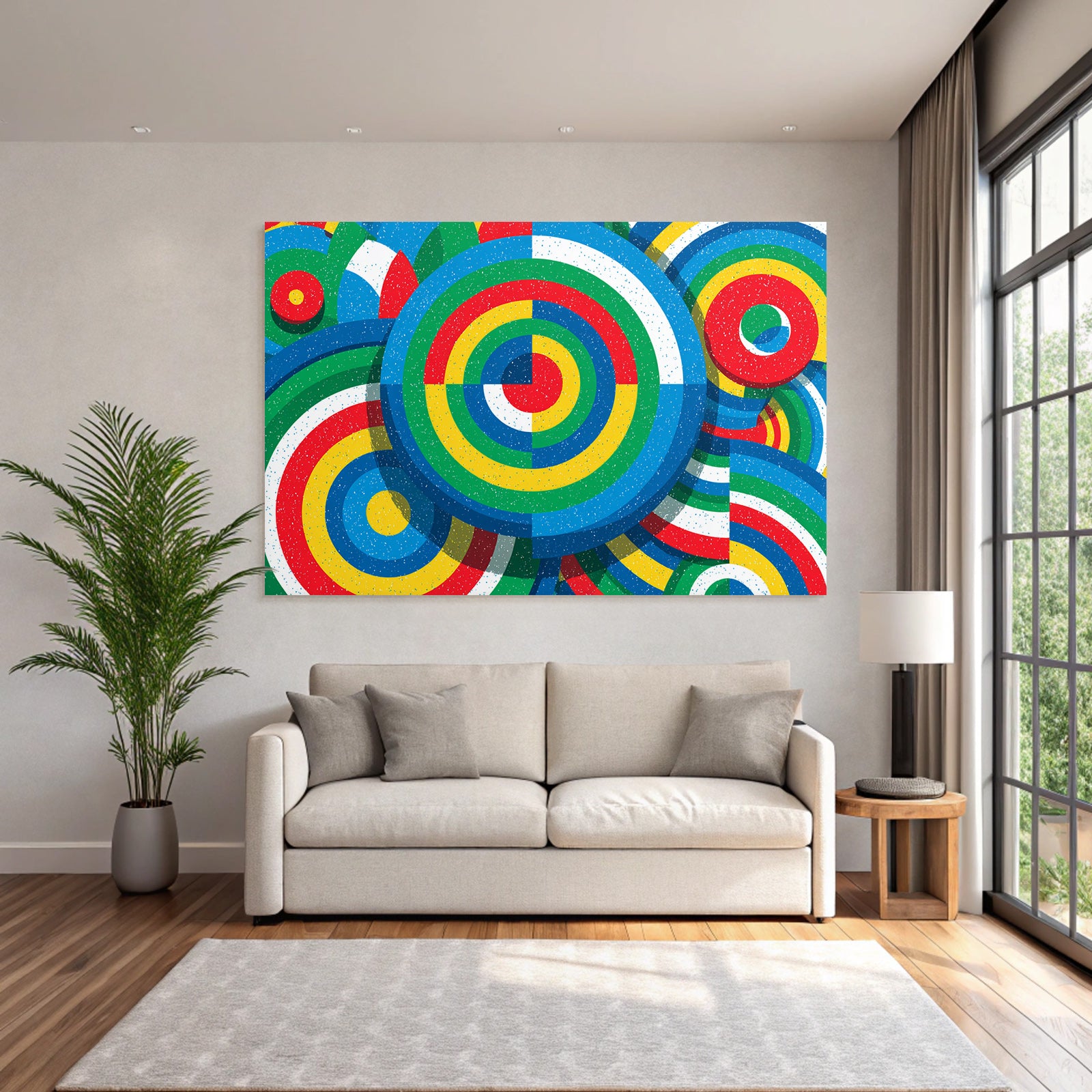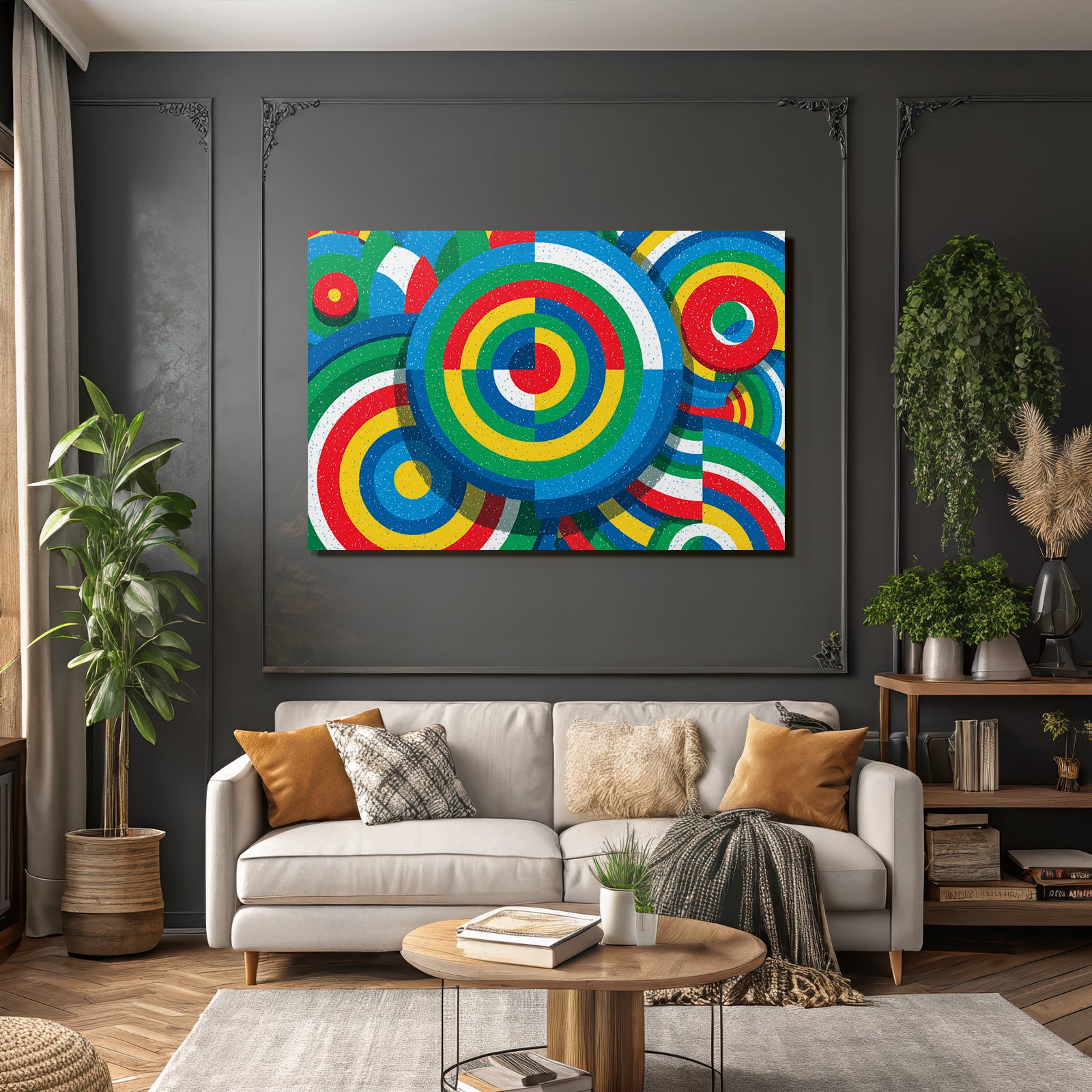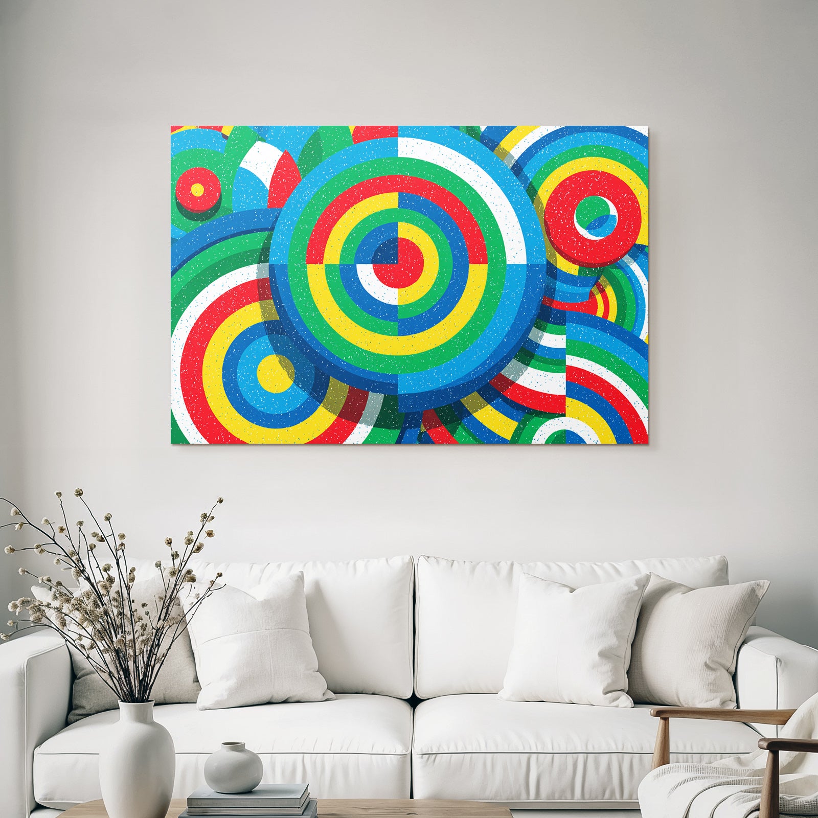 „Bunter Abstrakter Hintergrund Mit Kreisförmigen Mustern“ ist das Highlight für jede Wand. Als brillanter Textildruck im Stil Bauhaus wird es im FameFrame™ zu einem dynamischen und wandelbaren Kunstobjekt.