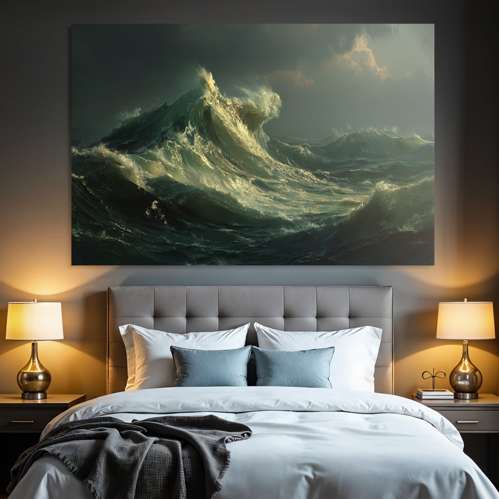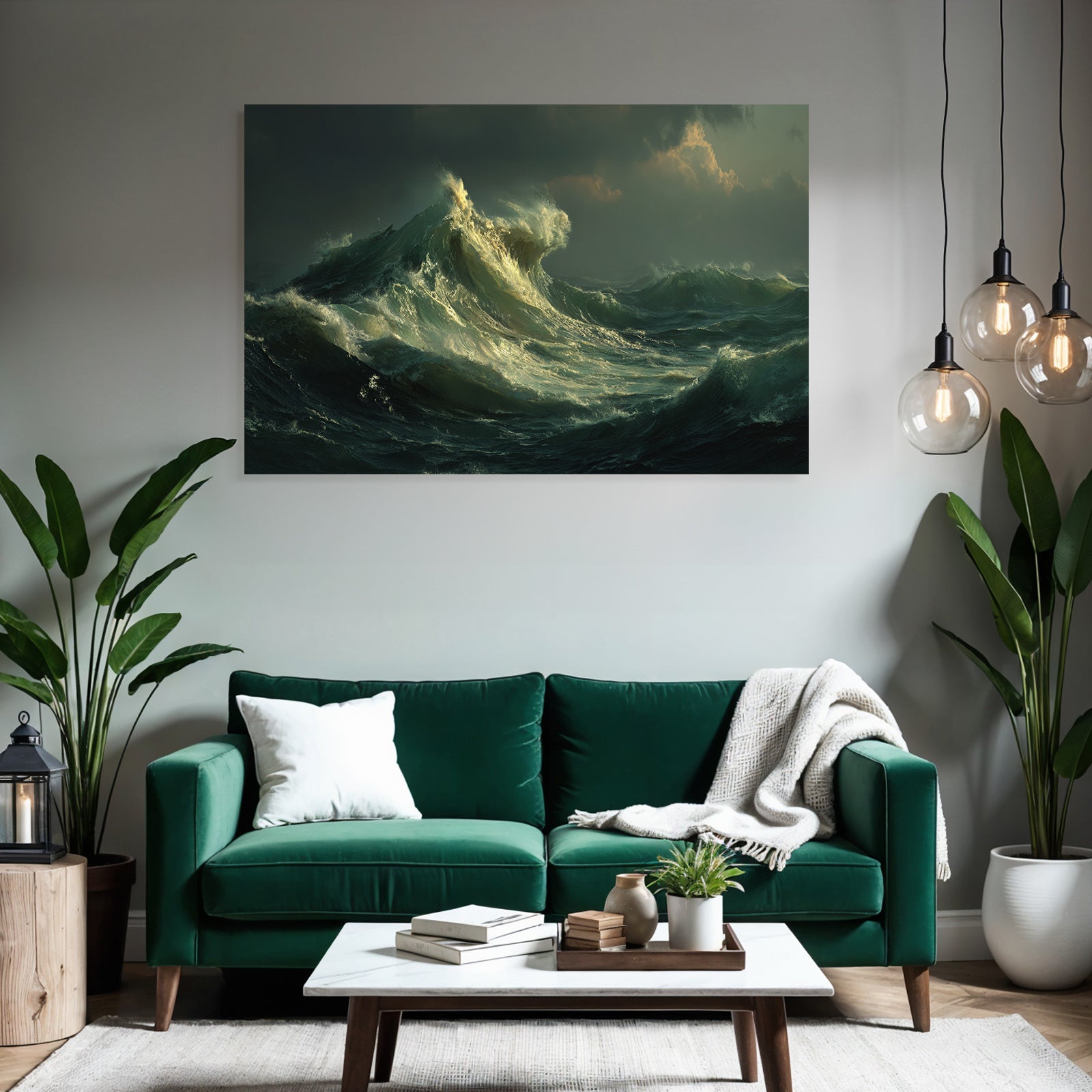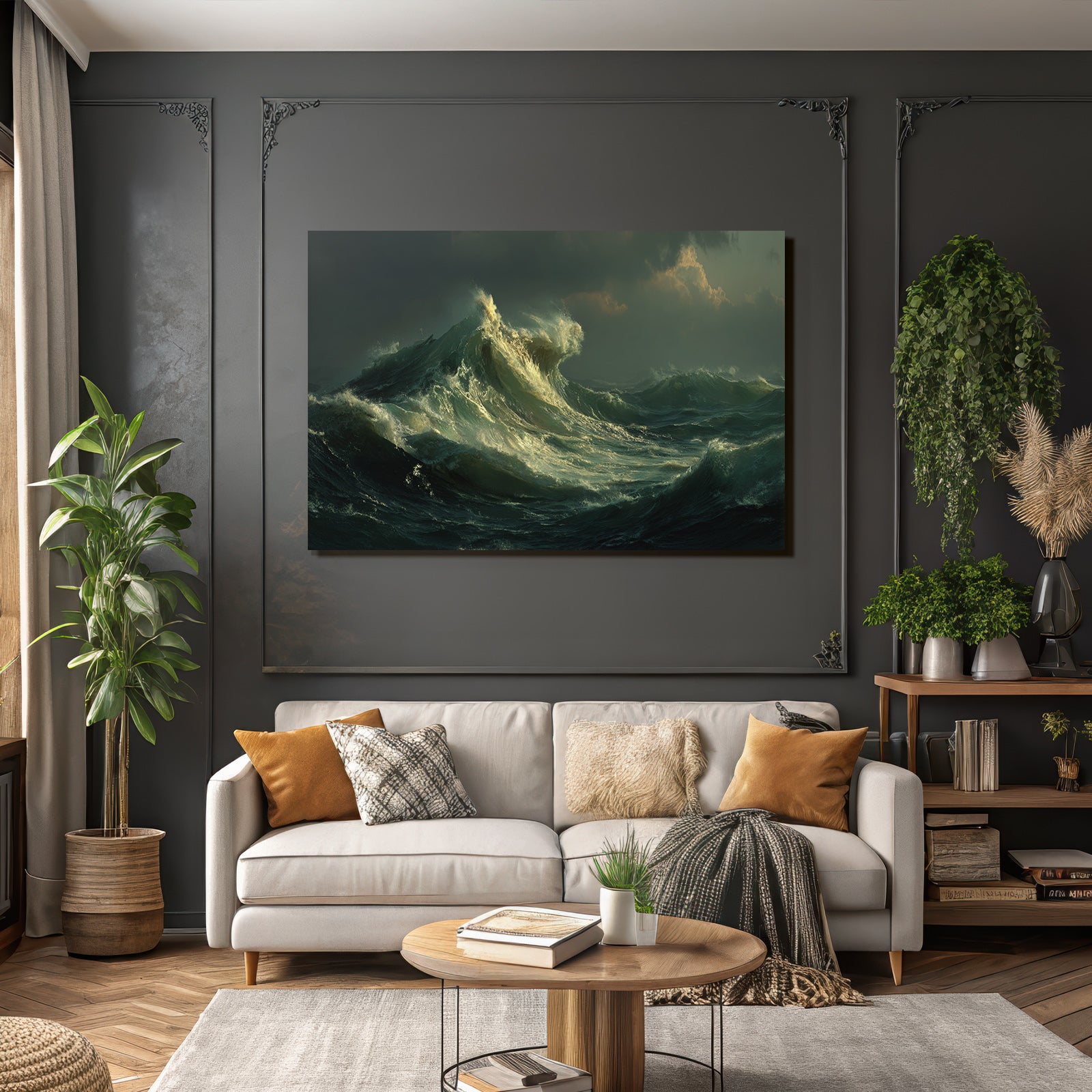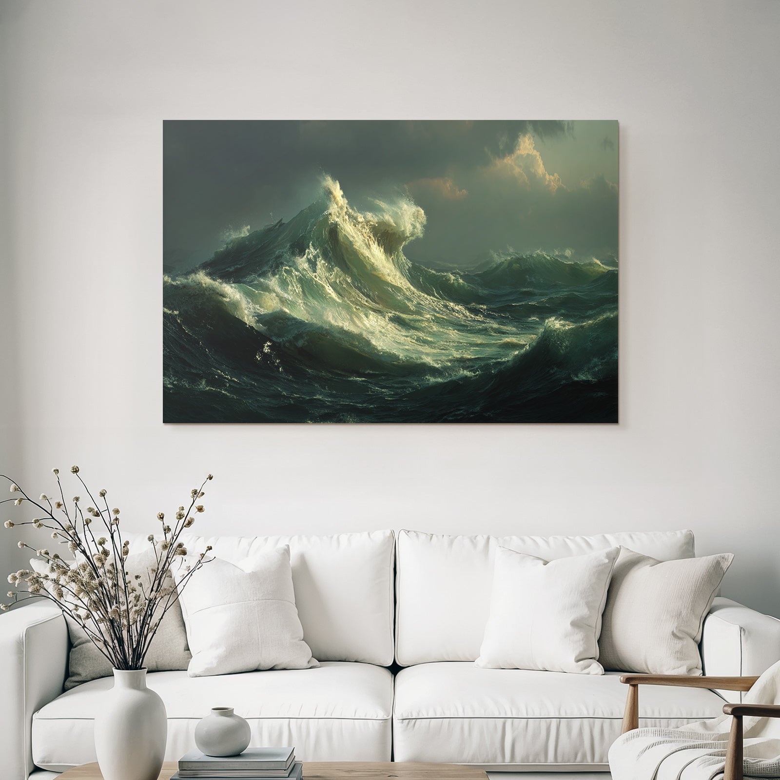 Kunst trifft Design: „Dramatische Ozeanwellen Im Sturm“ im Stil Nahaufnahmen entfaltet im FameFrame seine volle Ausdruckskraft.