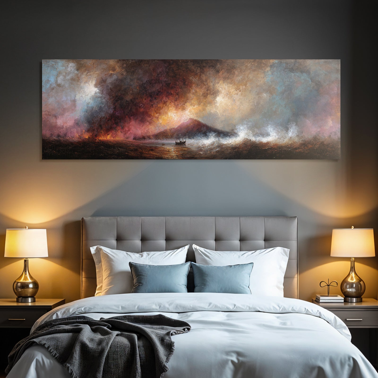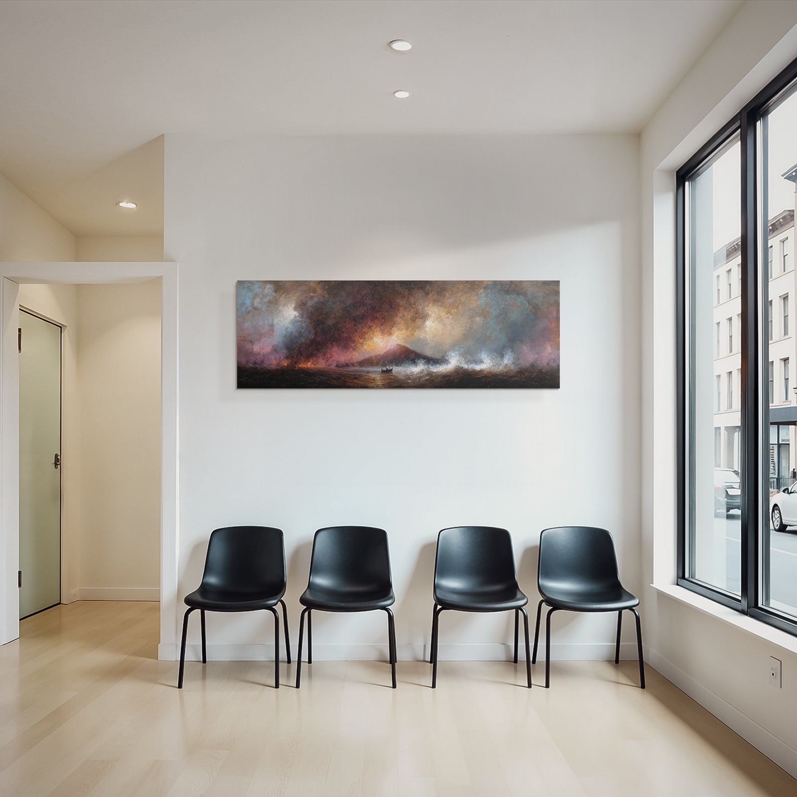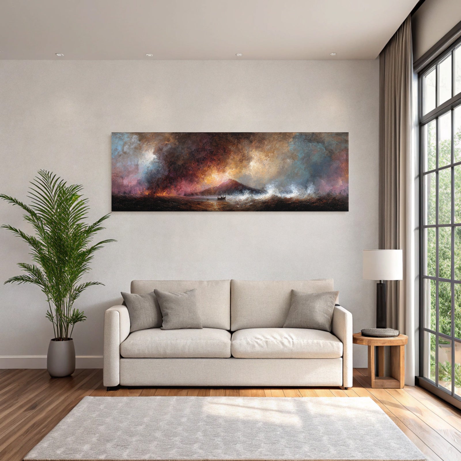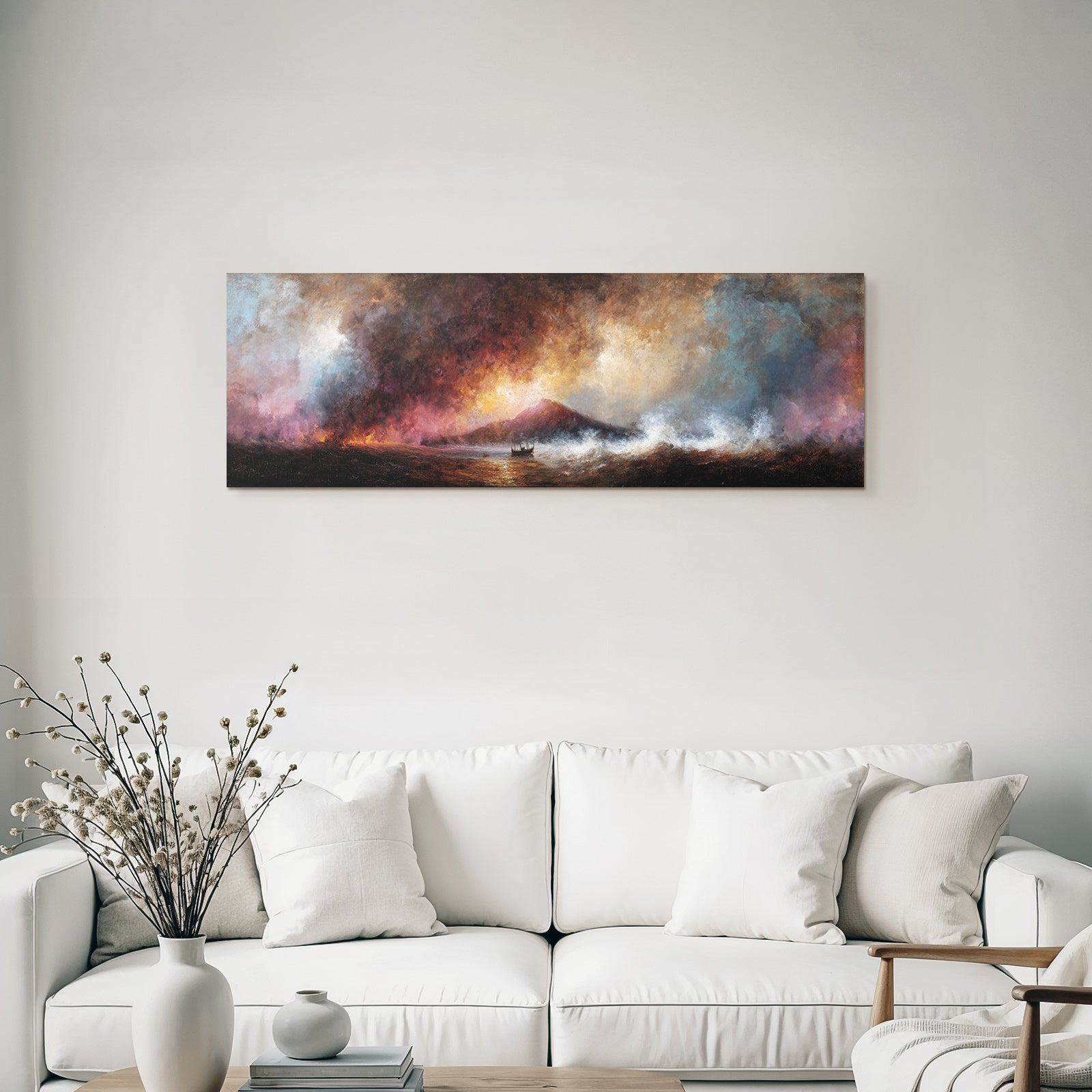 Mit dem Werk „Dramatische Vulkanlandschaft Mit Sturm Und Boot“ im Stil Nahaufnahmen gestaltest Du Dein Wartezimmer oder Deine Hotel-Lobby eindrucksvoll und modern – auf Stoff im FameFrame.