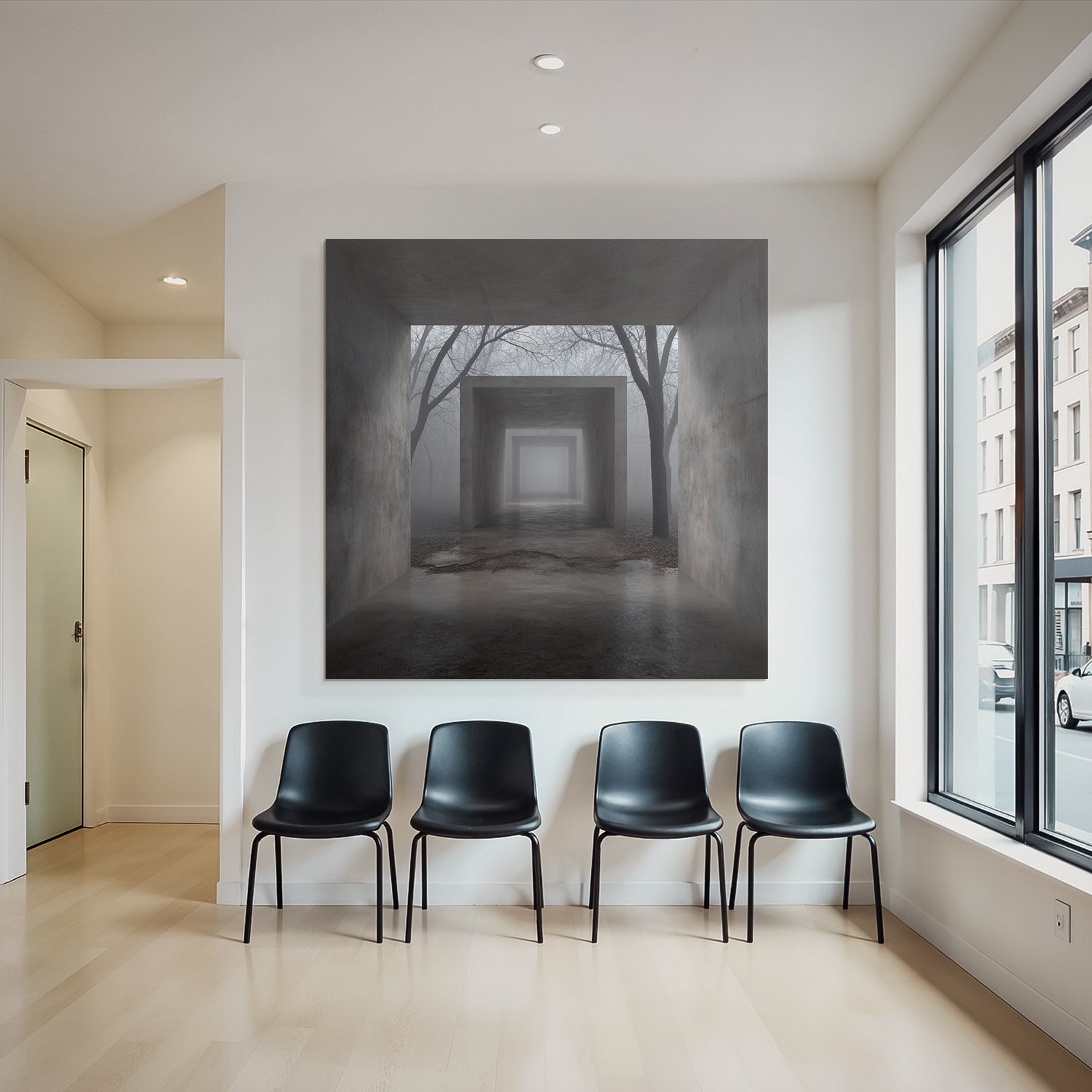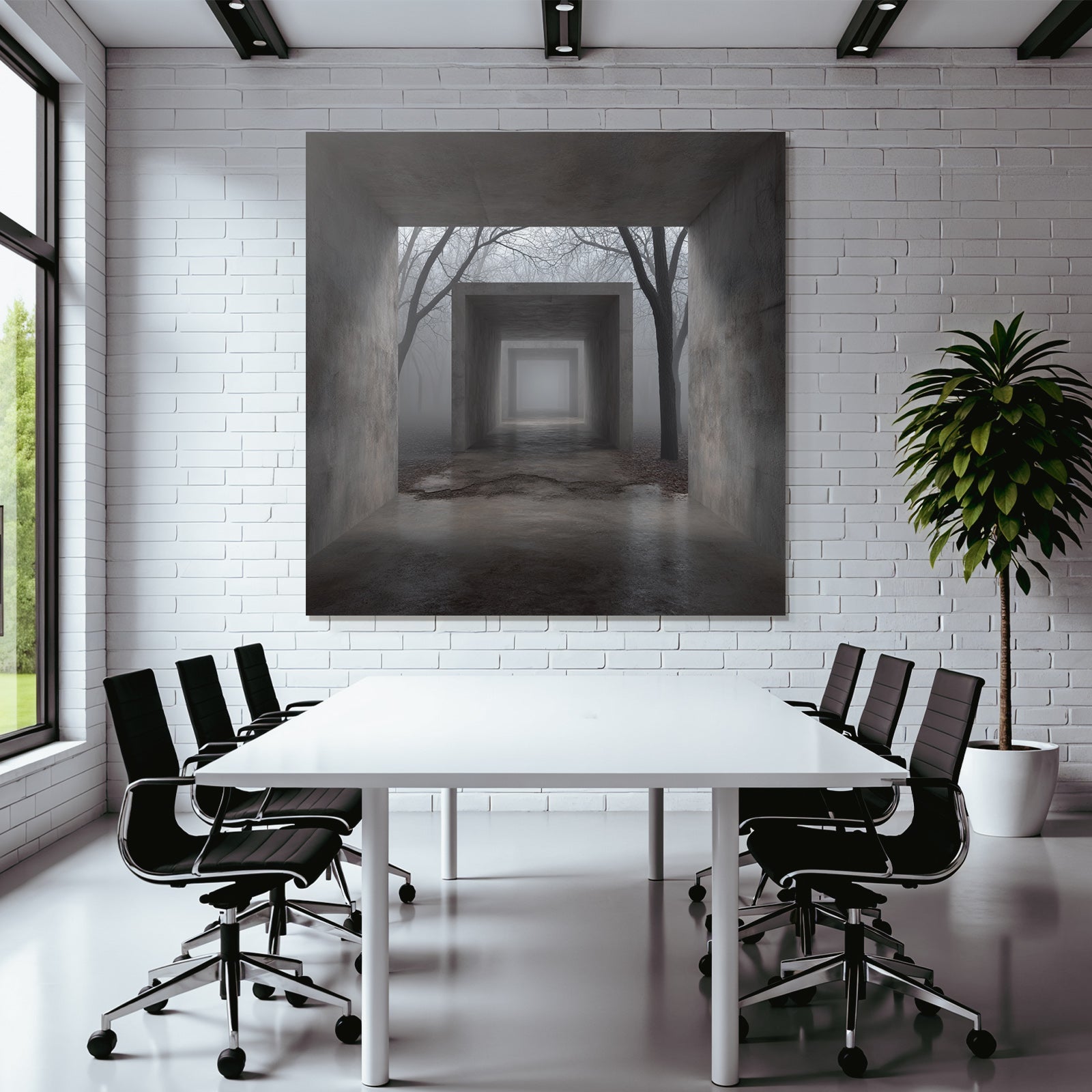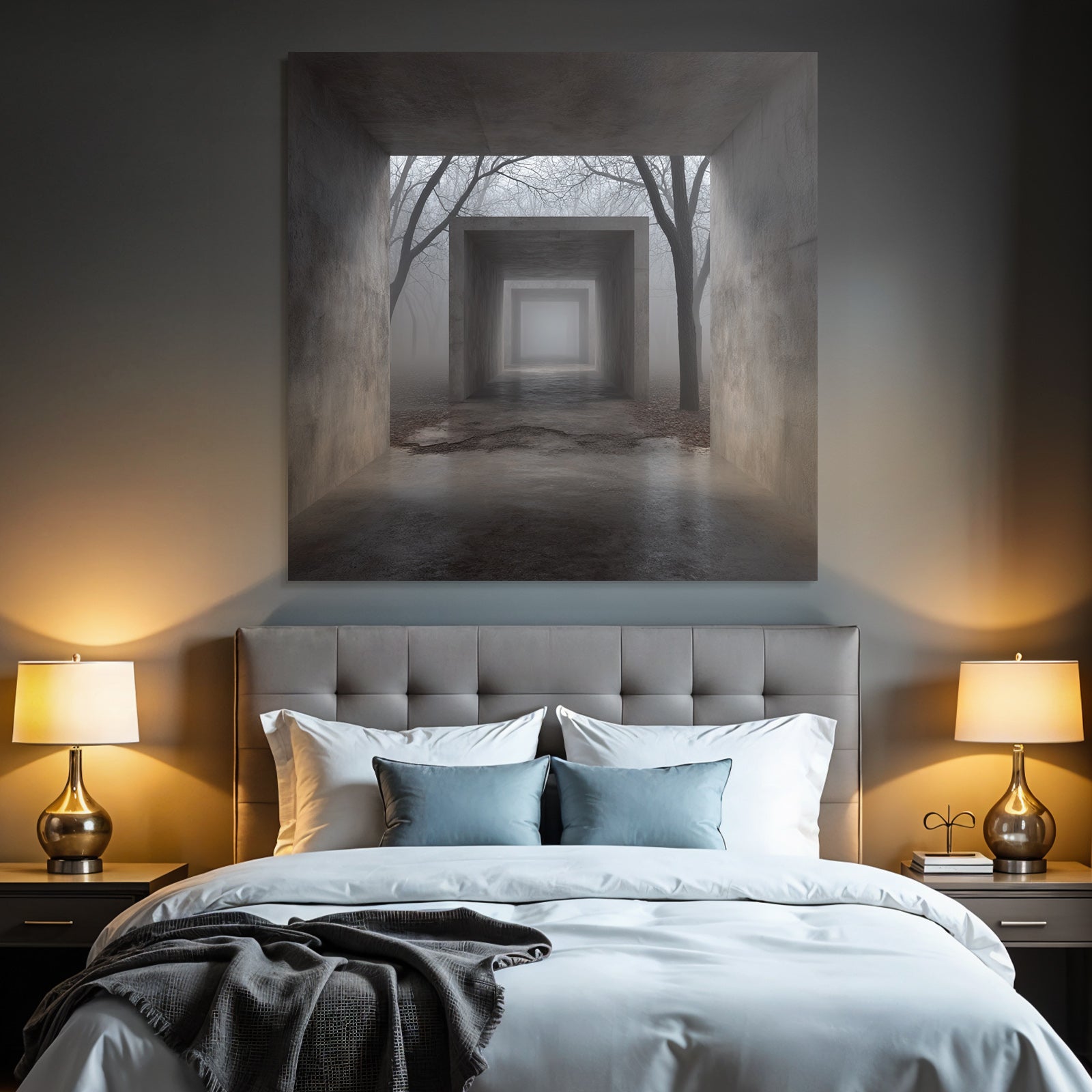 Erlebe Kunst im Stil Fotografie neu: „Eerie Tunnels In Foggy Wooded Environment“ wird durch den eleganten FameFrame zum Blickfang in jedem Raum.