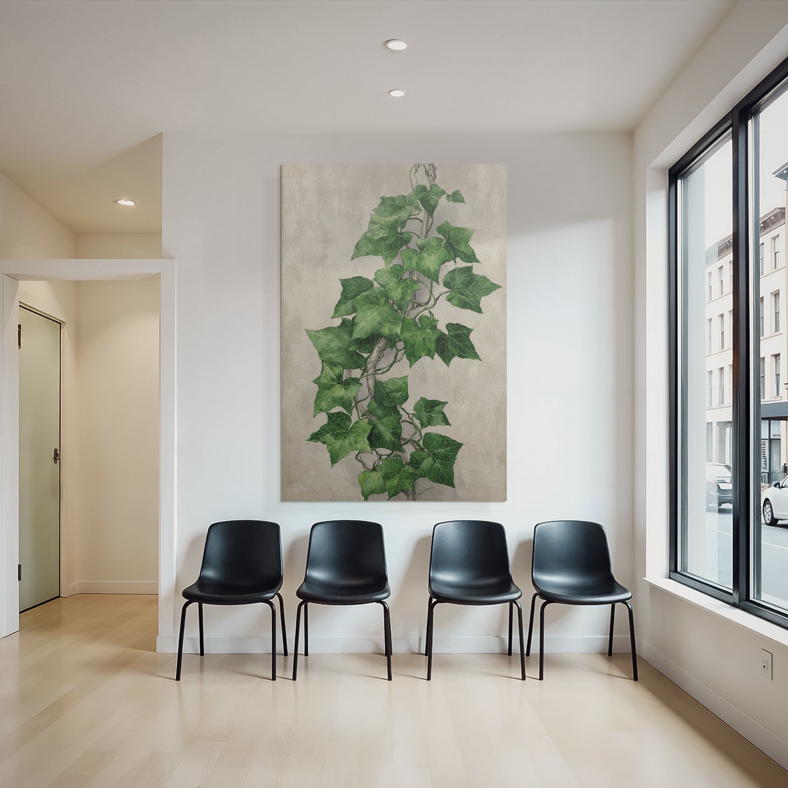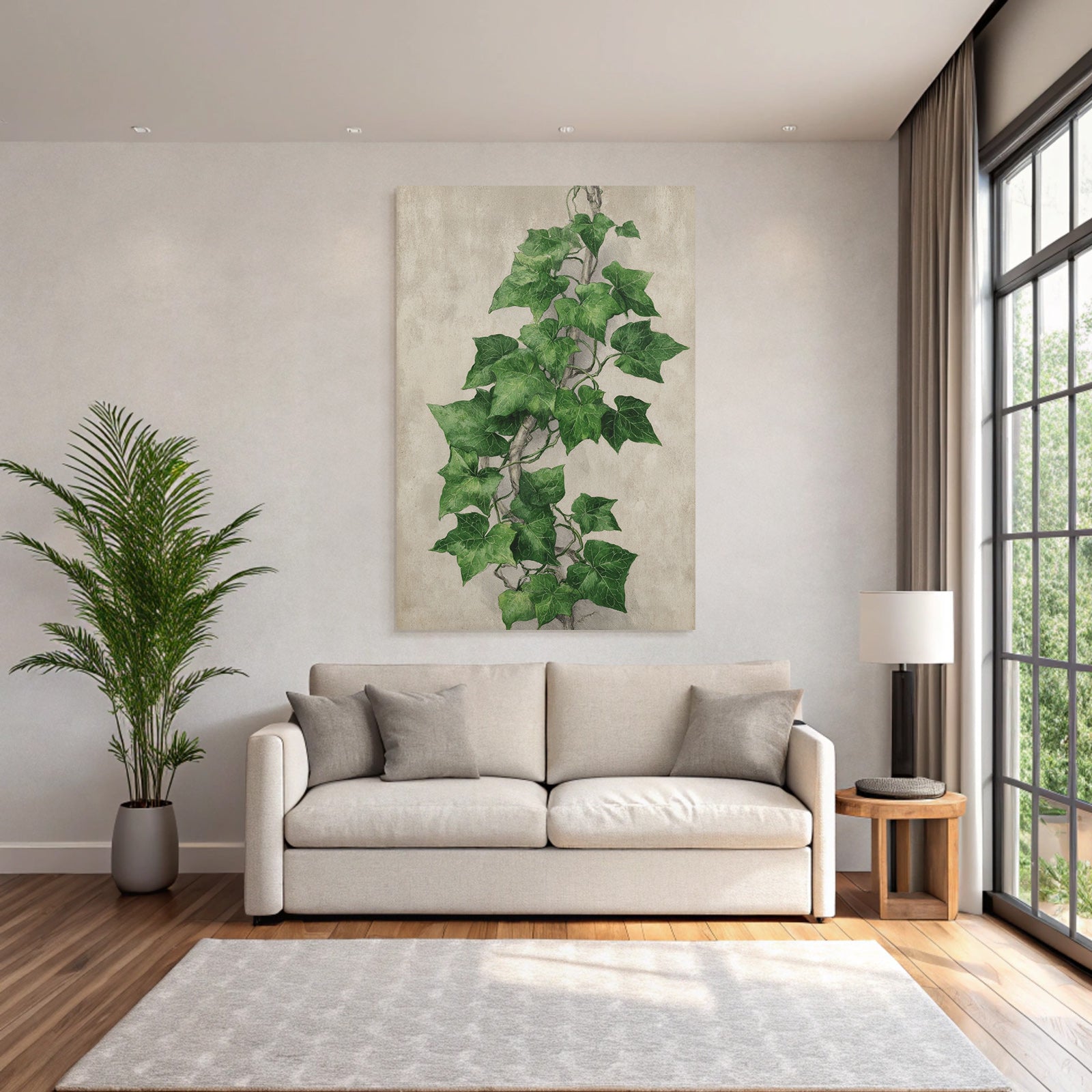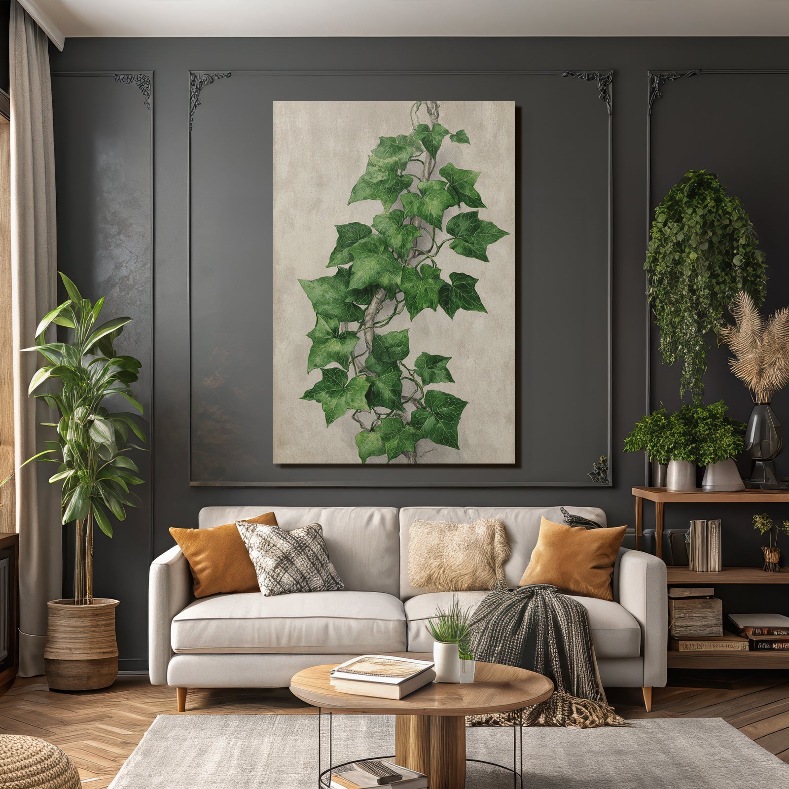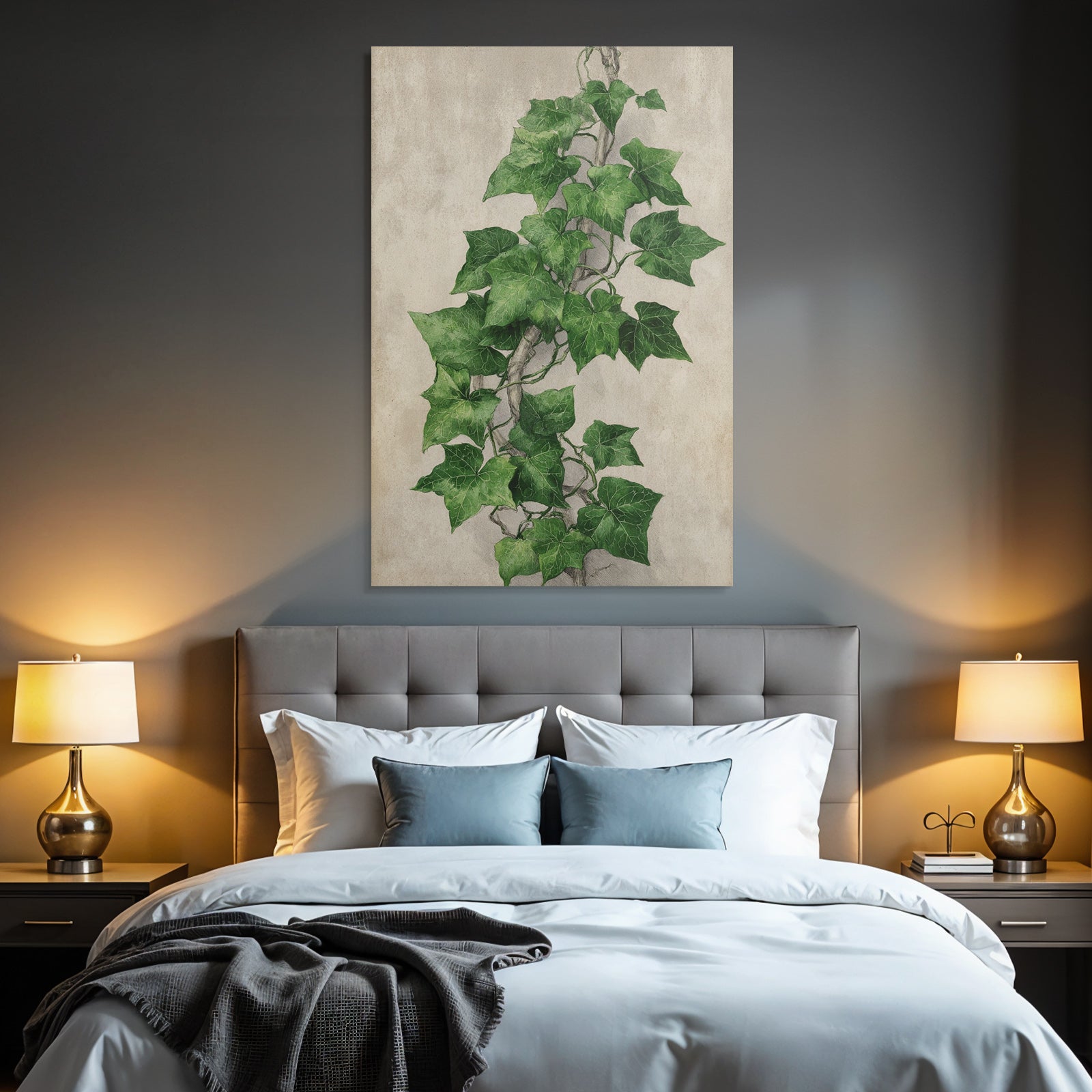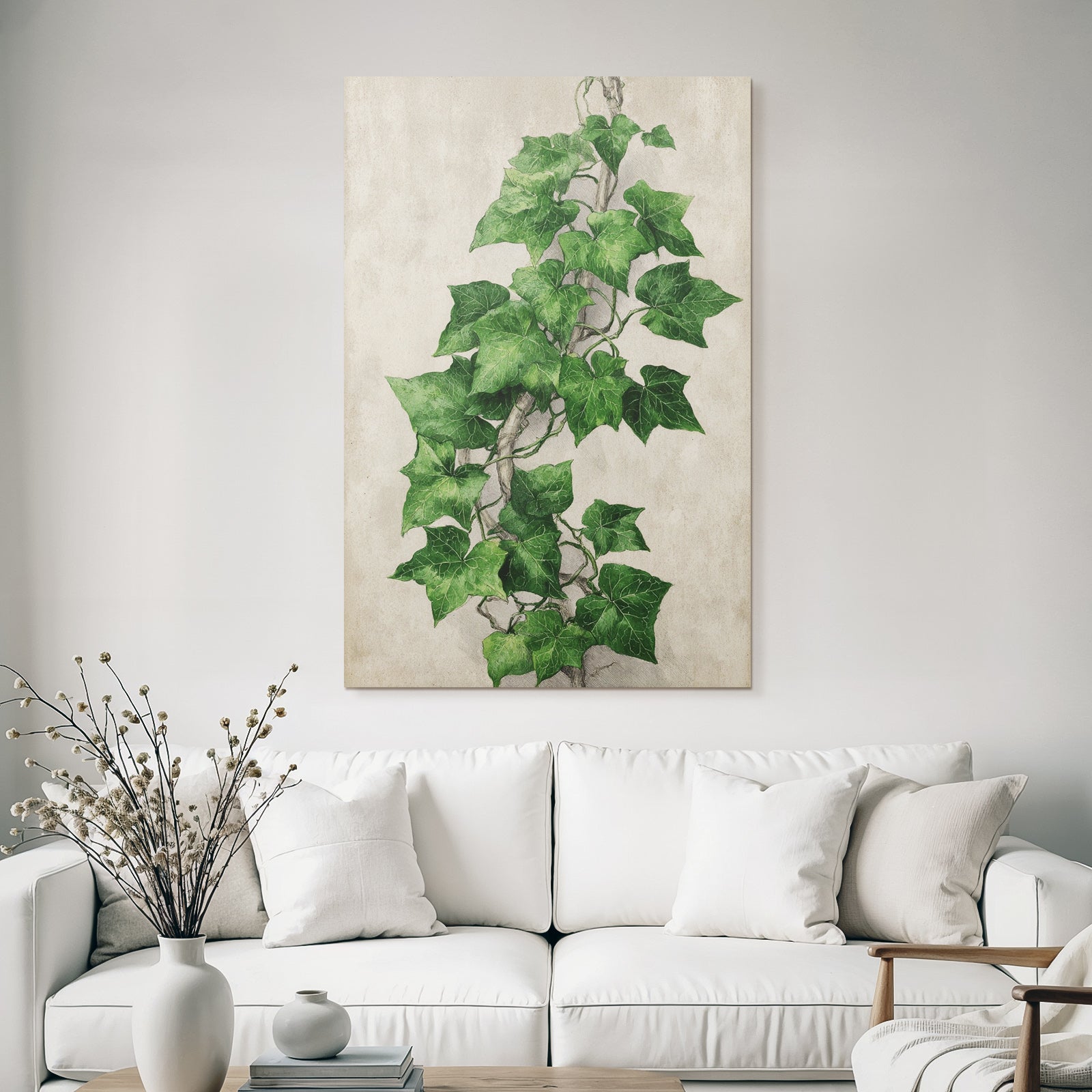 „Efeu Blattillustration Mit Lebhafter Grüner Rankenstruktur“ bringt den Stil Botanische Illustrationen an Deine Wand – perfekt für Schlafzimmer, Homeoffice oder Besprechungsräume, edel gerahmt im FameFrame.